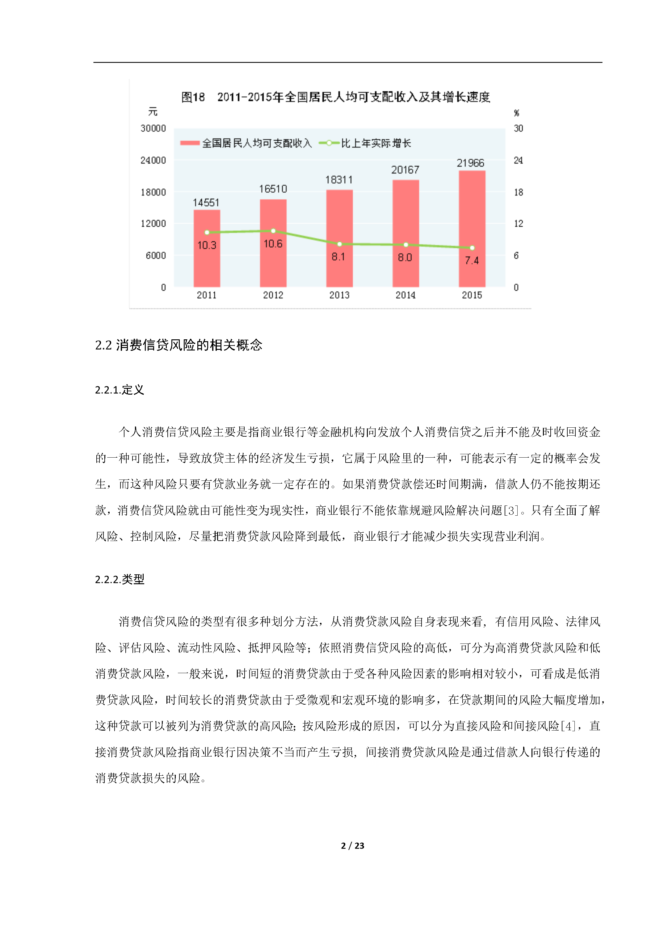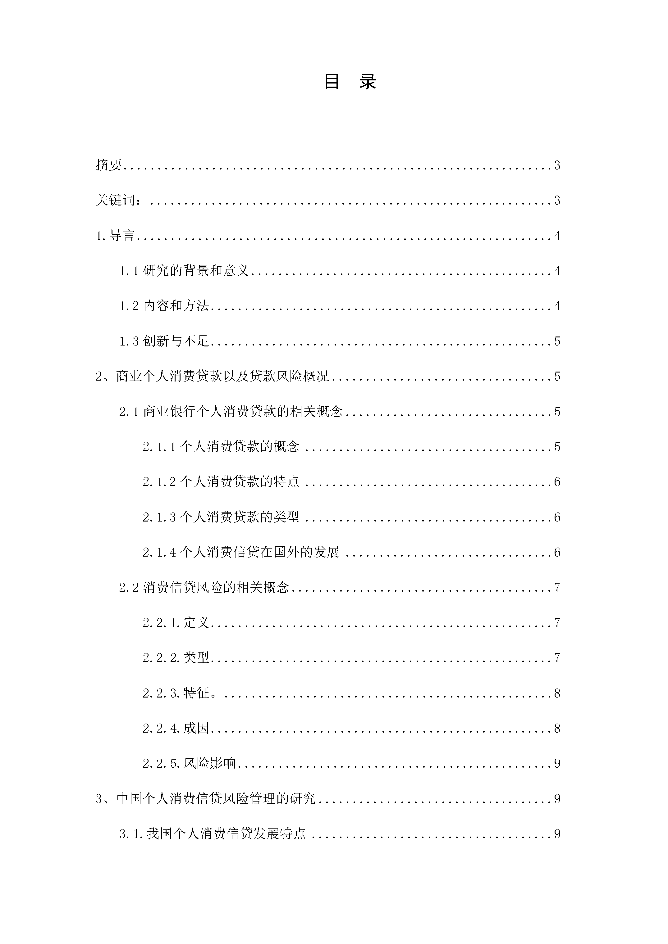2/23目录摘要3关键词:31.导言41.1研究的背景和意义41.2内容和方法41.3创新与不足52、商业个人消费贷款以及贷款风险概况52.1商业银行个人消费贷款的相关概念52.1.1个人消费贷款的概念52.1.2个人消费贷款的特点62.1.3个人消费贷款的类型62.1.4个人消费信贷在国外的发展62.2消费信贷风险的相关概念72.2.1.定义72.2.2.类型72.2.3.特征。82.2.4.成因82.2.5.风险影响93、中国个人消费信贷风险管理的研究93.1.我国个人消费信贷发展特点93.1.1起步