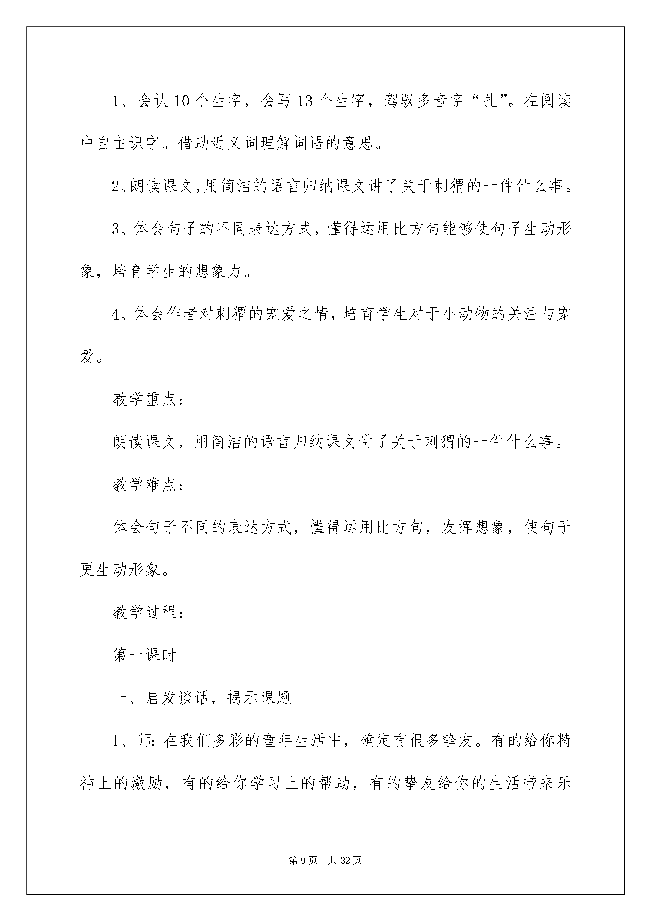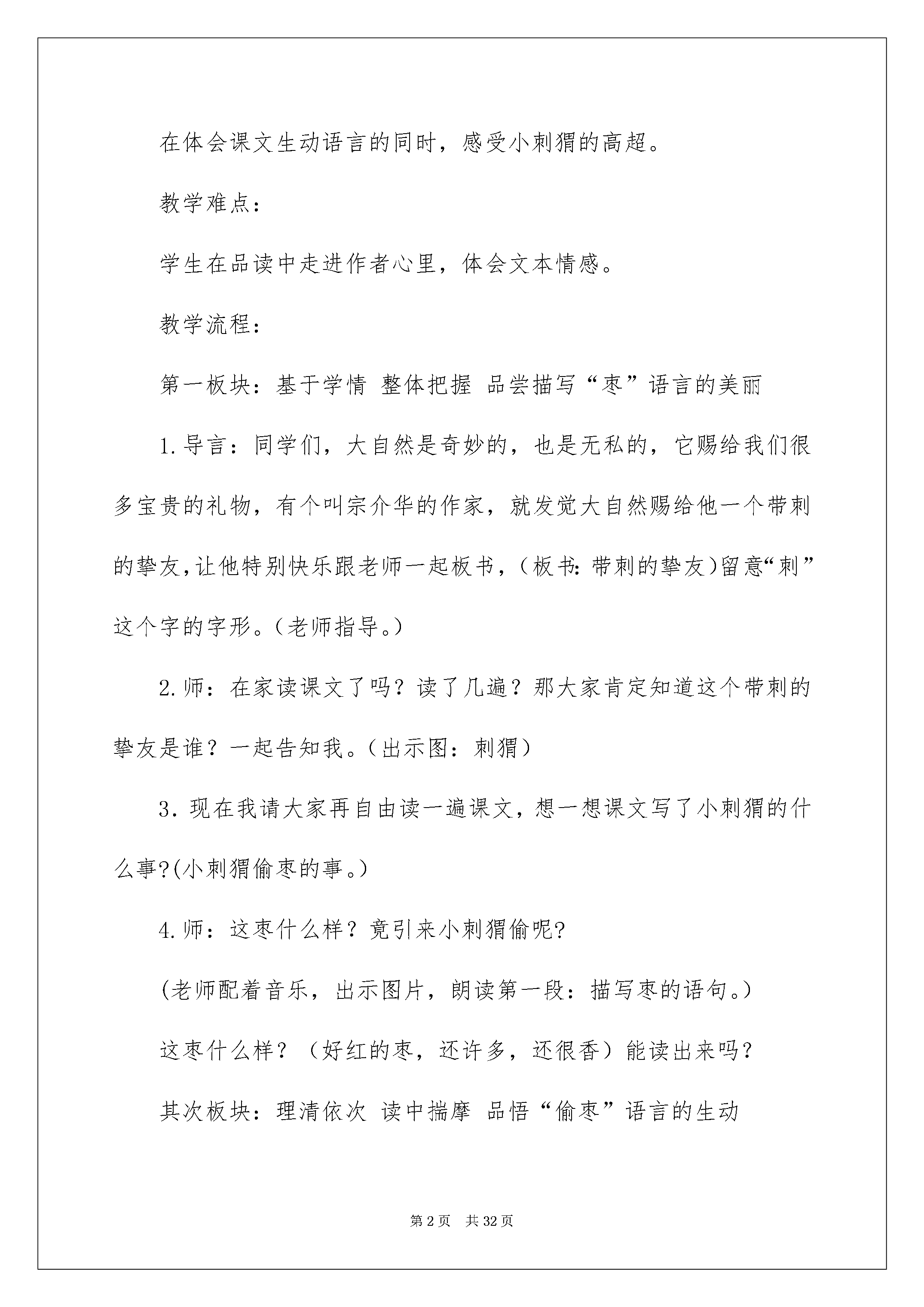 2022《带刺的朋友》教学设计《带刺的挚友》教学设计作为一名静默奉献的教化工作者,总不行避开地须要编写教学设计,教学设计一般包括教学目标、教学重难点、教学方法、教学步骤与时间安排等环节。优秀的教学设计都具备一些什么特点呢?以下是我为大家整理的《带刺的挚友》教学设计,仅供参考,希望能够帮助到大家。《带刺的挚友》教学设计1教学目标:1.朗读课文,体会课文