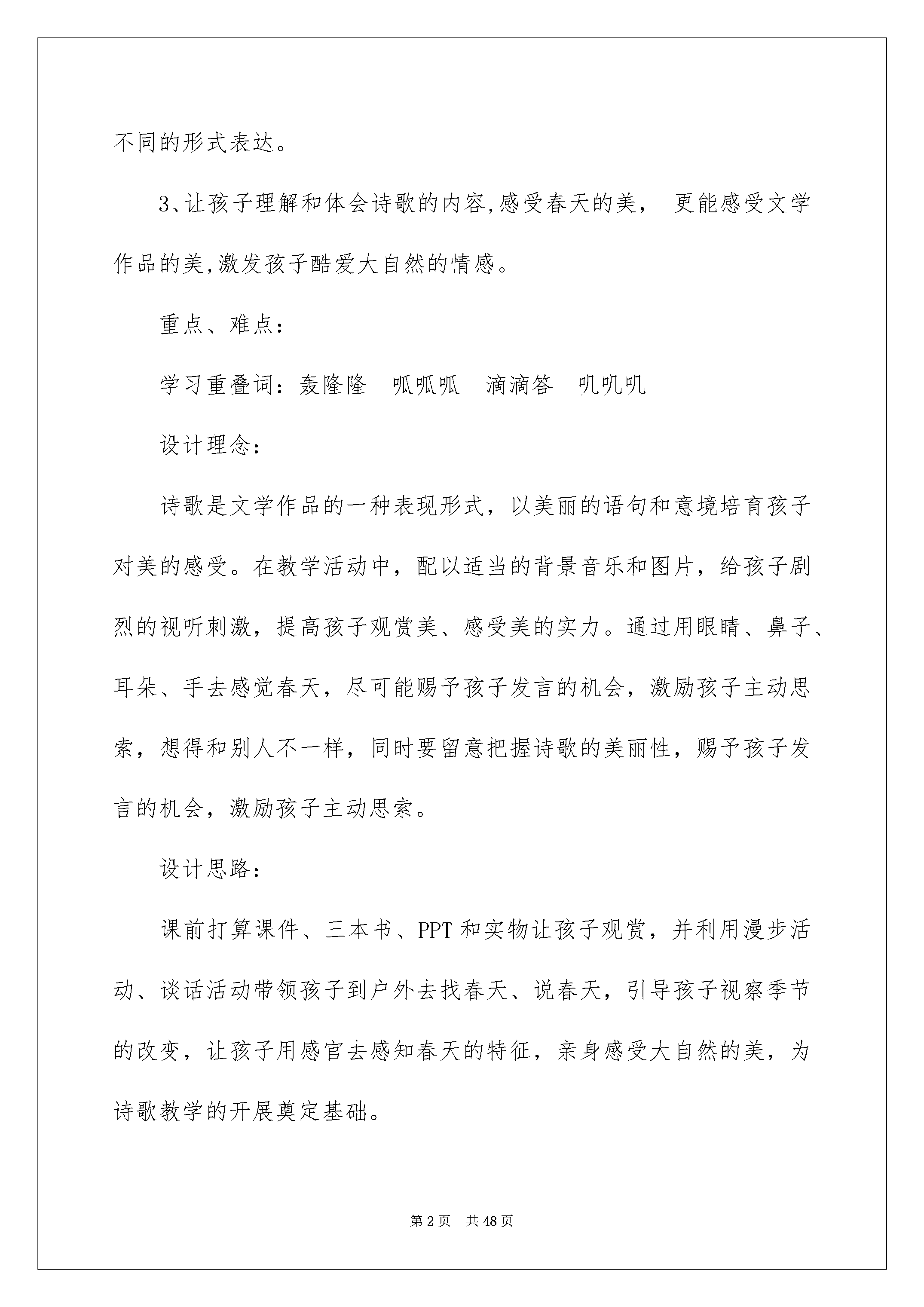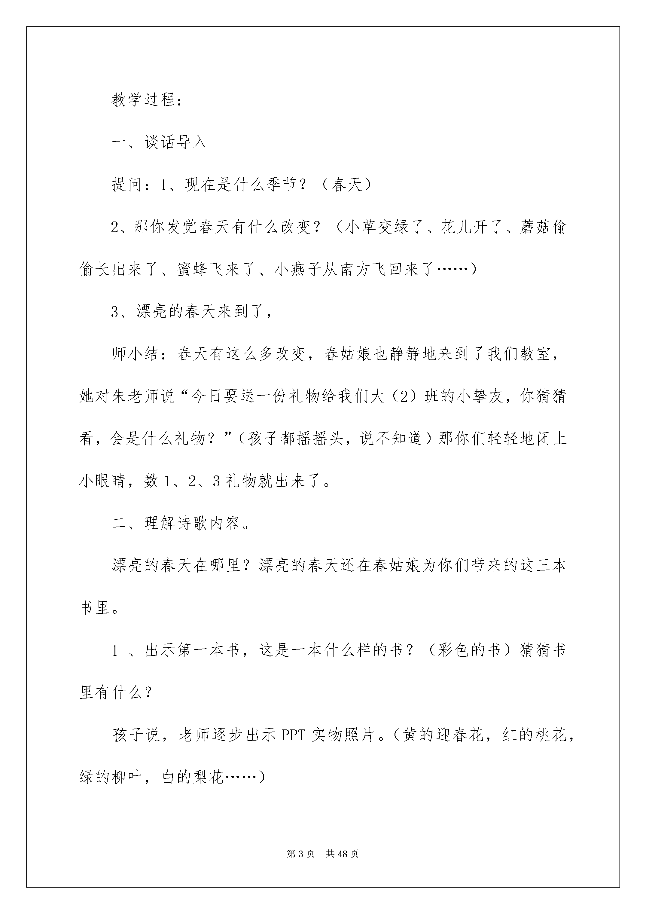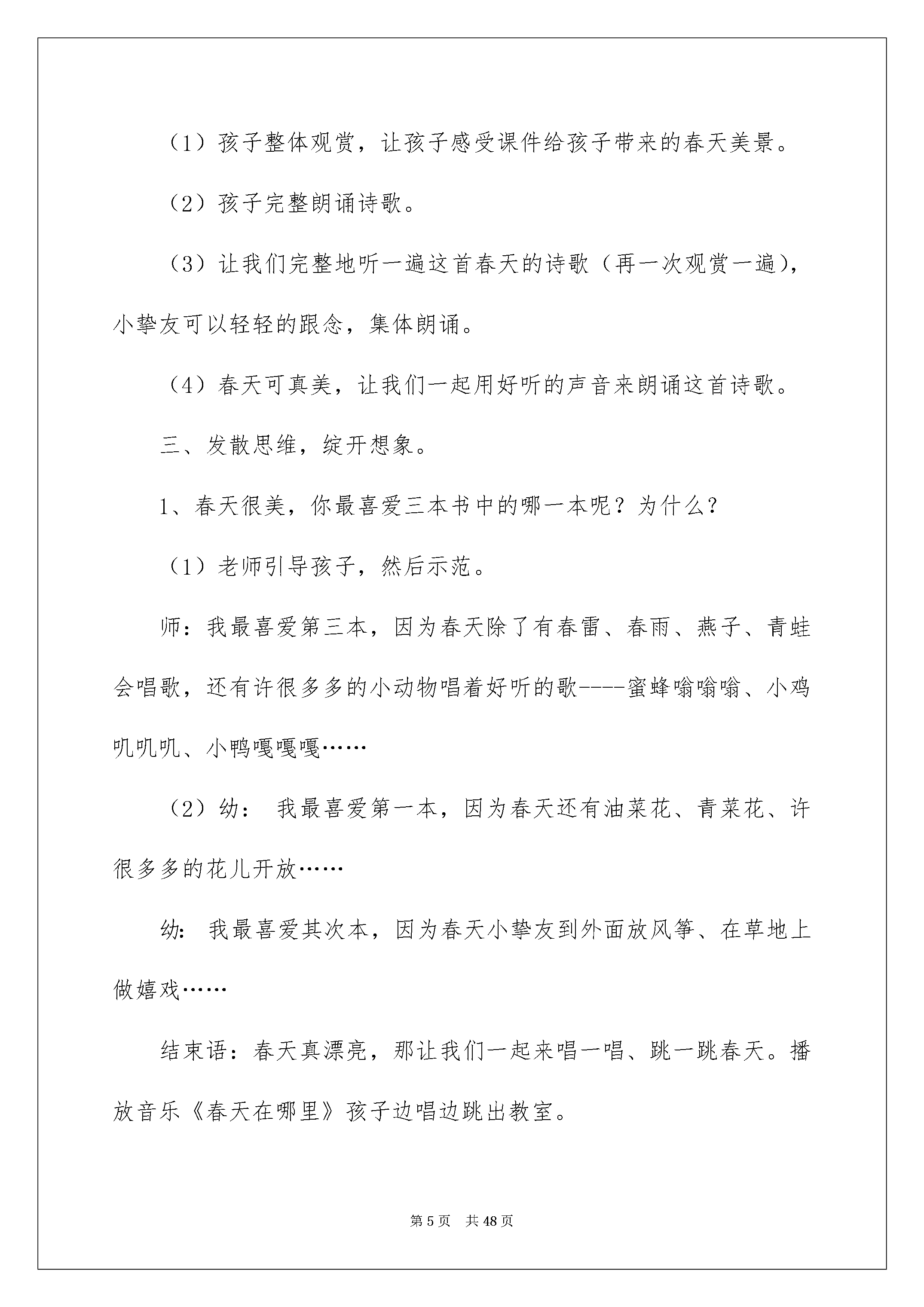 2022《春天》大班教案《春天》大班教案作为一名教学工作者,时常要开展教案打算工作,借助教案可以提高教学质量,收到预期的教学效果。怎样写教案才更能起到其作用呢?下面是我为大家收集的《春天》大班教案,希望能够帮助到大家。《春天》大班教案1教材简介:这首诗歌把春天的色调、形象、声音都描绘的绘声绘色,描绘出了自然界万物之间密切的联系,作品不仅画面感强,而