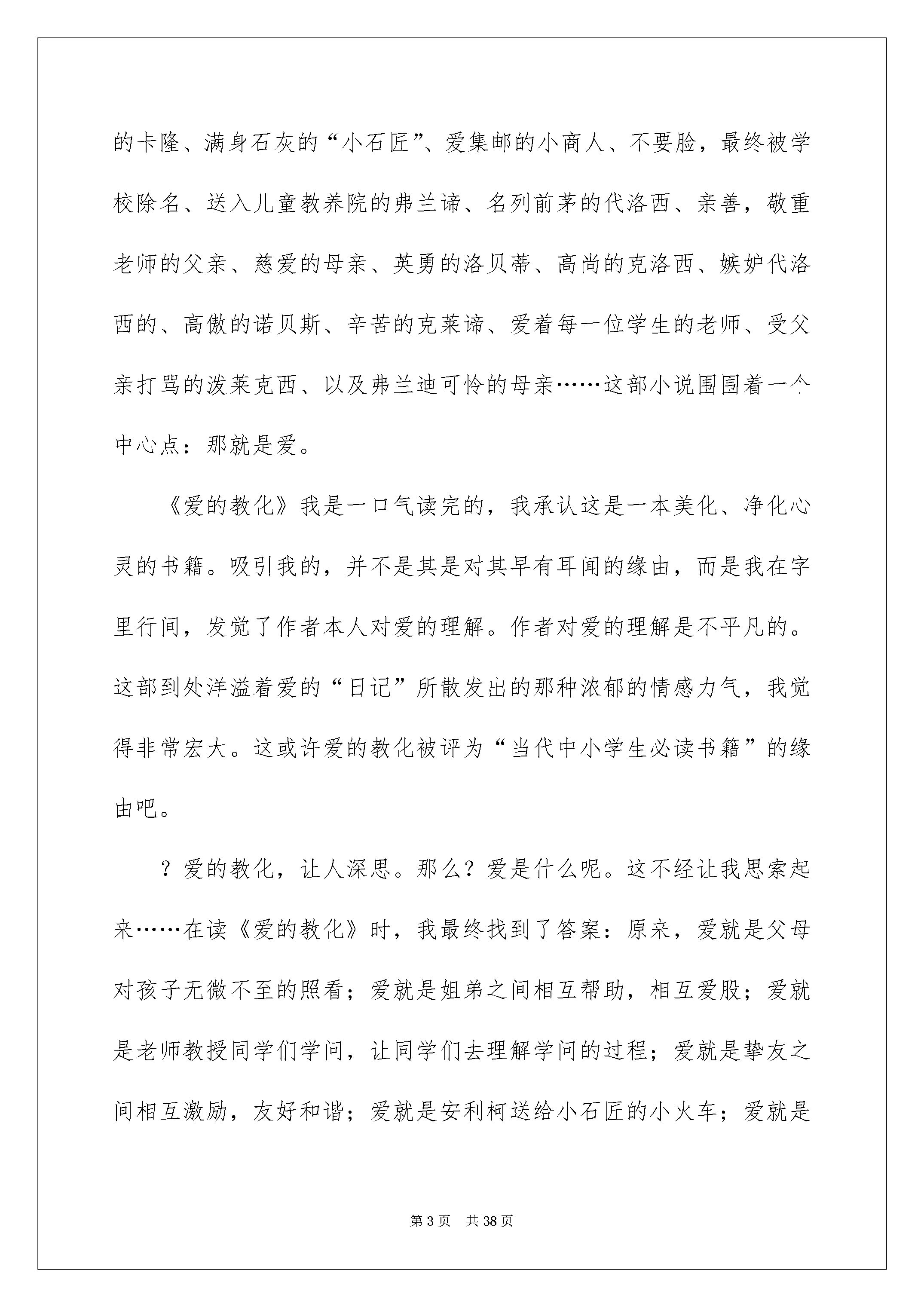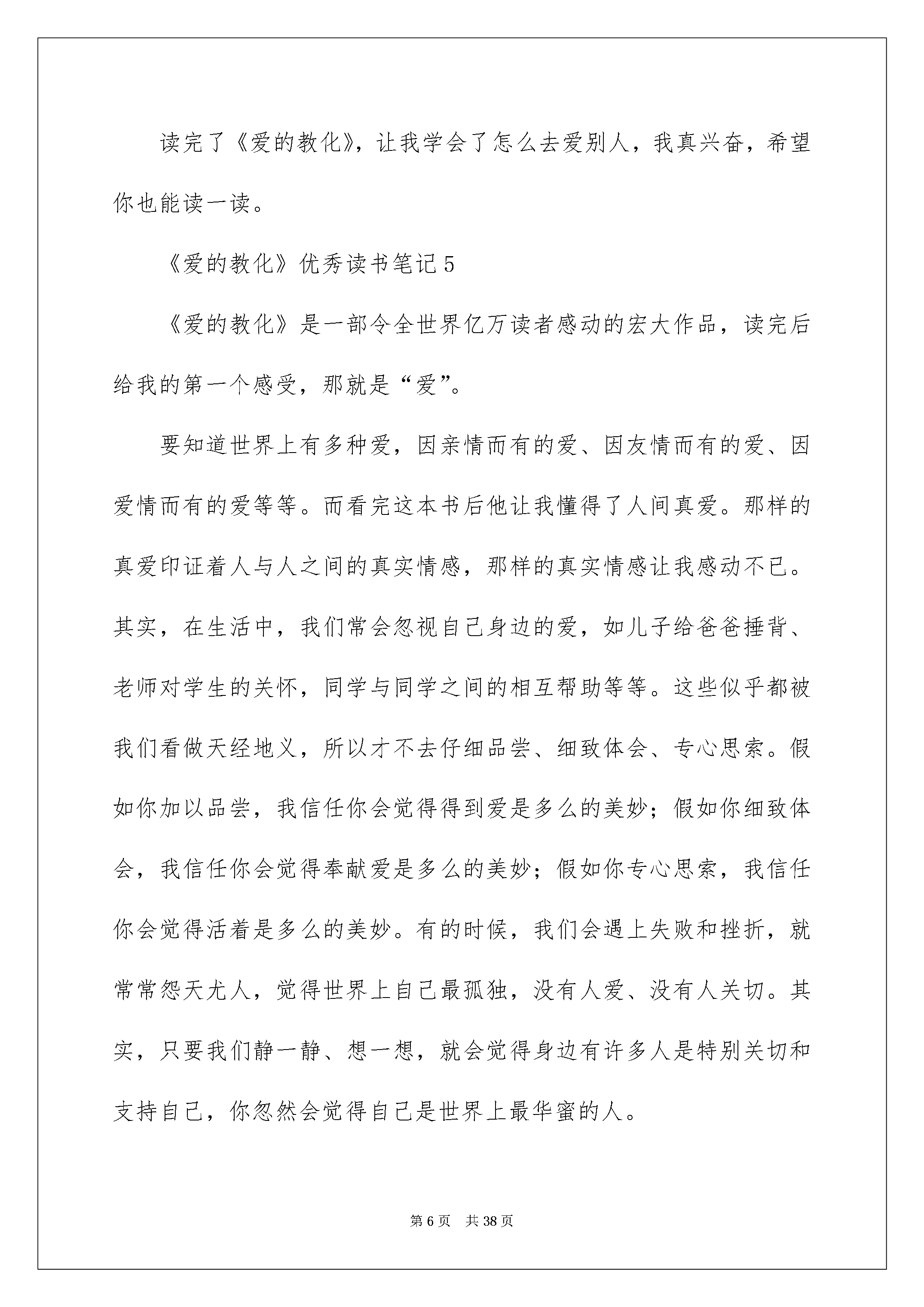 2022《爱的教育》优秀读书笔记《爱的教化》优秀读书笔记范文(精选20篇)当细细地品读完一本名著后,信任你心中会有不少感想,这时候,最关键的读书笔记怎么能落下!是不是无从下笔、没有头绪?以下是我为大家收集的《爱的教化》优秀读书笔记范文(精选20篇),仅供参考,欢迎大家阅读。《爱的教化》优秀读书笔记1早晨,阳光透过窗户静静地照进屋内,正好照在了书桌上的