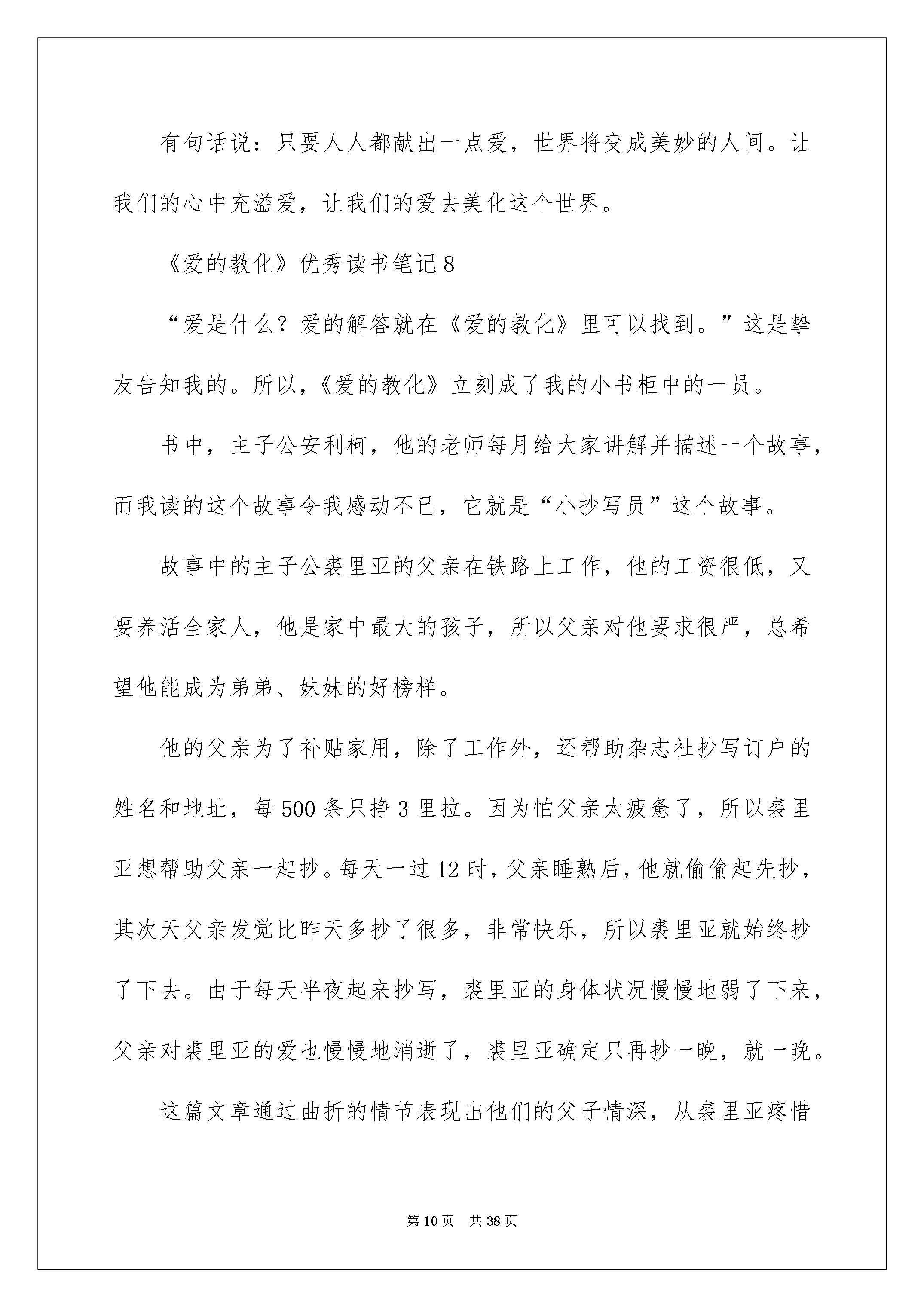 2022《爱的教育》优秀读书笔记《爱的教化》优秀读书笔记范文(精选20篇)当细细地品读完一本名著后,信任你心中会有不少感想,这时候,最关键的读书笔记怎么能落下!是不是无从下笔、没有头绪?以下是我为大家收集的《爱的教化》优秀读书笔记范文(精选20篇),仅供参考,欢迎大家阅读。《爱的教化》优秀读书笔记1早晨,阳光透过窗户静静地照进屋内,正好照在了书桌上