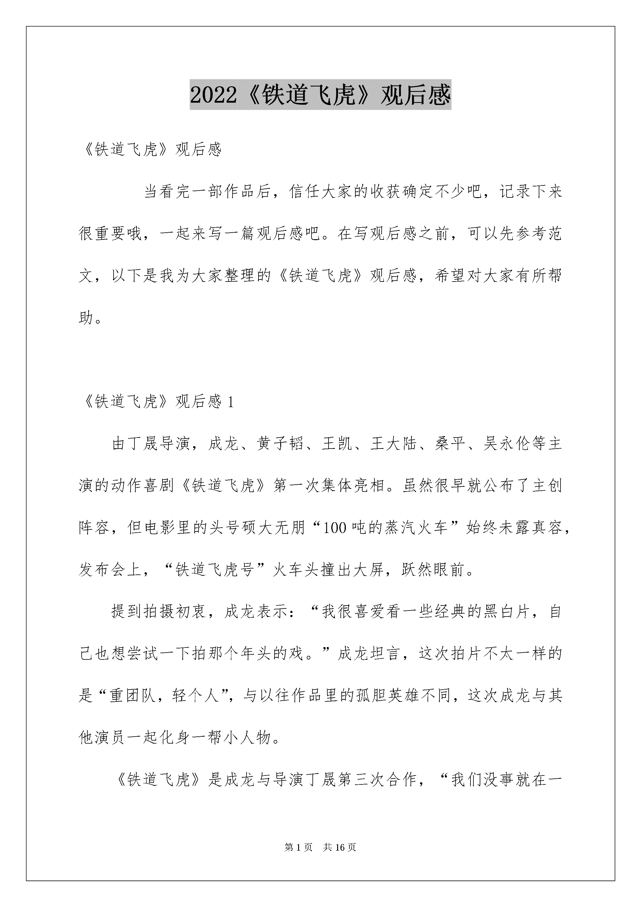 2022《铁道飞虎》观后感《铁道飞虎》观后感当看完一部作品后,信任大家的收获确定不少吧,记录下来很重要哦,一起来写一篇观后感吧。在写观后感之前,可以先参考范文,以下是我为大家整理的《铁道飞虎》观后感,希望对大家有所帮助。《铁道飞虎》观后感1由丁晟导演,成龙、黄子韬、王凯、王大陆、桑平、吴永伦等主演的动作喜剧《铁道飞虎》第一次集体亮相。虽然很早就公布了