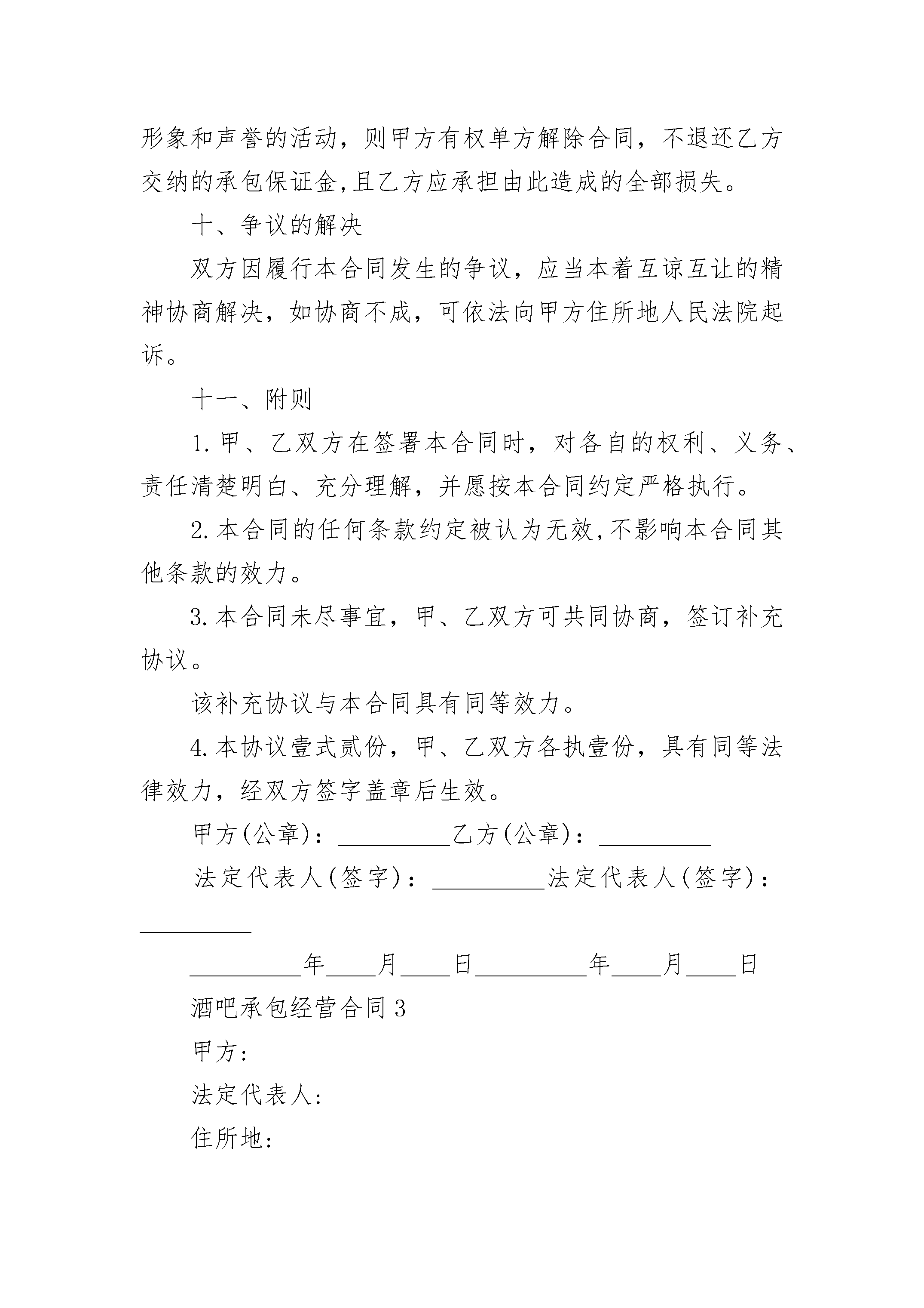 酒吧承包经营合同酒吧承包经营合同随着法律观念的深入人心,很多场合都离不了合同,签订合同也是避免争端的最好方式之一。那么大家知道合同的格式吗?下面是小编整理的酒吧承包经营合同,欢迎大家分享。酒吧承包经营合同1甲方(租赁方)乙方(承租方)经甲乙双方充分协商,就甲方所有的原酒吧,租赁给乙方经营,达成如下一致意见,并订立此合同。一、甲方所有的的原酒吧,位于__市号,营业面积__余平方米,含。二、租赁期限为__年(自__年__月__日起至__年__月__日止)。合同期满后,双方有意续约,另行协商签订合同。三、酒吧租