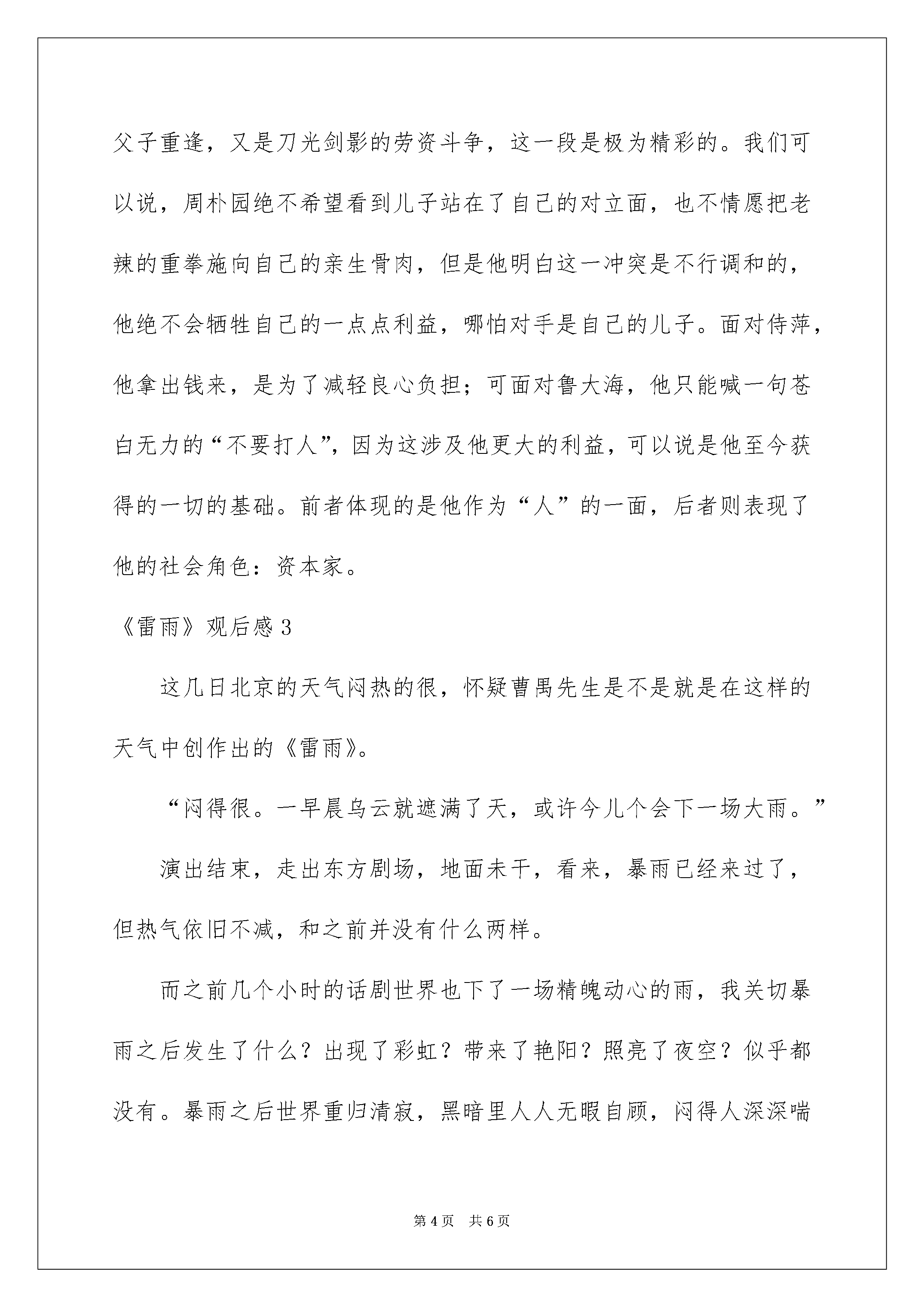 2022《雷雨》观后感《雷雨》观后感在看完一部作品以后能够给我们不少启示须要写一篇观后感好好地作记录了。那么我们如何去写观后感呢?下面是我帮大家整理的《雷雨》观后感供大家参考借鉴希望可以帮助到有须要的挚友。《雷雨》观后感1曹禺的《雷雨》不断被喻为“中国话剧创作第一次