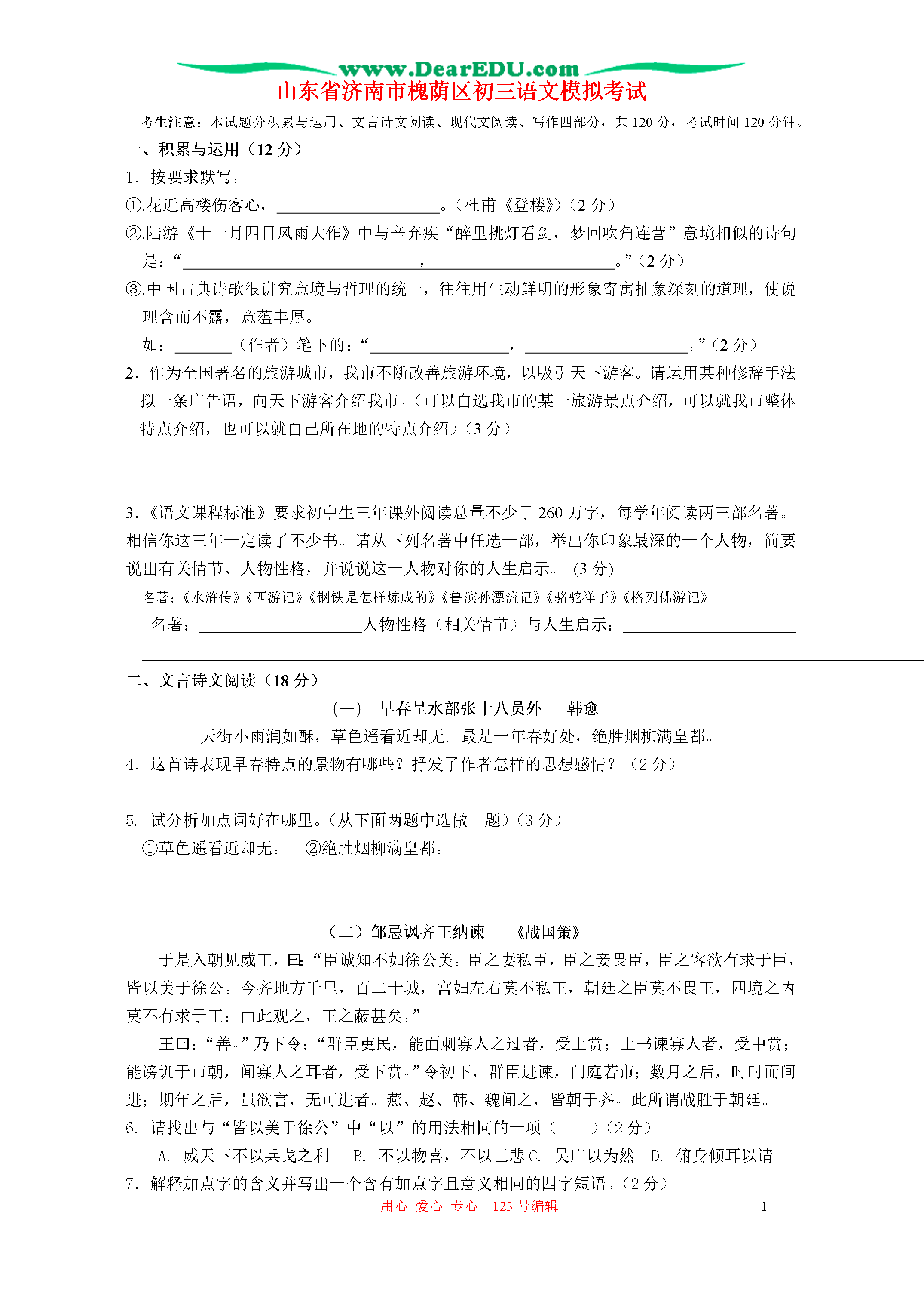用心爱心专心123号编辑1山东省济南市槐荫区初三语文模拟考试考生注意:本试题分积累与运用、文言诗文阅读、现代文阅读、写作四部分,共120分,考试时间120分钟。一、积累与运用(12分)1.按要求默写。①.花近高楼伤客心,。(杜甫《登楼》)(2分)②.陆游《十一月四日风雨大作》中与辛弃疾“醉里挑灯看剑,梦回吹角连营”意境相似的诗句是:“,。”(2分)③.中国古典诗歌很讲究意境与哲理的统一,往往用生动鲜明的形象寄寓抽象深刻的道理,使说理含而不露,意蕴丰厚。如:(作者)笔下的:“,。”(2分)2.作为全国著名的