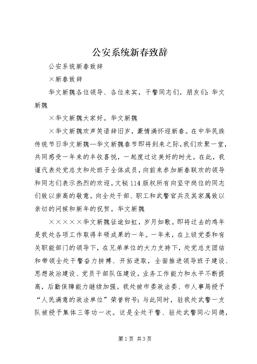 公安系统新春致辞×新春致辞华文新魏各位领导、各位来宾干警同志们朋友们:华文新魏×华文新魏大家好。华文新魏×华文新魏欢声笑语辞旧岁豪情满怀迎新春。在中华民族传统节日华文新魏—华文新魏春节即将到来之际我们欢聚一堂共同感受一年来的丰收喜悦一起度过这美好的时光。在此我谨代表处党总支和处班子全体成员向前来参加新春联欢的领导和同志们表示热烈的欢迎。向坚守岗位的同志们致以崇高的敬意。向全处干部、职工和武警官兵及其家属致以亲切的问候和新年的祝贺。华文新魏