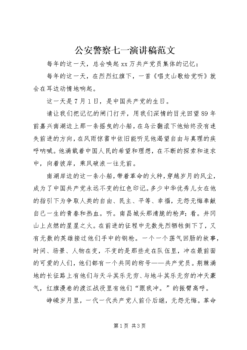 公安警察七一演讲稿范文每年的这一天总会唤起xx万共产党员集体的记忆;每年的这一天在烈烈红旗下一首《唱支山歌给党听》就会在耳边动情地响起。这一天是7月1日是中国共产党的生日。请让我们把记忆的闸门打开用我们深情的目光回望89年前嘉兴南湖边上那一条摇曳的小船在乌云翻滚下他始终没有迷失前进的方向在风雨惊雷中依旧能听见他渴望自由与真理的疾呼呐喊。他满载着中国人民的希望和理想在不断的探索和追求中向着彼岸乘风破浪一往无前。南湖岸边的这一条小船带着革命的火种穿