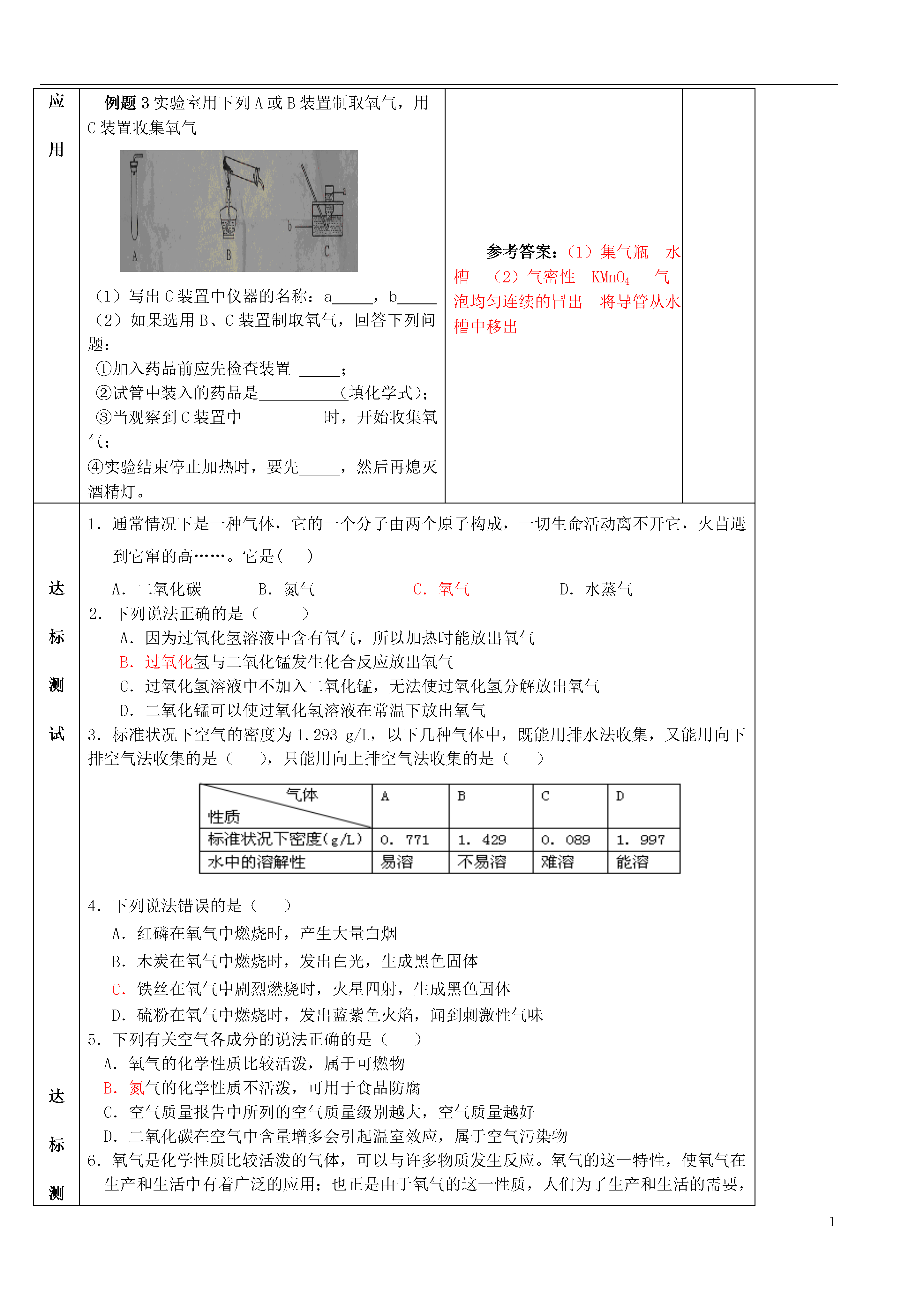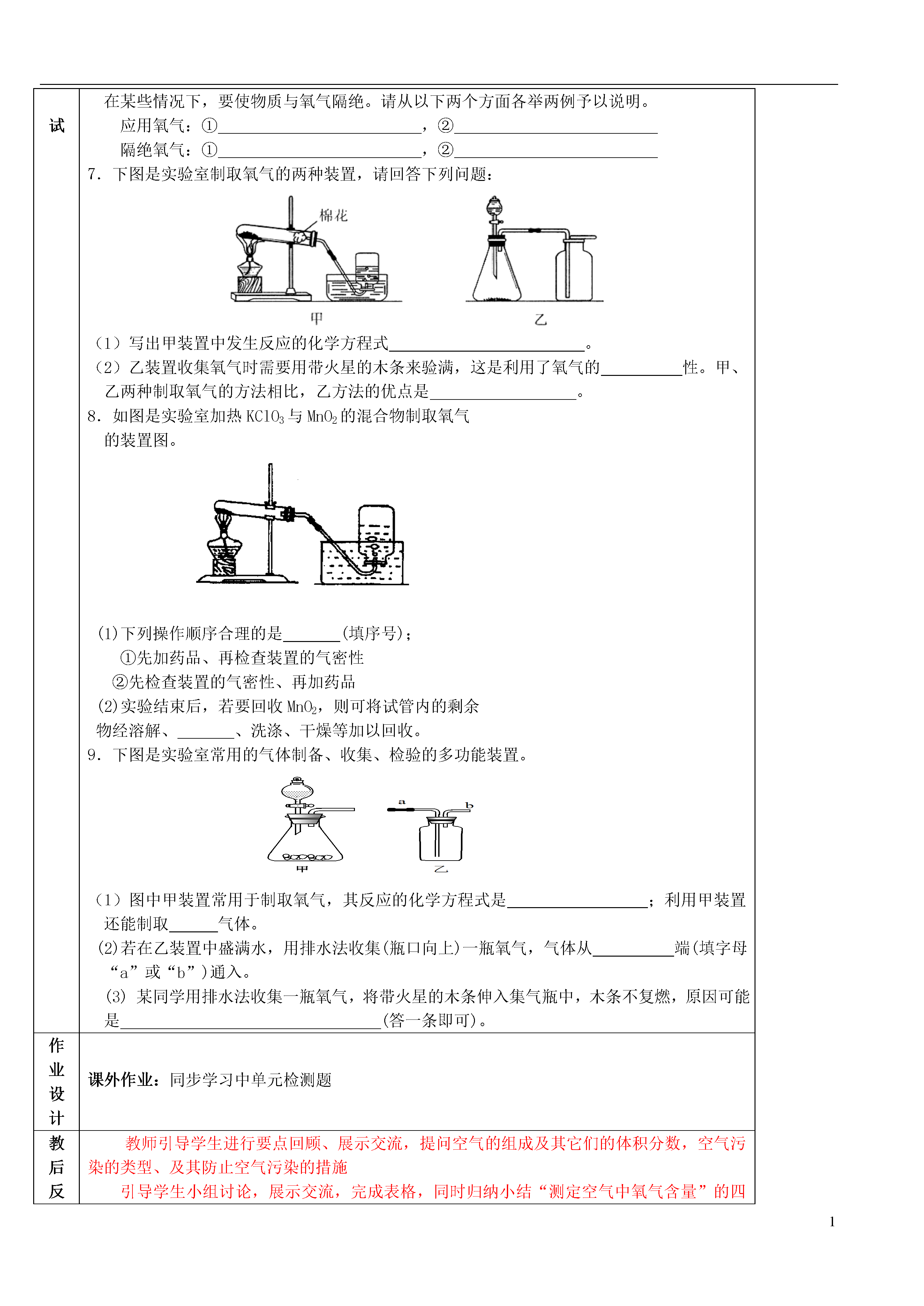 1课题第二单元我们周围的空气课型复习编写集体研讨时间月日使用修改时间月日教学目标知识与技能1.进一步了解空气的成分、空气污染的危害和防治。2.了解氧气的物理性质和工业制法,掌握氧气的化学性质和实验室制法。3.加深对纯净物、混合物、化合反应、分解反应、氧化反应、催化剂、催化作用等概念的理解。过程与方法1.通过对本单元网络的整理和形成,培养学生分析和归纳能力。2.通过交流、讨论、展示知识网络,培养学生合作意识和表达能力。3.通过点拨、激励,培养学生分析问题、解决问题的能力。情感态