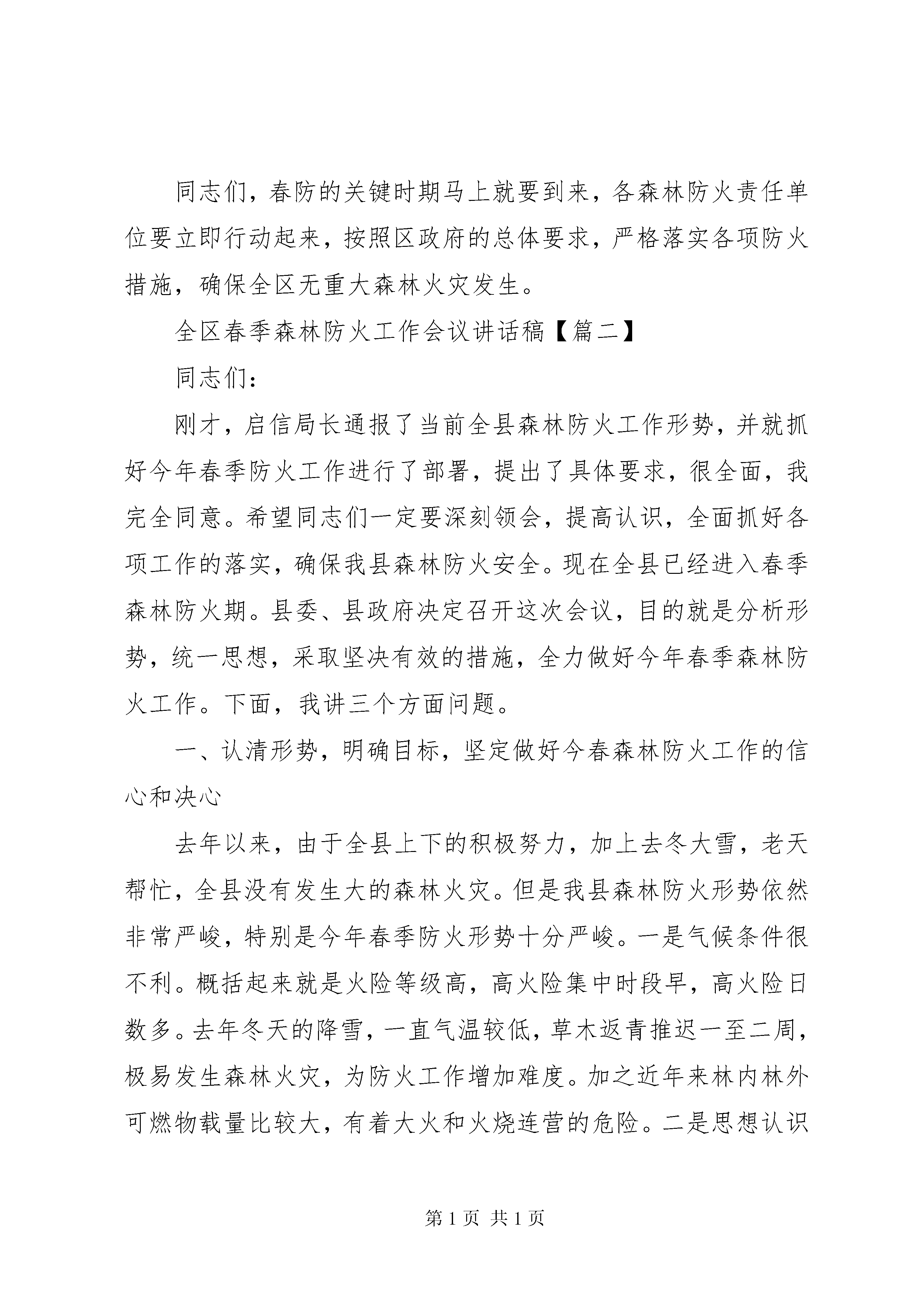 全区春季森林防火工作会议讲话稿全区春季森林防火工作会议讲话稿在不断进步的时代,各种讲话稿频频出现,讲话稿可以起到整理讲话者的思路、控制时间的作用。相信很多朋友都对写讲话稿感到非常苦恼吧,以下是小编帮大家整理的全区春季森林防火工作会议讲话稿,欢迎大家分享。全区春季森林防火工作会议讲话稿1同志们:今天是3月15日,20xx年度春防头一天,我们共同迎来了新一轮的春防攻坚战。刚才,大会对10个先进集体和30名先进个人进行了表彰,这是对上年度森防工作的总结和表彰,同时也拉开了今年春防攻坚战的帷幕。希望大家向受表彰的