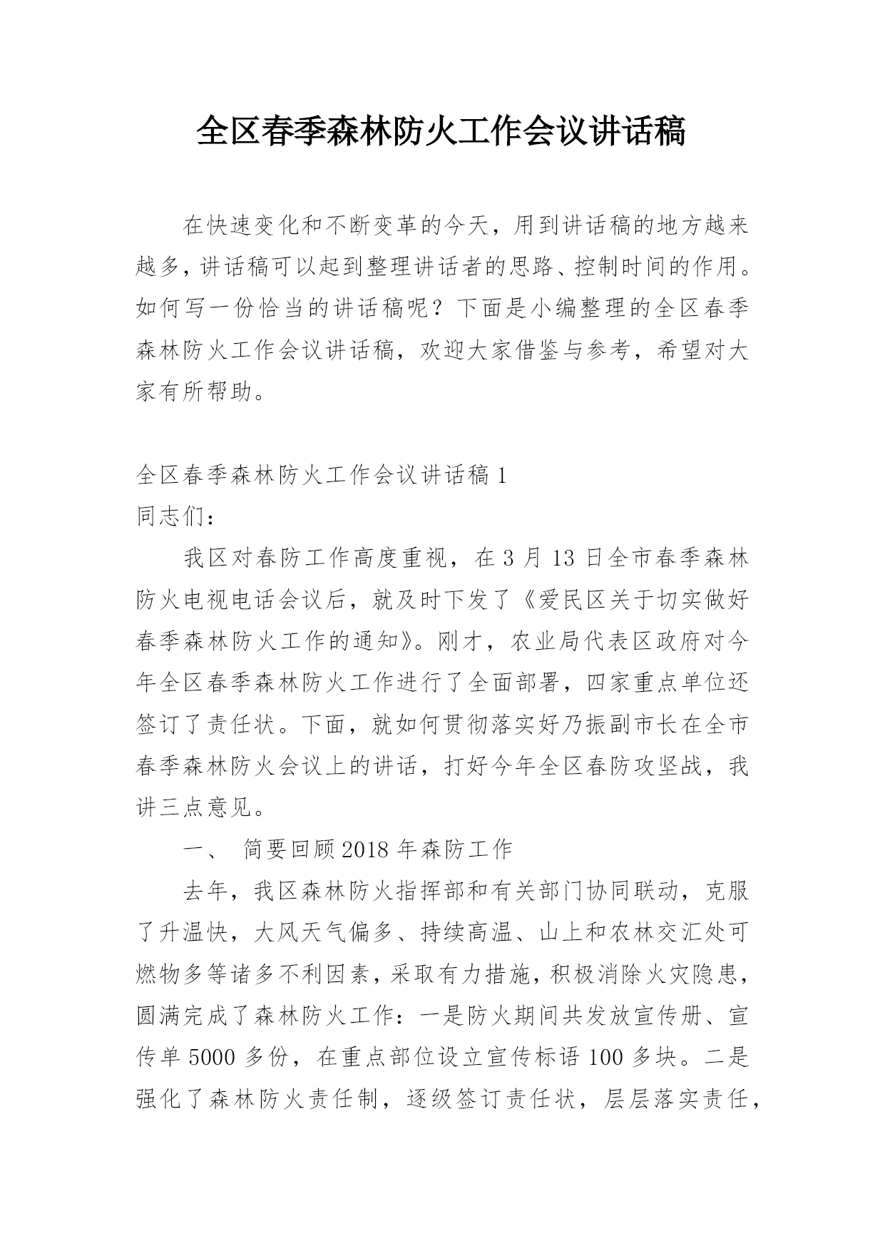 全区春季森林防火工作会议讲话稿在快速变化和不断变革的今天,用到讲话稿的地方越来越多,讲话稿可以起到整理讲话者的思路、控制时间的作用。如何写一份恰当的讲话稿呢?下面是小编整理的全区春季森林防火工作会议讲话稿,欢迎大家借鉴与参考,希望对大家有所帮助。全区春季森林防火工作会议讲话稿1同志们:我区对春防工作高度重视,在3月13日全市春季森林防火电视电话会议后,就及时下发了《爱民区关于切实做好春季森林防火工作的通知》。刚才,农业局代表区政府对今年全区春季森林防火工作进行了全面部署,四家重点单位还签订了责任状。下面,