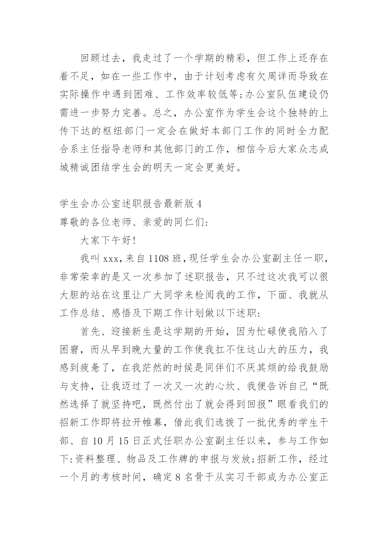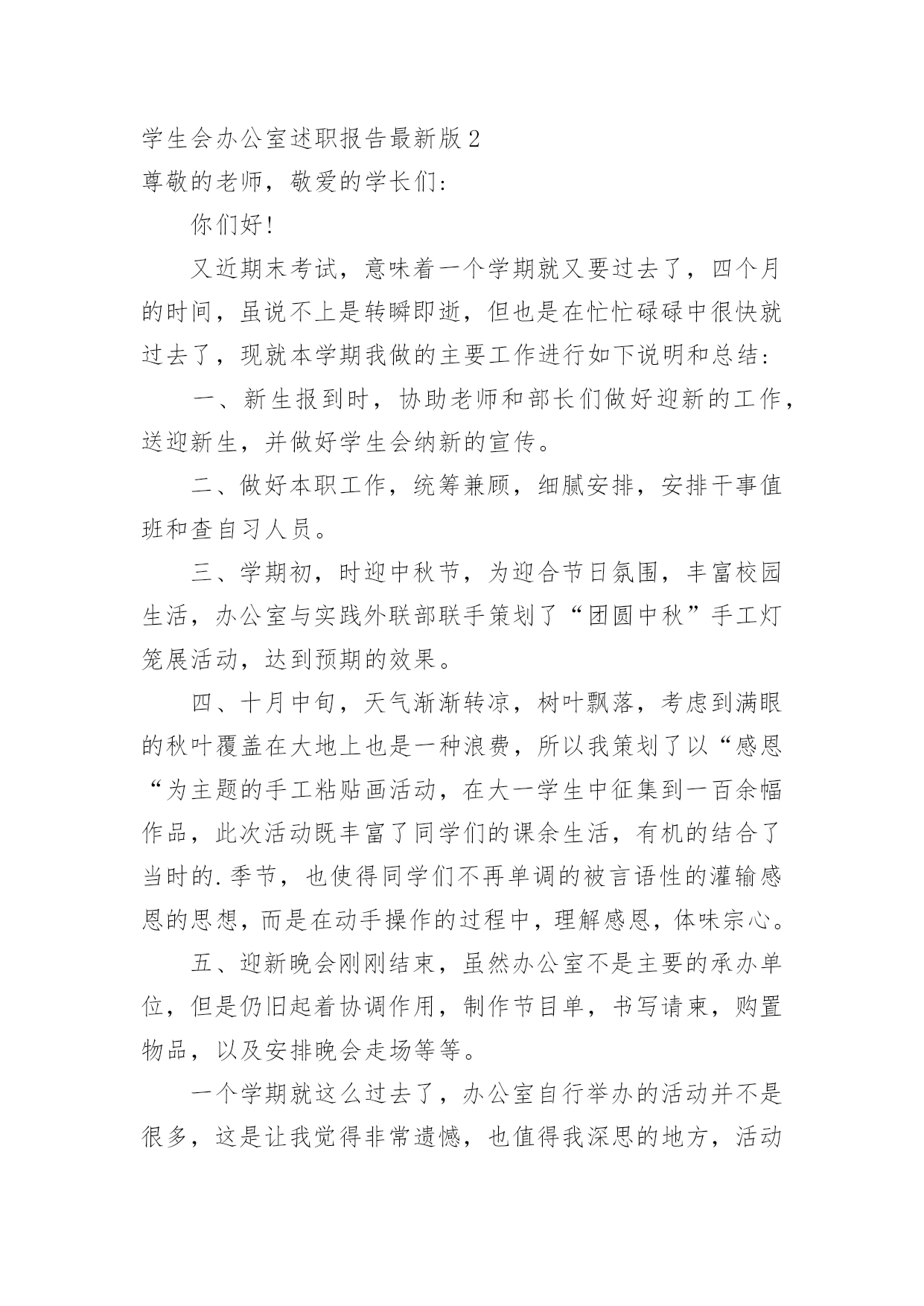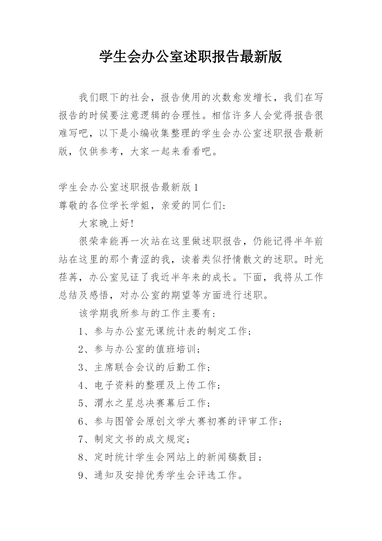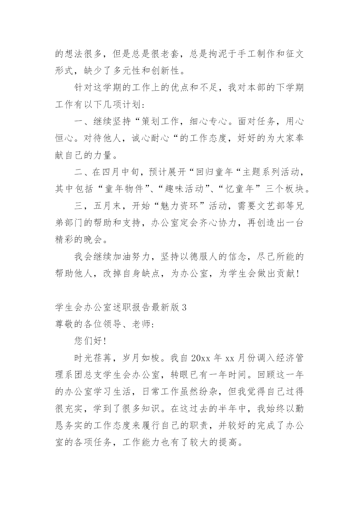 学生会办公室述职报告最新版学生会办公室述职报告最新版我们眼下的社会,报告使用的次数愈发增长,我们在写报告的时候要注意逻辑的合理性。相信许多人会觉得报告很难写吧,以下是小编收集整理的学生会办公室述职报告最新版,仅供参考,大家一起来看看吧。学生会办公室述职报告最新版1尊敬的各位学长学姐,亲爱的同仁们:大家晚上好!很荣幸能再一次站在这里做述职报告,仍能记得半年前站在这里的那个青涩的我,读着类似抒情散文的述职。时光荏苒,办公室见证了我近半年来的成长。下面,我将从工作总结及感悟,对办公室的期望等方面进行述职。该学期