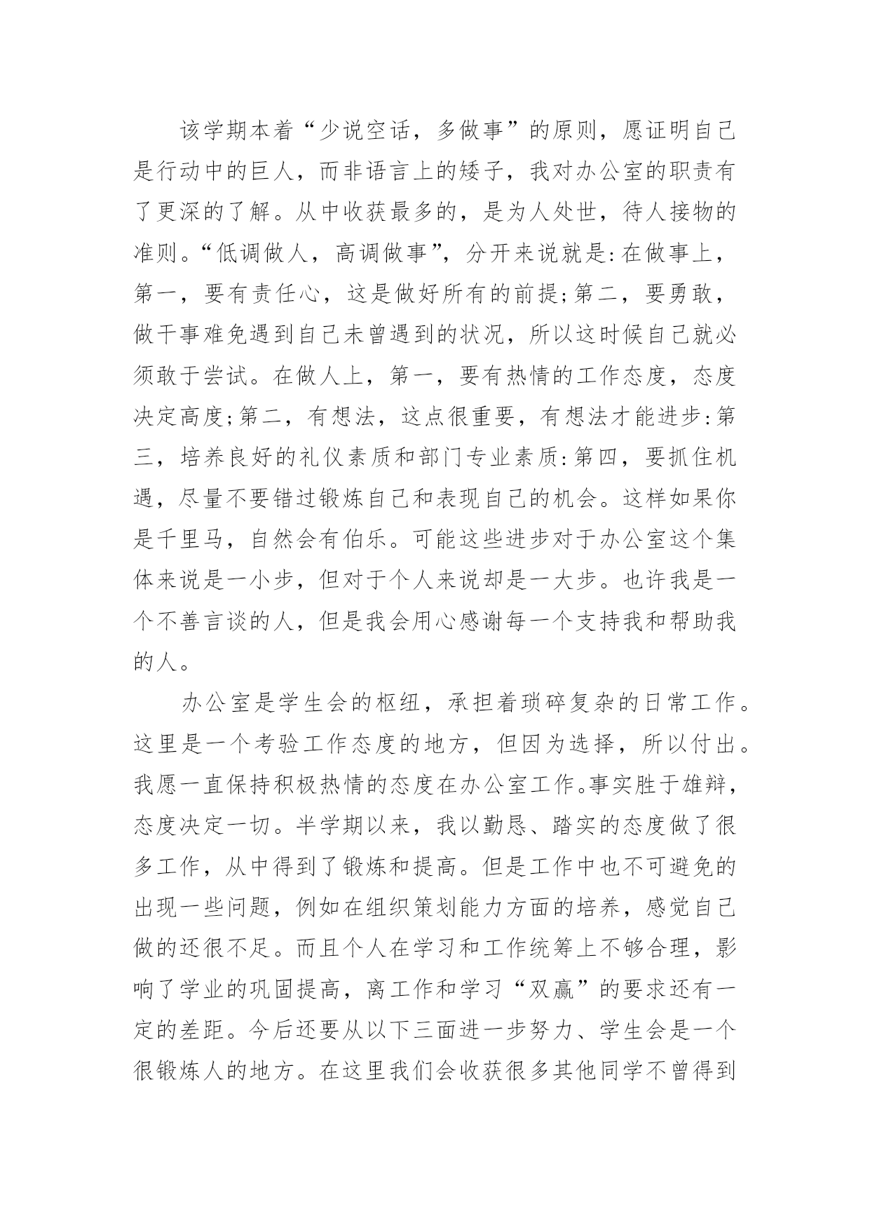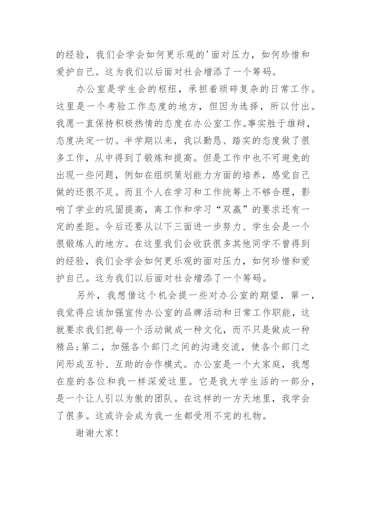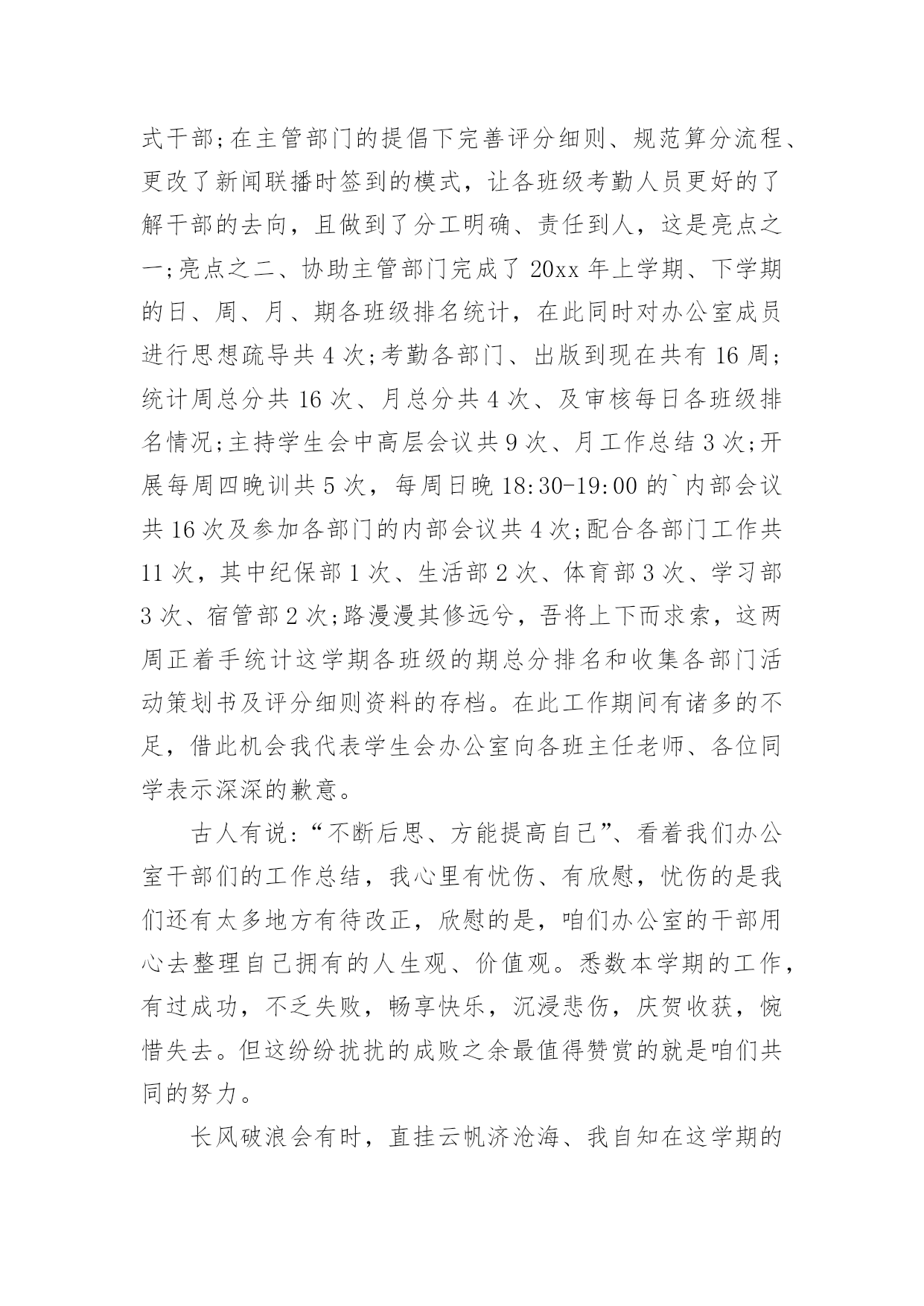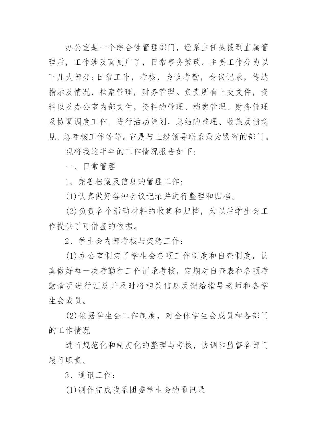 学生会办公室述职报告最新版学生会办公室述职报告最新版我们眼下的社会,报告使用的次数愈发增长,我们在写报告的时候要注意逻辑的合理性。相信许多人会觉得报告很难写吧,以下是小编收集整理的学生会办公室述职报告最新版,仅供参考,大家一起来看看吧。学生会办公室述职报告最新版1尊敬的各位学长学姐,亲爱的同仁们:大家晚上好!很荣幸能再一次站在这里做述职报告,仍能记得半年前站在这里的那个青涩的我,读着类似抒情散文的述职。时光荏苒,办公室见证了我近半年来的成长。下面,我将从工作总结及感悟,对办公室的期望等方面进行述职。该学期