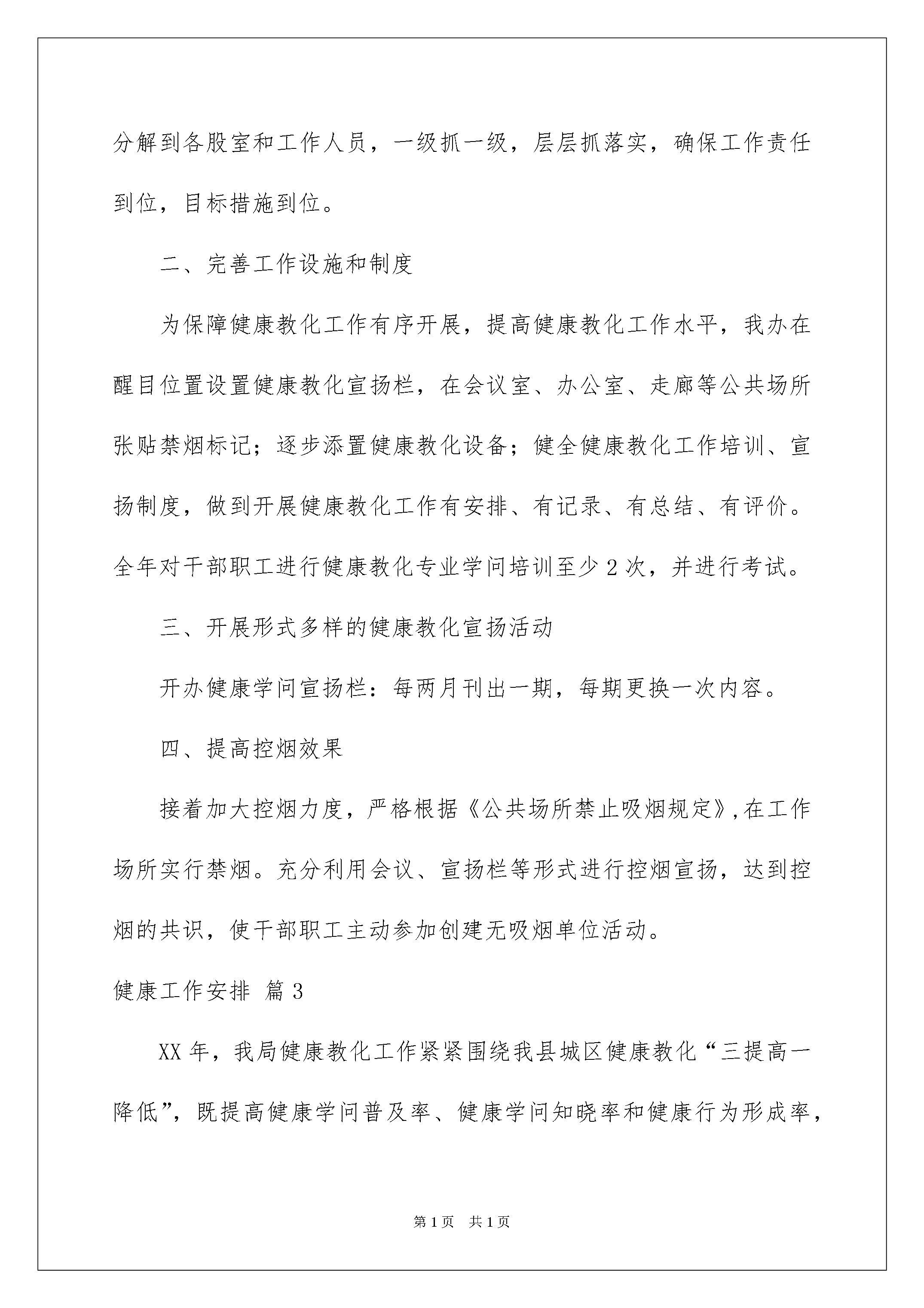 2022健康工作计划健康工作安排4篇日子在弹指一挥间就毫无声息的消逝,我们的工作又迈入新的阶段,此时此刻须要制定一个具体的安排了。想学习拟定安排却不知道该请教谁?下面是我帮大家整理的健康工作安排4篇,欢迎大家共享。健康工作安排篇1为了更好地促进学生健康成长,推动素养教化,贯彻教化部颁发的《中小学心理健康教化指导纲要》,本学期我校心理健康教化工作安排