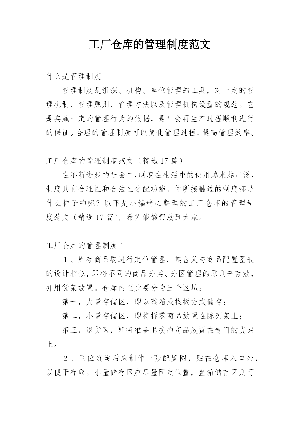 工厂仓库的管理制度范文什么是管理制度管理制度是组织、机构、单位管理的工具,对一定的管理机制、管理原则、管理方法以及管理机构设置的规范。它是实施一定的管理行为的依据,是社会再生产过程顺利进行的保证。合理的管理制度可以简化管理过程,提高管理效率。工厂仓库的管理制度范文(精选17篇)在不断进步的社会中,制度在生活中的使用越来越广泛,制度具有合理性和合法性分配功能。你所接触过的制度都是什么样子的呢?以下是小编精心整理的工厂仓库的管理制度范文(精选17篇),希望能够帮助到大家。工厂仓库的管理制度11、库存商品要进行
