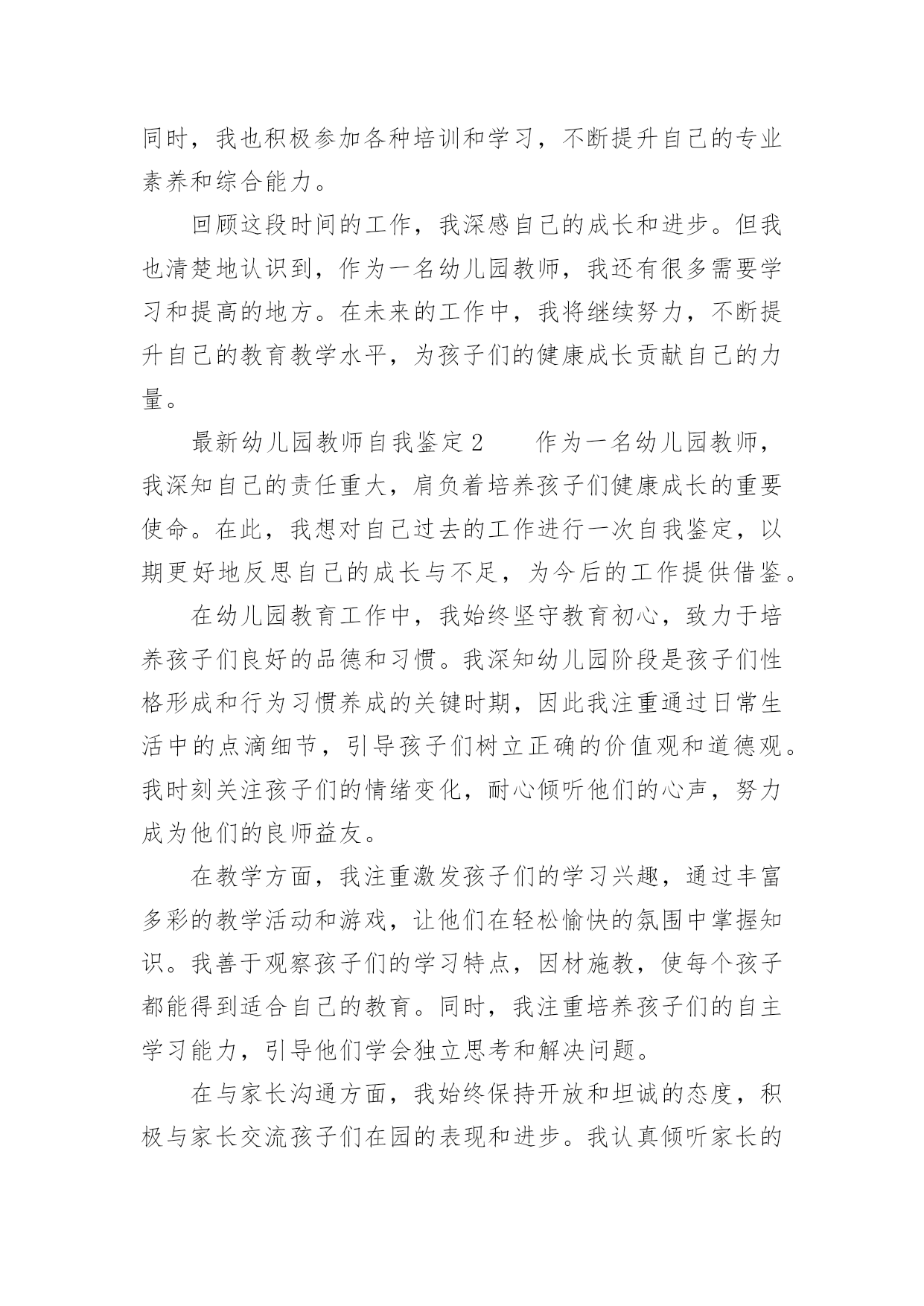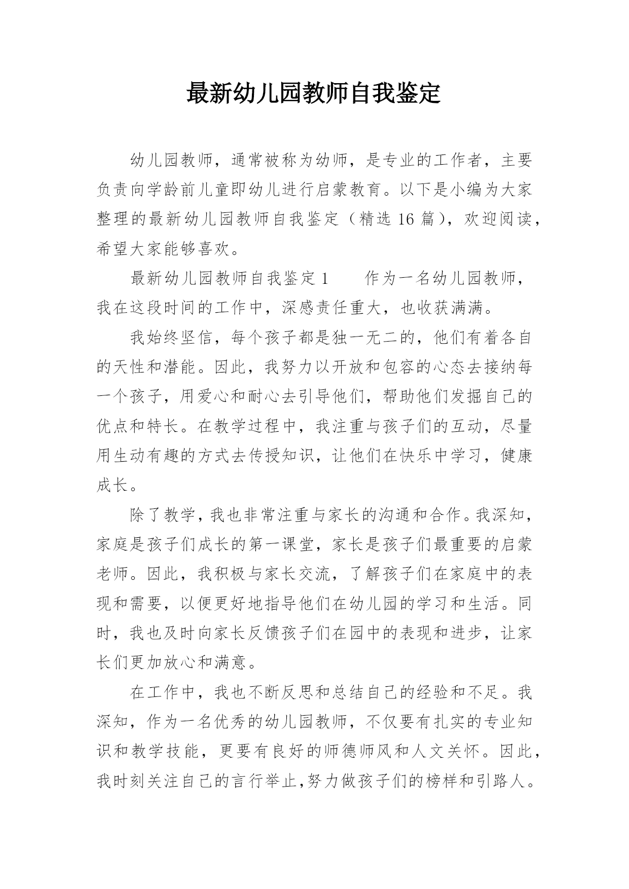 最新幼儿园教师的自我鉴定一般来说,自我鉴定即是自我总结,它能够头脑更加清醒,目标更加明确,不妨让我们用心总结,认真完成自我鉴定吧。那么我们该怎么去写自我鉴定呢?以下是小编精心整理的最新幼儿园教师的自我鉴定,欢迎阅读,希望大家能够喜欢。最新幼儿园教师的自我鉴定1转眼间,一个学年的教育教学工作已经结束了。这一个学年以来,我们不断学习,不断进步,逐渐走上了工作岗位。这个学年以来,我们以园里指定的方针、政策为指导,依照园里的工作要求,以深化教育改革,优化教学活动为中心,认真学习领会园里指导思想,转变教育观念,坚持