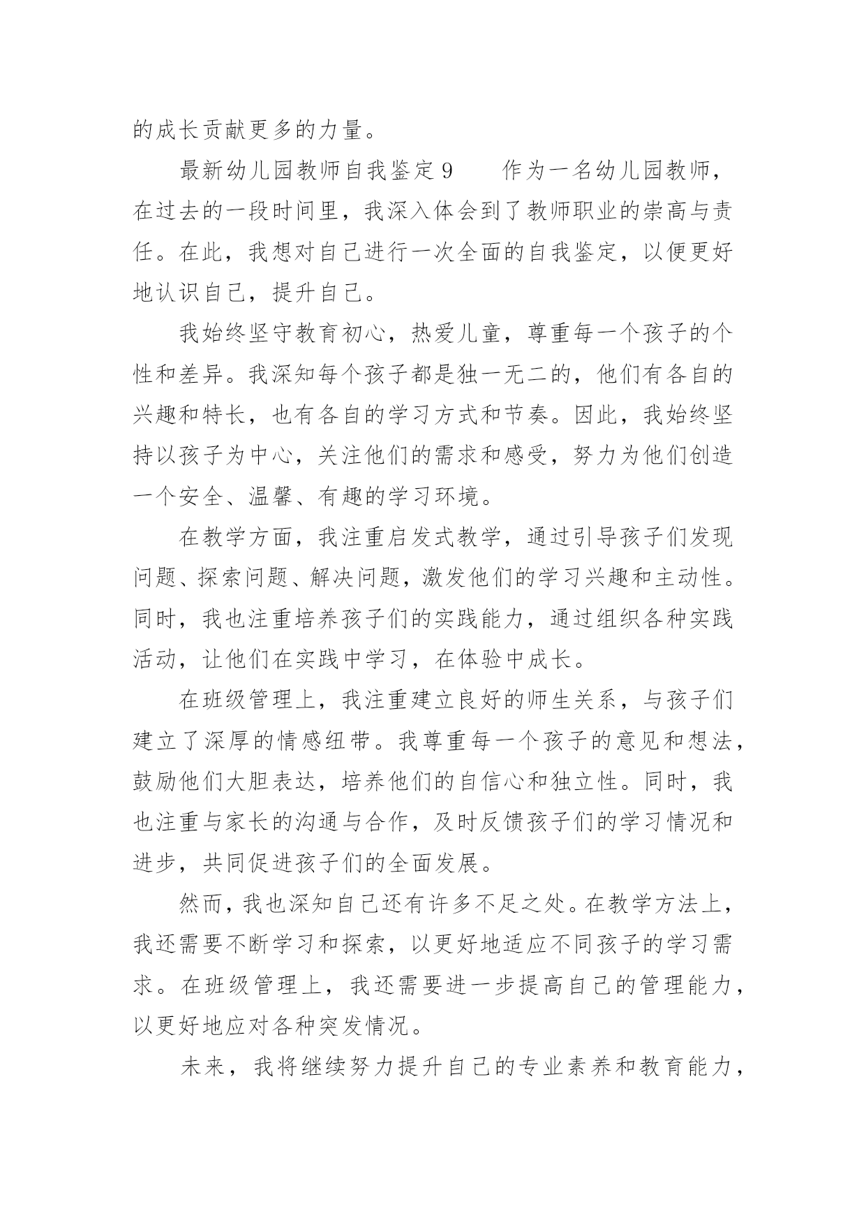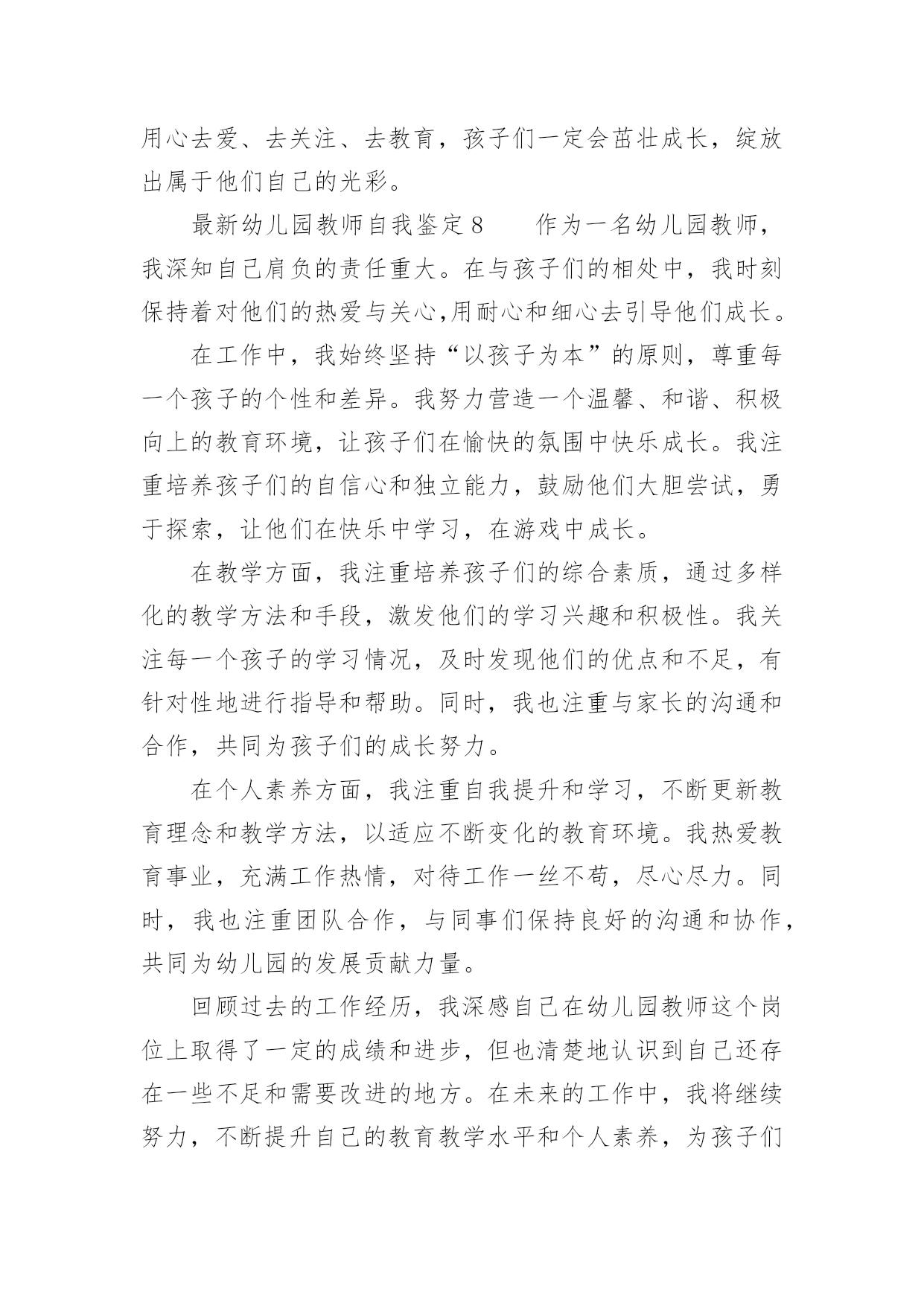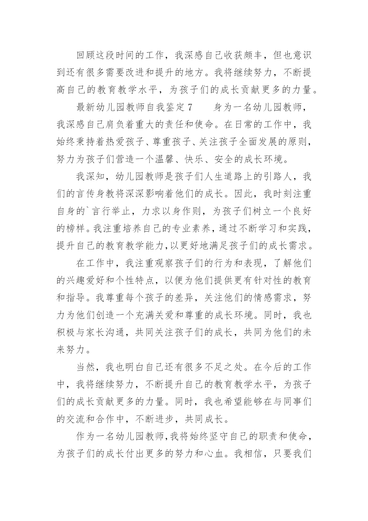 最新幼儿园教师的自我鉴定最新幼儿园教师的自我鉴定(精选7篇)自我鉴定是一个人对某一特定时间段内的学习和工作生活等表现的自我总结,自我鉴定使我们及时找出错误并改正,因此我们是时候写一份自我鉴定了。那么自我鉴定应该包括什么内容呢?下面是小编为大家收集的最新幼儿园教师的自我鉴定(精选7篇),供大家参考借鉴,希望可以帮助到有需要的朋友。最新幼儿园教师的自我鉴定1转眼间,来幼儿园已经四个月了,这段时间对我来说是一次十分有益的磨练和尝试此刻,我的实习生活即将结束,可是这一段时间所带给我的,却能终身受益,我将珍惜剩下的
