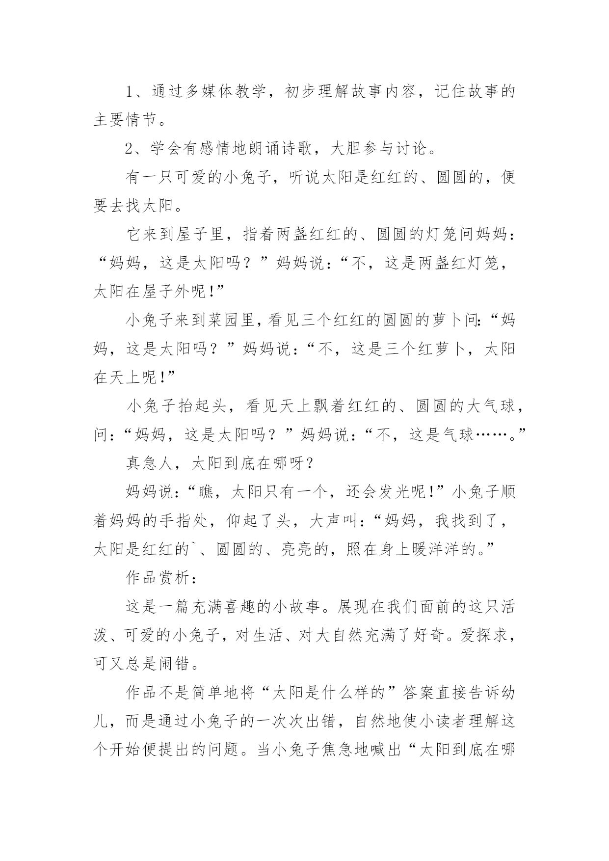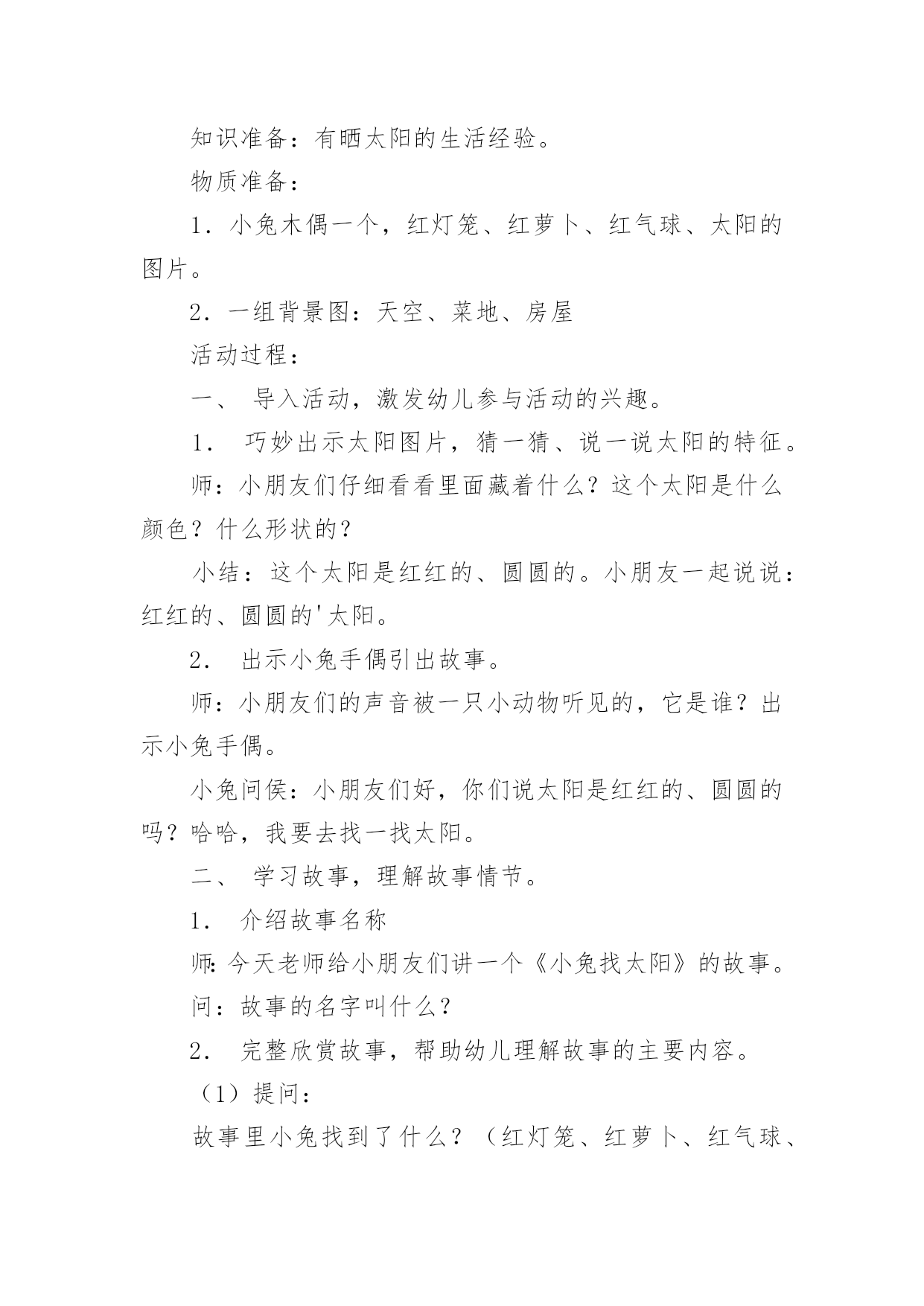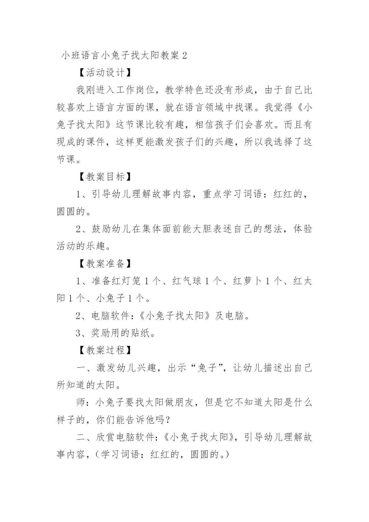 小班语言小兔子找太阳教案在教学工作者实际的教学活动中,时常要开展教案准备工作,教案是实施教学的主要依据,有着至关重要的作用。快来参考教案是怎么写的吧!下面是小编精心整理的小班语言小兔子找太阳教案,欢迎大家借鉴与参考,希望对大家有所帮助。小班语言小兔子找太阳教案1【活动设计】我刚进入工作岗位,教学特色还没有形成,由于自己比较喜欢上语言方面的课,就在语言领域中找课。我觉得《小兔子找太阳》这节课比较有趣,相信孩子们会喜欢。而且有现成的课件,这样更能激发孩子们的兴趣,所以我选择了这节课。【教案目标】1、引导幼儿理