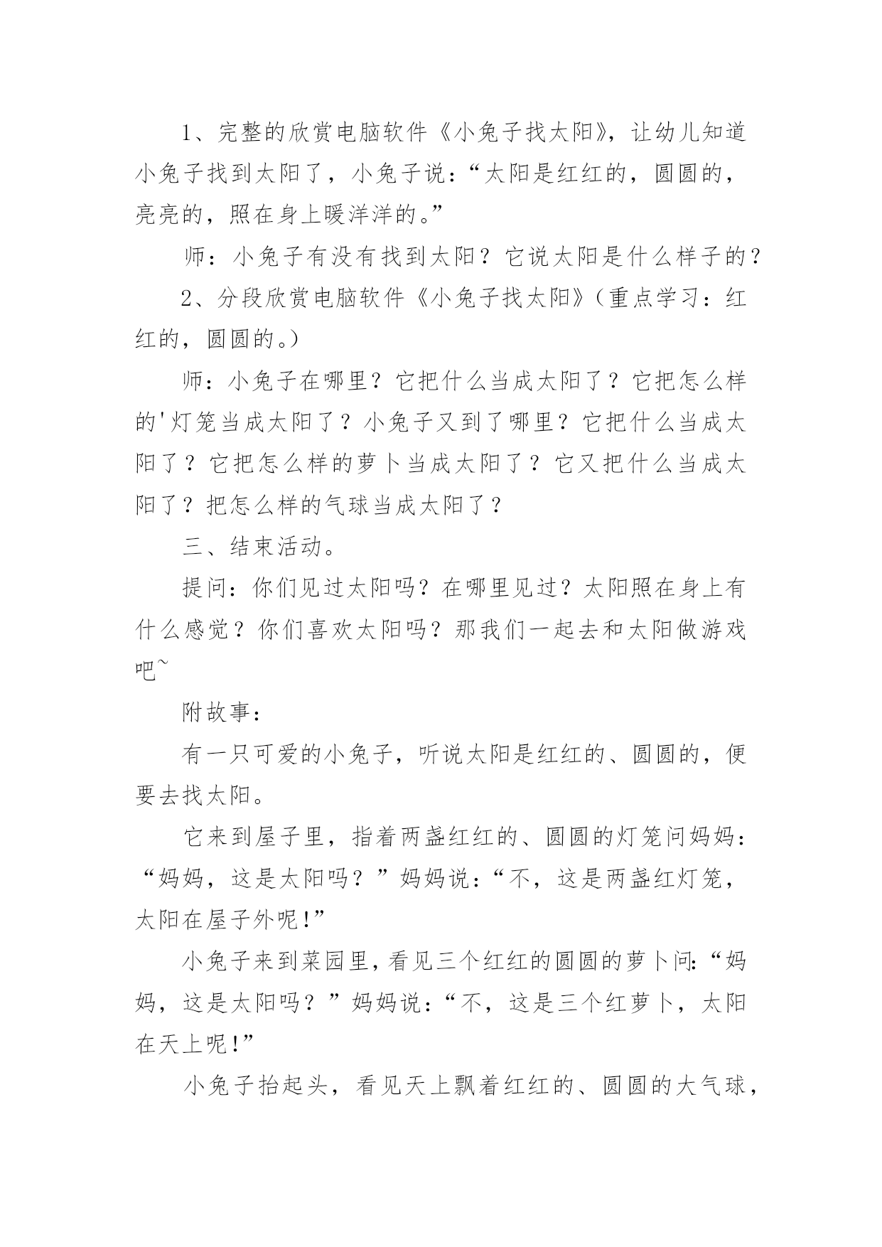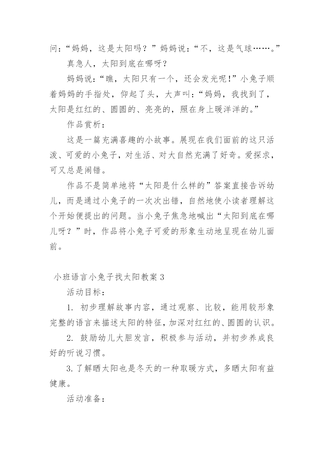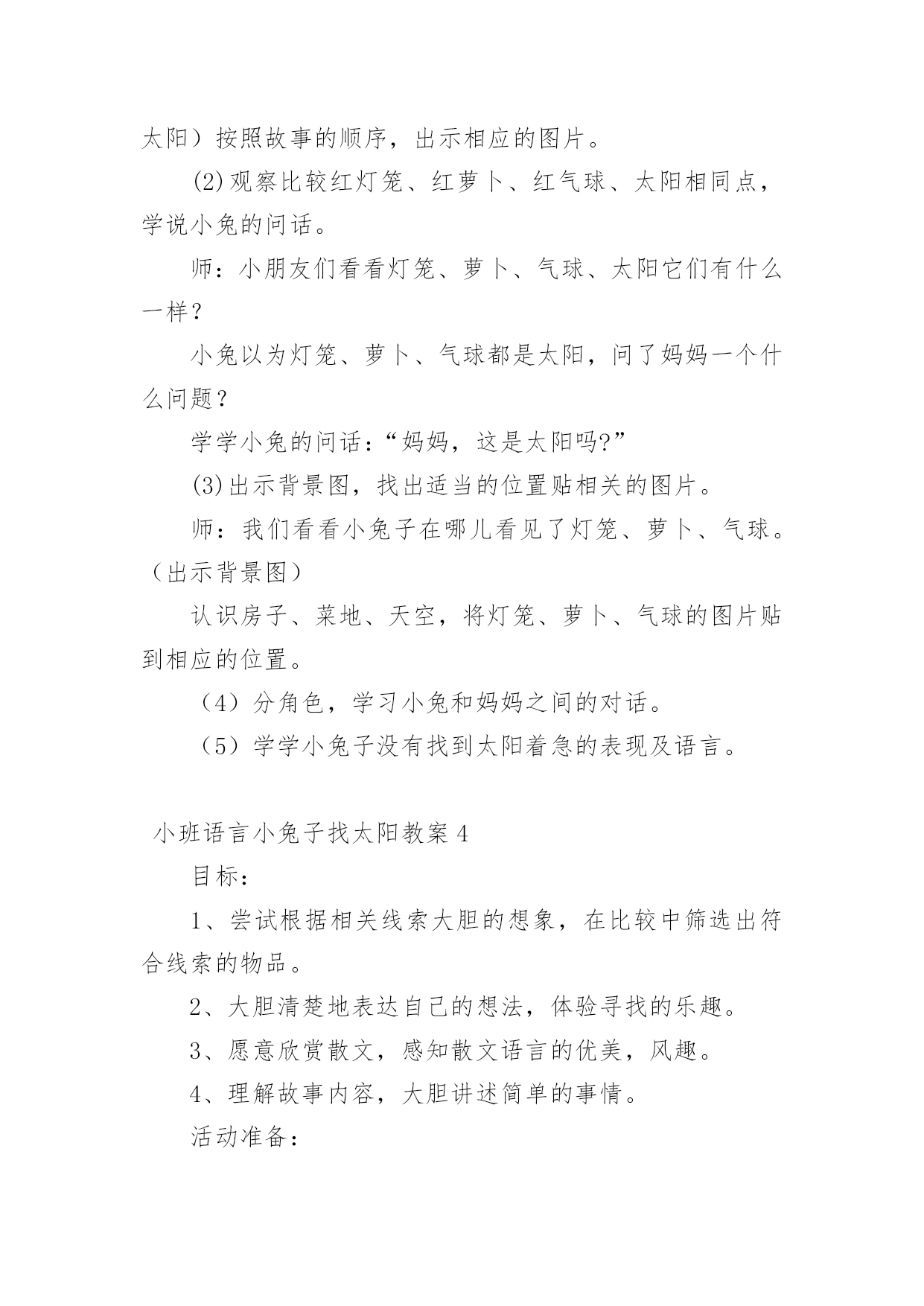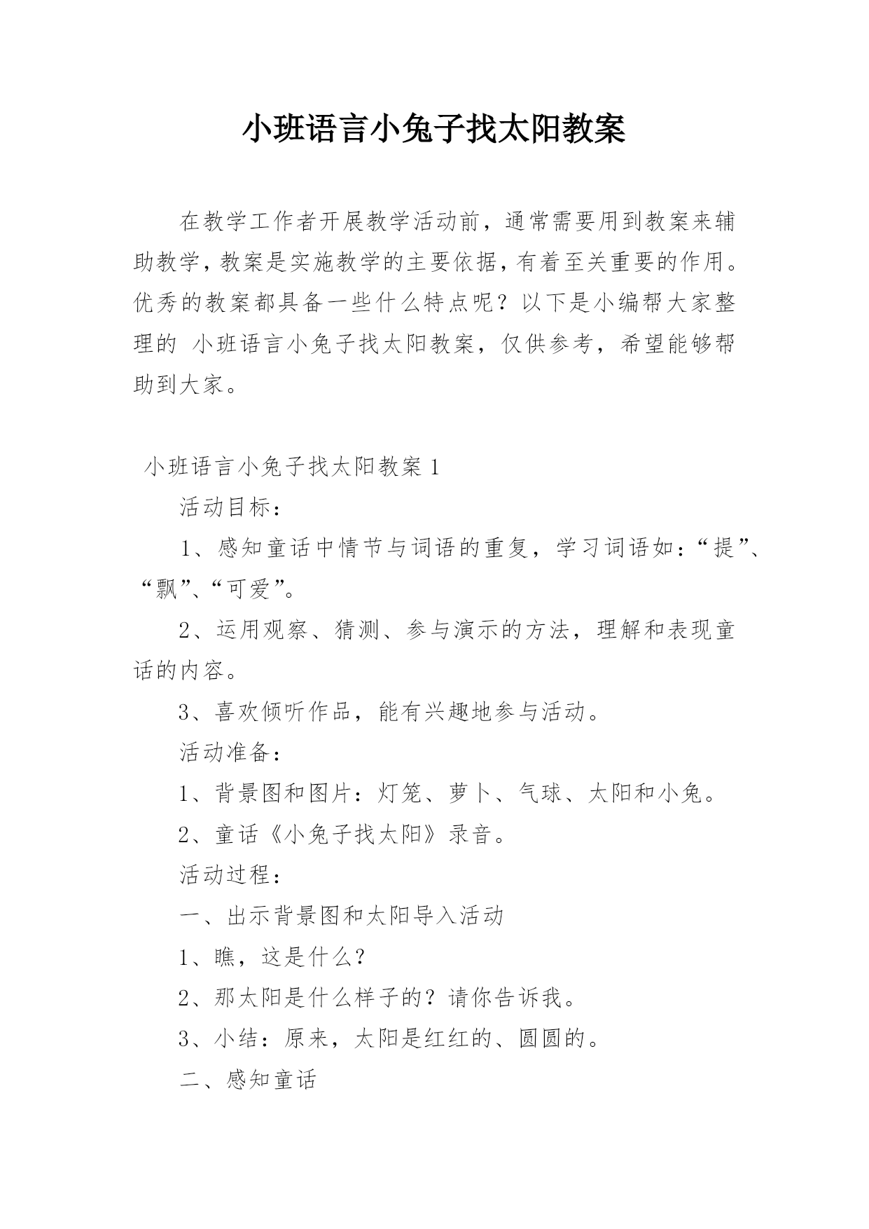 小班语言小兔子找太阳教案在教学工作者实际的教学活动中,时常要开展教案准备工作,教案是实施教学的主要依据,有着至关重要的作用。快来参考教案是怎么写的吧!下面是小编精心整理的小班语言小兔子找太阳教案,欢迎大家借鉴与参考,希望对大家有所帮助。小班语言小兔子找太阳教案1【活动设计】我刚进入工作岗位,教学特色还没有形成,由于自己比较喜欢上语言方面的课,就在语言领域中找课。我觉得《小兔子找太阳》这节课比较有趣,相信孩子们会喜欢。而且有现成的课件,这样更能激发孩子们的兴趣,所以我选择了这节课。【教案目标】1、引导幼儿理