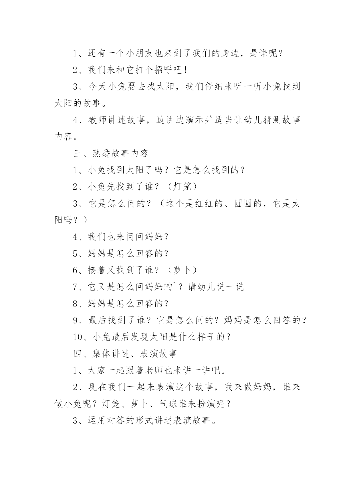 小班语言小兔子找太阳教案在教学工作者开展教学活动前,通常需要准备好一份教案,借助教案可以有效提升自己的教学能力。教案应该怎么写呢?下面是小编帮大家整理的小班语言小兔子找太阳教案,仅供参考,欢迎大家阅读。小班语言小兔子找太阳教案1活动目标:1、感知童话中情节与词语的重复,学习词汇:“圆圆的,红红的”。2、运用猜测、参与演示的方法理解、表现童话的内容,感知“提、飘、可爱”。3、喜欢倾听作品,能有兴趣地参与活动。活动准备:背景图,灯笼、萝卜、气球、太阳、小兔图片,制作成活动式的,便于操作。活动过程:(一)引导活