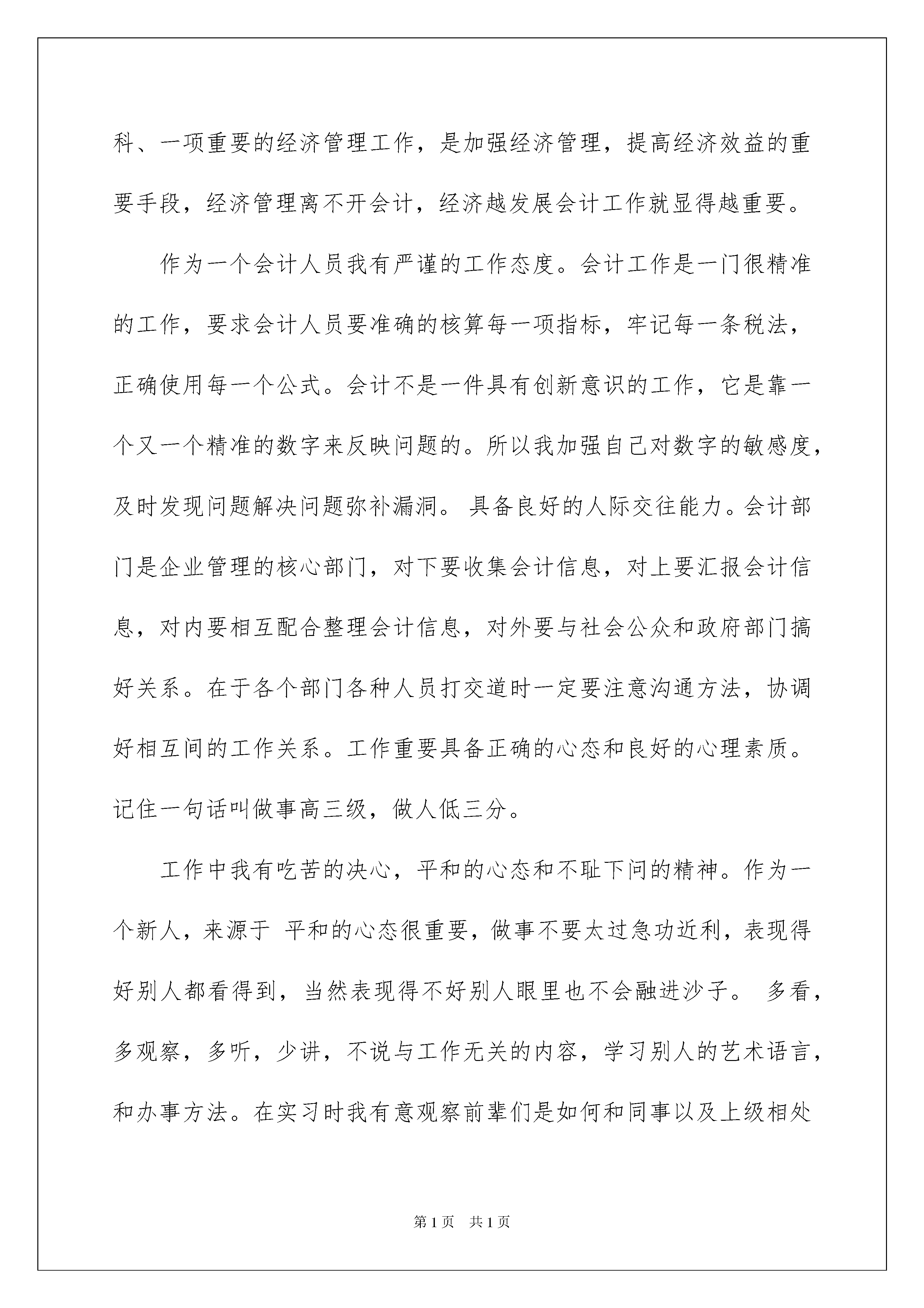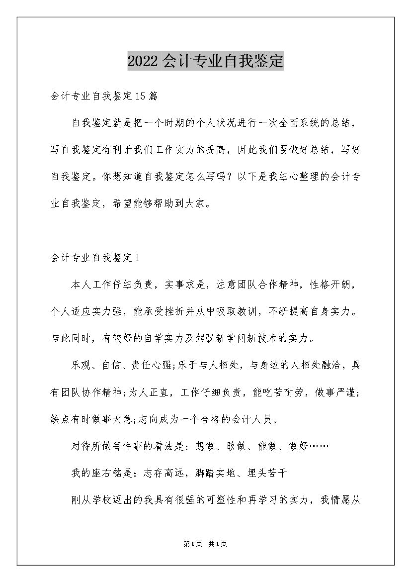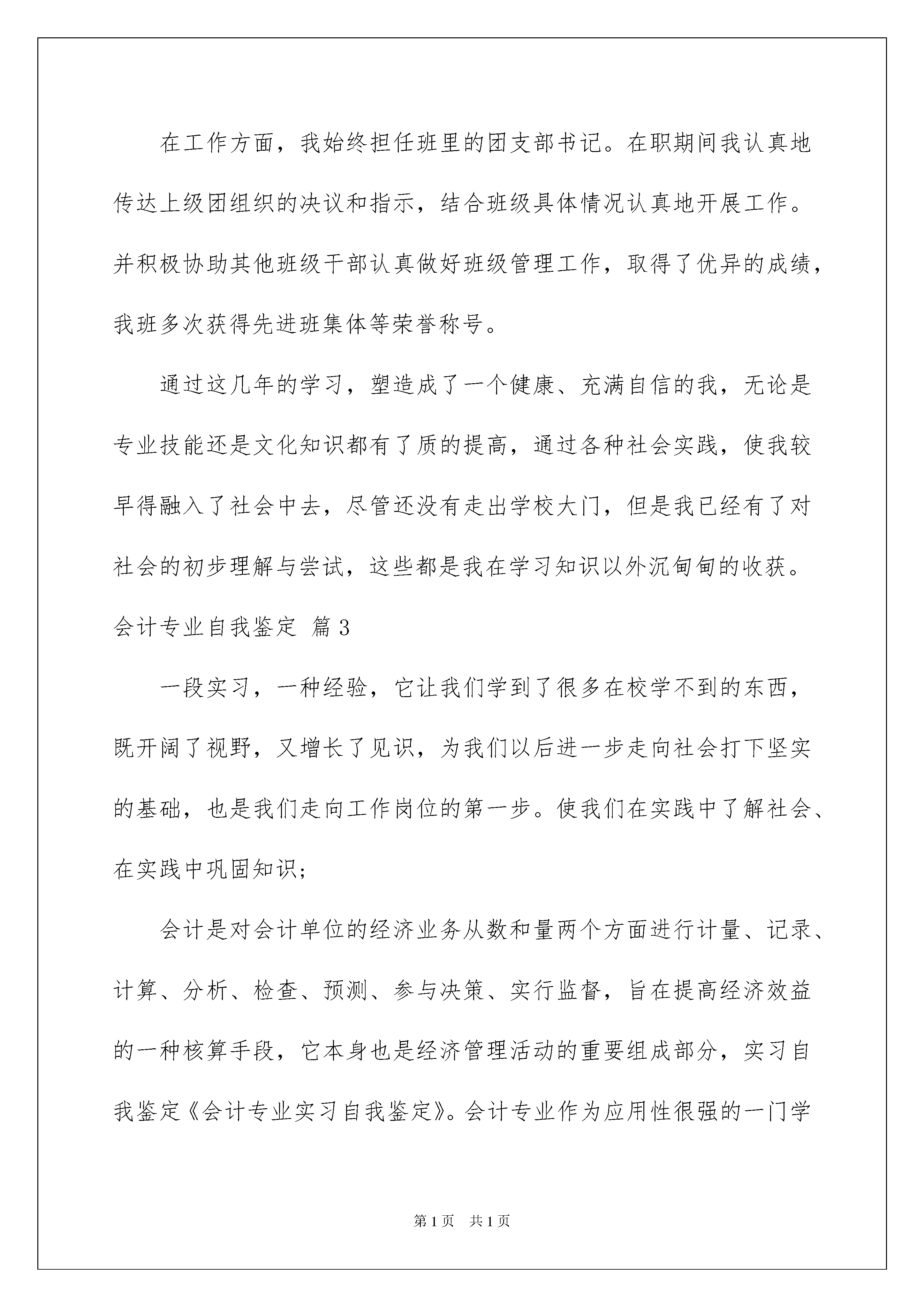 2022会计专业自我鉴定3篇会计专业自我鉴定3篇自我鉴定是对自己的政治思想、工作业务、学习生活等方面情况进行评价与描述,自我鉴定可以使我们锻炼语言组织能力,因此好好准备一份自我鉴定吧。那么你真的懂得怎么写自我鉴定吗?下面是我精心整理的会计专业自我鉴定3篇,仅供参考,希望能够帮助到大家。会计专业自我鉴定篇1三年的大学生涯弹指一挥间,会计专业毕业自我鉴定。马上就要毕业了,回首走过的求学路,我深切地感到时光飞逝。诚然,短短的三年只是我人生历程的中间站,而生活的帆才刚刚扬起。因此,认真回顾并总结这三年来的生活、学习和工作,以便能更加坚定自信地朝前走,显得是那么的重要。三年以来,我热爱社会主义、拥护中国共产党的领导、自觉遵守国家财经法规规章和学校的各项规章制度。积极参加校党委组织的党校活动,积极向党组织靠拢,并被组织接收为预备党员。在校三年,我努力学习会计专业知识,积极参加会计系组织的历次认识性实习和生产性实习活动;学习之余,我还勇于承担社会工作,工作中认真负责,提高了管理组织能力,练就了较强的独立处理问题的能力。在工作中培养了较强的集体观念和较高的团队合作精神。平时注重培养自己的综合素质、修养、为人处事能力以及交际能力。目的是努力把自己锻炼成为一名一专多能的复合型人才。现将我的思想、工作、学习、生活等方面的情况总结如下:一、学习方面:大学三年,是我来之不易的学习机会。我本着学好本专业、尽量扩大知识面、并加强能力锻炼的原则,大量汲取知识财富,锻炼了自己的各种专业能力,毕业鉴定《会计专业毕业自我鉴定》。我努力地学习基础课,深研专业知识,并取得了较好的成绩。本人在几年中系统学习了《基础会计》、《财务会计》、管理会计、成本会计、财务管理、财务报表分析、审计学、审计案例研究、会计法、税法、纳税会计实务、经济法基储经济法、市场营销学、货币银行学、统计学原理、资产评估、预算会计、税收筹划、小企业会计实务、办公自动化等课程。(专业课程写全称,并用书名号)a在学习过程中我还勤于思考和擅于积累。在我们学习会计专业知识期间,正是国家的会计政策、制度的又一轮变革期间。所以,这既给我们创造了机遇,又让我们面临挑战。新旧知识的交替,使得我们在学习旧知识的基础上又直接过渡到新知识,可以让我们对新旧知识能更好的进行对比和理解,从而认识到新知识的新特点。例如:新准则是以提高会计信息质量为前提,以满足投资者、债权人、政府和企业管理层等有关方面对会计信息的需求,进一步规范会计行为和会计工作秩序,维护社会公众利益为目的;是建立与我国社会主义市场经济相适应并与国际准则趋同,涵盖企业各项经济业务并可独立实施的会计准则体系。它相对于旧准则有4大特点、5大突破、12大变化等。一、4大特点:(1)系统化、科学规范化(2)法规体系一致性与会计处理方法的一致性(3)与我国国情相适应(4)国际化趋势明显二、5大突破:(1)确立了具有我国特色的财务会计概念框架(2)构建了一套完整的会计准则层级体系(3)拓展了准则制定的法律法规依据(4)会计信息质量要求方面的差异,保留了重要性、相关性、可比性、及时性、一贯性、谨慎性,将明晰性改为可理解性,真实性改为可靠性,将权责发生制作为一项假定前提,并增加了实质重于形式的要求(5)财务会计报告体系方面的差异,原准则财务报告包括资产负债表、损益表、财务状况变动表或现金流量表、附表及附注和财务情况说明书。新准则在保留了原准则中的资产负债表、损益表、现金流量表、附注的基础上将“附表”改为“其他财务报告”,增加了股东权益变动表,并规定企业可根据需要增加相关报表,形成了一个开放性的动态体系,取消了财务情况说明书。三、12大变化:(1)公允价值计量重新得到认可和运用(2)减值准备不能冲回(3)所得税会计处理方法有重大改变,引入“暂时性差异”的概念取代“时间性差异”,采用资产负债表债务法对暂时性差异进行处理(4)存货准则变化,例如取消了存货的“后进先出”结转方法等(5)借款费用准则的变化(6)长期股权投资(7)固定资产。对于符合固定资产确认条件的后续支出,计入固定资产成本,如更换设备改造支出、房屋维修支出等,同时扣除被替换部分的账面价值;对于不符合固定资产确认条件的后续支出,计入当期损益,如大修费用、日常修理支出等,不得预提或待摊。(8)无形资产。主要变化有:一是企业内部研究开发项目研究阶段的支出,应当于发生时计入当期损益;开发阶段的支出,在符合准则规定的条件时确认为无形资产,否则应计入当期损益。研发支出无法明确分配的,应当计入当期损益,不计入开发活动的`成本。(9)职工薪酬。新规定了职工的范围、职工薪酬的范围(1