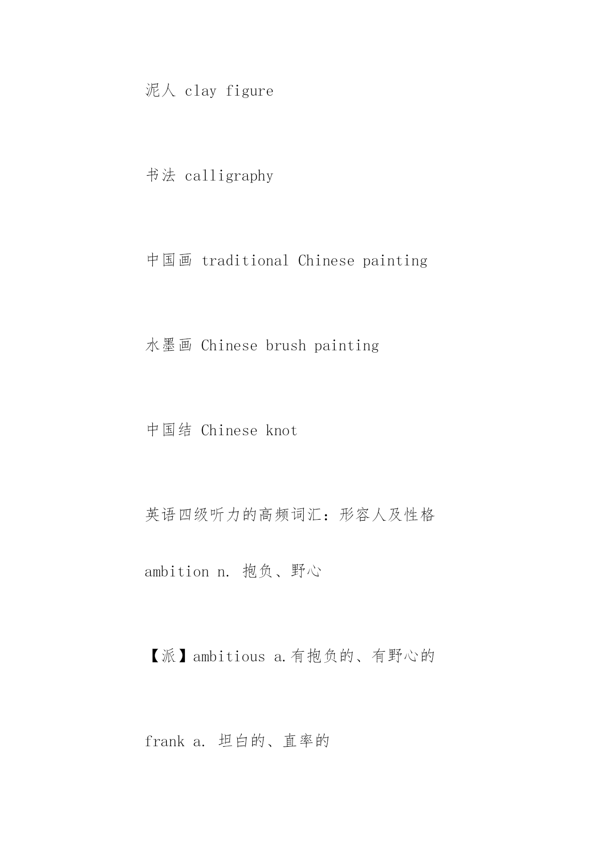 英语四级听力的高频词汇的英语四级听力的高频词汇必备的词汇是大学英语四级考试听力部分的基础,因此考生要注意一些有用的必备的高频词汇。为此百分网小编给大家整理了英语四级听力考试必备高频词汇的内容,欢迎阅读参考!英语四级听力的高频词汇:中国特色秦腔Qinopera功夫Kungfo太极TaiChi口技ventriloquism木偶戏puppetshow皮影戏shadowplay折子戏operahighlights杂技acrobatics相声wittydialoguecomedy刺绣embroidery苏绣Suzh