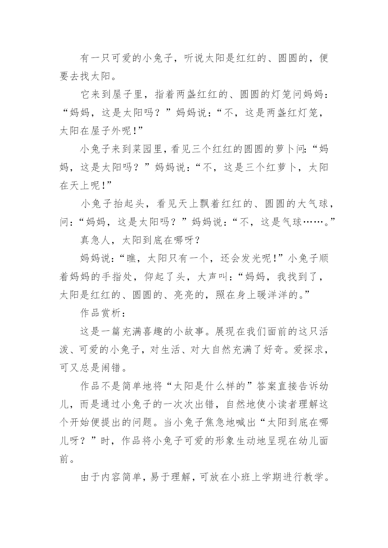 小班语言小兔子找太阳教案小班语言小兔子找太阳教案作为一名人民教师,常常要写一份优秀的教案,借助教案可以恰当地选择和运用教学方法,调动学生学习的积极性。教案应该怎么写呢?下面是小编为大家整理的小班语言小兔子找太阳教案,欢迎大家借鉴与参考,希望对大家有所帮助。活动目标1、引导幼儿观察、比较,讲述太阳的外形特征,通过看一看、摆一摆、贴一贴,初步了解故事内容,并学习故事中反复出现的字和词,以及其中的对话等。2、鼓励幼儿大胆发言,积极参与活动,并初步培养幼儿良好的听说习惯。3、通过语言表达和动作相结合的形式充分感受