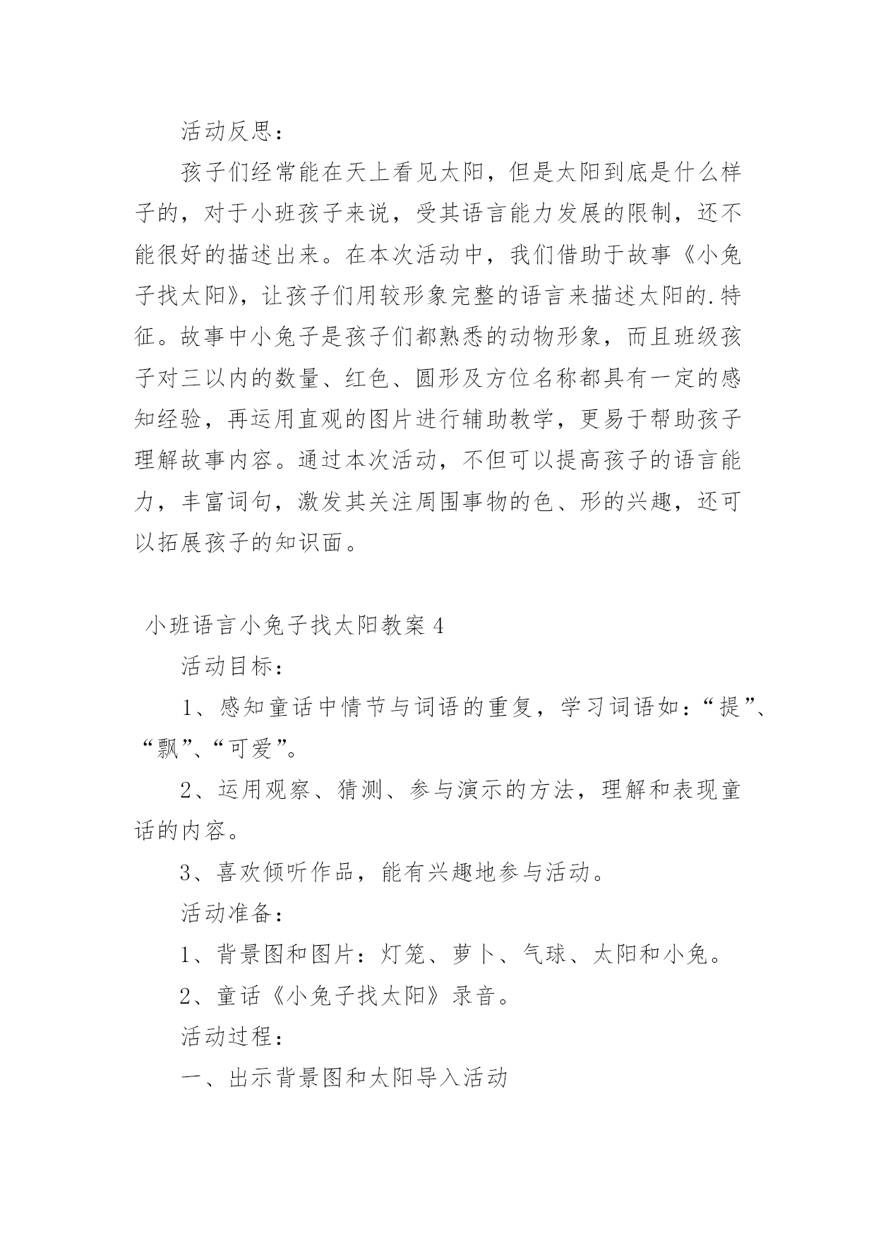 小班教案|小班语言:小兔子找太阳小班教案|小班语言:小兔子找太阳作为一名无私奉献的老师,时常会需要准备好教案,教案是教学活动的总的组织纲领和行动方案。教案应该怎么写才好呢?以下是小编帮大家整理的小班教案|小班语言:小兔子找太阳,欢迎阅读与收藏。活动目标:1、感知童话中情节与词语的重复,学习词汇:“圆圆的,红红的”。2、运用猜测、参与演示的方法理解、表现童话的内容,感知“提、飘、可爱”。3、喜欢倾听作品,能有兴趣地参与活动。活动准备:背景图,灯笼、萝卜、气球、太阳、小兔图片,制作成活动式的,便于操作。活动过