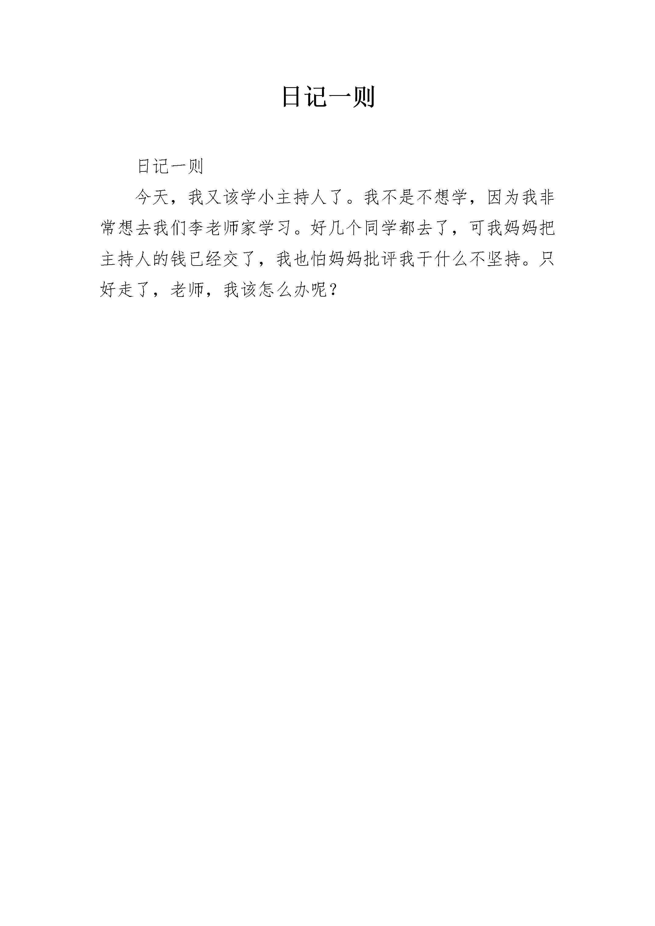 日记一则日记一则今天,我又该学小主持人了。我不是不想学,因为我非常想去我们李老师家学习。好几个同学都去了,可我妈妈把主持人的钱已经交了,我也怕妈妈批评我干什么不坚持。只好走了,老师,我该怎么办呢?