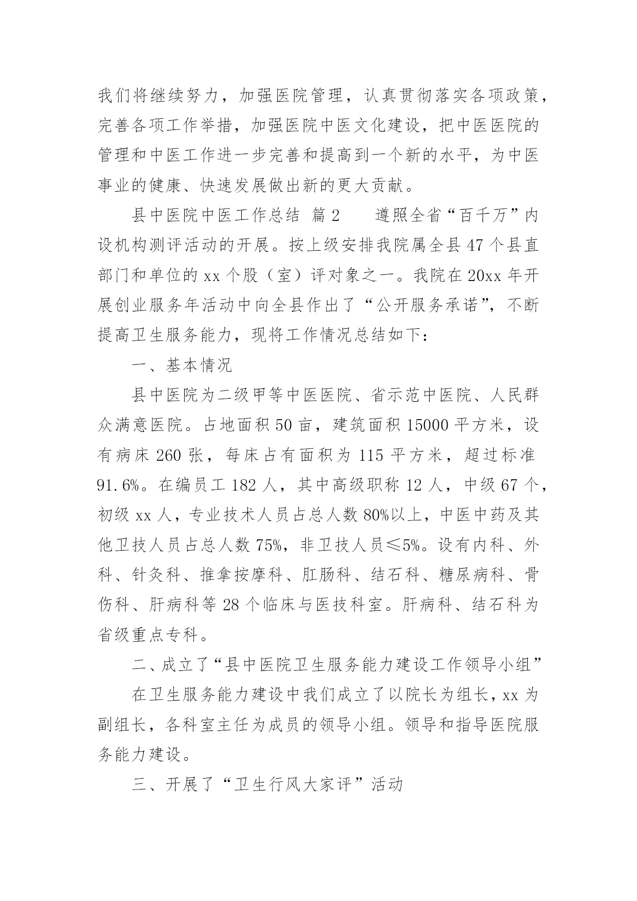 县中医院中医工作总结县中医院中医工作总结县中医院中医工作总结根据省中医药管理局、市卫生局的统一安排部署和要求,我院全面贯彻落实“中医医院管理年”活动。医院对照标准,查找工作薄弱环节,紧紧围绕“以病人为中心,以发挥中医药特色优势”这一工作主题,制定整改措施,狠抓落实。市、县卫生局领导十分重视我院的医院管理年活动开展情况,多次到我院检查指导相关工作,提出整改意见和建议,推动我院管理年活动向纵深发展,并取得了初步成效和阶段性成果。一、加强领导,精心组织,完善举措,务求实效在开展“中医医院管理年”活动中,我院始终