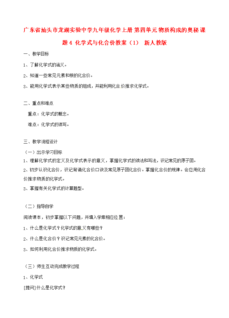 广东省汕头市龙湖实验中学九年级化学上册第四单元物质构成的奥秘课题4化学式与化合价教案(1)新人教版一、教学目标1、了解化学式的涵义。2、知道一些常见元素和根的化合价。3、能用化学式表示某些物质的组成并能利用化合价推求化学式。二、重点和难点重点:化学式的概念。难点:化学式的读写。三、教学流程设计(一)出示学习目标1、理解化学式的定义及化学式表示的意义掌握化学式的读法和写法识记常见的原子团。2、初步认识化合价识记背诵化合价口诀及常见原子团化合价。掌握化合价的规律。会应用化合价推求物质的化学式