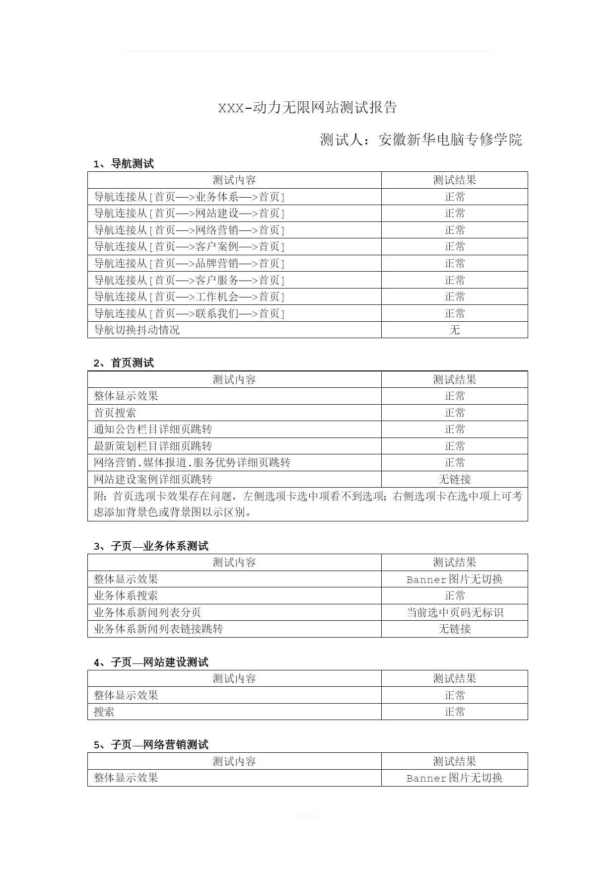 XXX-动力无限网站测试报告测试人:安徽新华电脑专修学院1、导航测试测试内容测试结果导航连接从[首页——>业务体系——>首页]正常导航连接从[首页——>网站建设——>首页]正常导航连接从[首页——>网络营销——>首页]正常导航连接从[首页——>客户案例——>首页]正常导航连接从[首页——>品牌营销——>首页]正常导航连接从[首页——>客户服务——>首页]正常导航连接从[首页——>工作机会——>首页]正常导航连接从[首页——>联系我们——>首页]正常导航切换抖动情况无2、首页测试测试内容测试结果整体显示效果