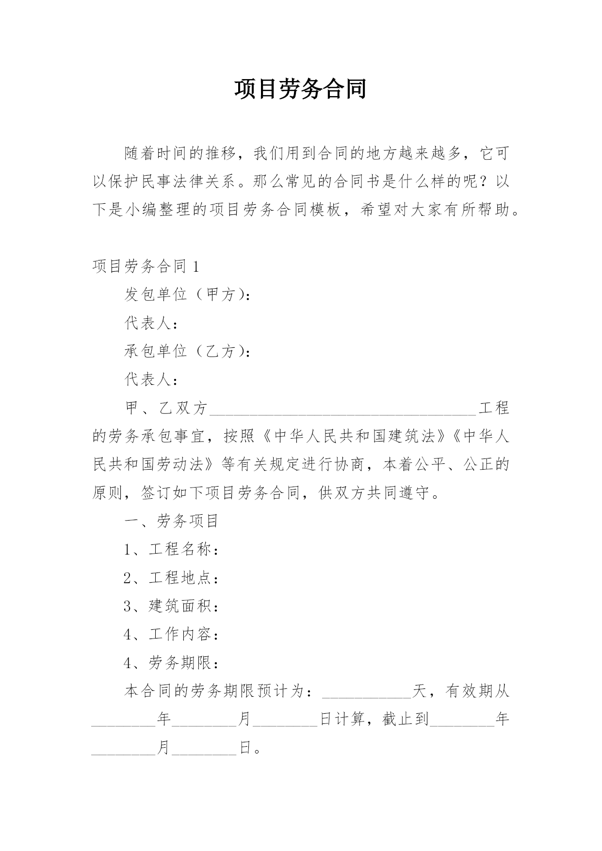 工程项目劳务合同随着广大人民群众法律意识的普遍提高,人们运用到合同的场合不断增多,签订合同能促使双方规范地承诺和履行合作。那么相关的合同到底怎么写呢?下面是小编收集整理的工程项目劳务合同,仅供参考,希望能够帮助到大家。工程项目劳务合同1劳务发包方:__________________________________________(以下简称甲方)劳务承包方:__________________________________________(以下简称乙方)依照《中华人民共和国劳动合同法》、《中华人民共和国