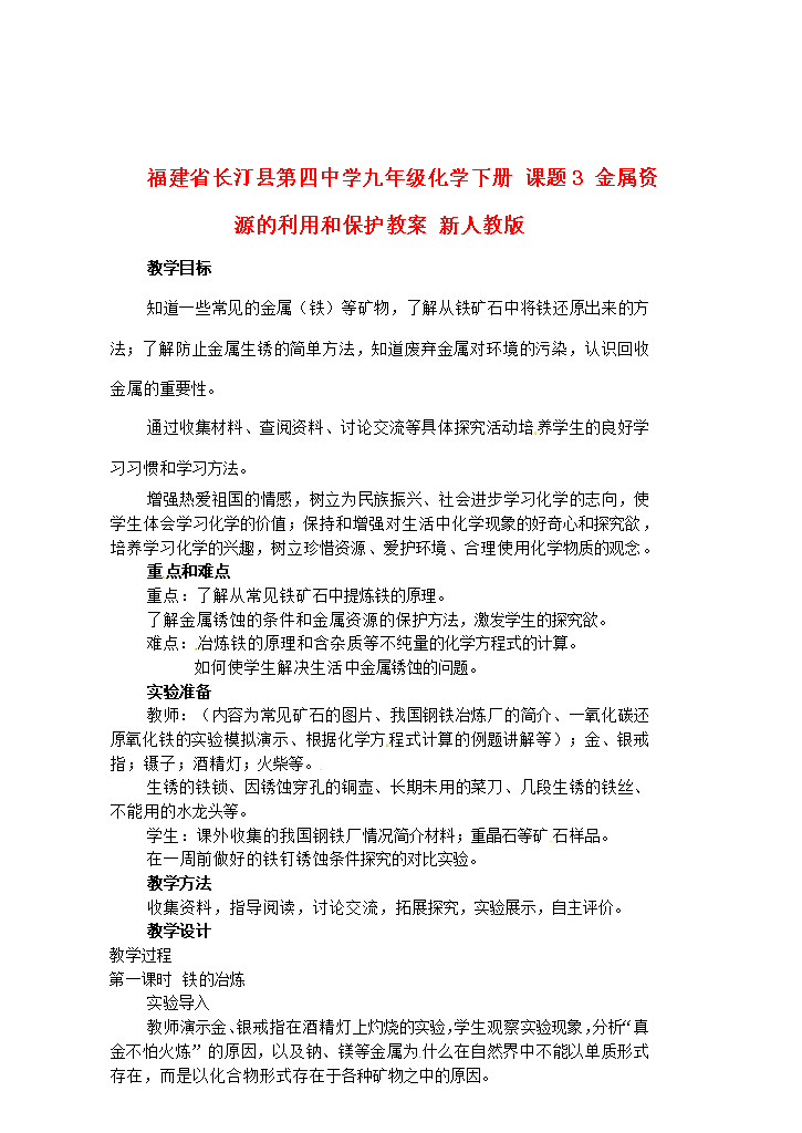 福建省长汀县第四中学九年级化学下册课题3金属资源的利用和保护教案新人教版教学目标知道一些常见的金属(铁)等矿物了解从铁矿石中将铁还原出来的方法;了解防止金属生锈的简单方法知道废弃金属对环境的污染认识回收金属的重要性。通过收集材料、查阅资料、讨论交流等具体探究活动培养学生的良好学习习惯和学习方法。增强热爱祖国的情感树立为民族振兴、社会进步学习化学的志向使学生体会学习化学的价值;保持和增强对生活中化学现象的好奇心和探究欲培养学习化学的兴趣树立珍惜资源、爱护环境、合理使用化学物质的观念。重点和难点重点:了