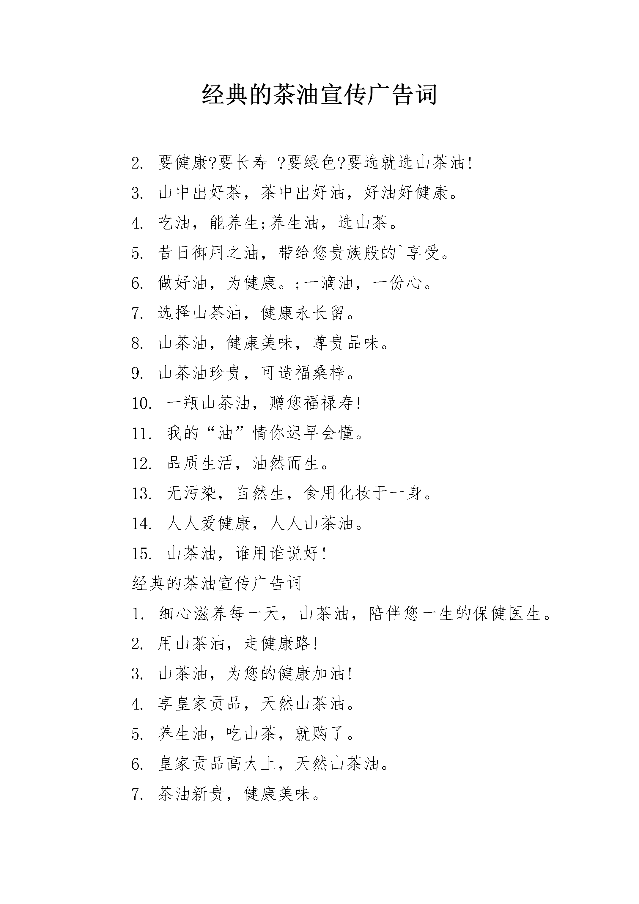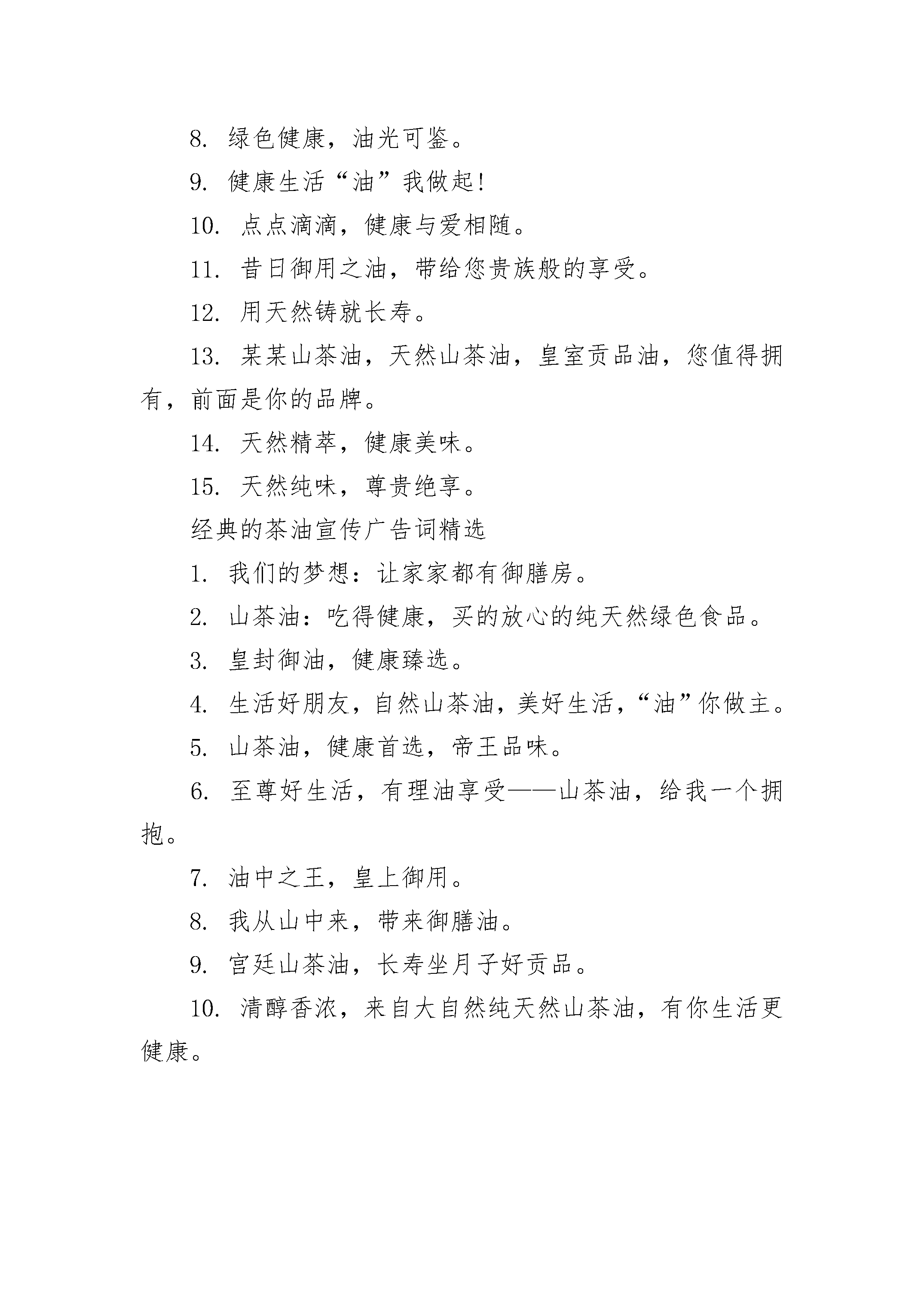 经典的茶油宣传广告词经典的茶油宣传广告词最新1.美丽山茶花,健康山茶油。2.要健康?要长寿?要绿色?要选就选山茶油!3.山中出好茶,茶中出好油,好油好健康。4.吃油,能养生;养生油,选山茶。5.昔日御用之油,带给您贵族般的享受。6.做好油,为健康。;一滴油,一份心。7.选择山茶油,健康永长留。8.山茶油,健康美味,尊贵品味。9.山茶油珍贵,可造福桑梓。10.一瓶山茶油,赠您福禄寿!11.我的“油”情你迟早会懂。12.品质生活,油然而生。13.无污染,自然生,食用化妆于一身。14.人人爱健康,人人山茶油。1