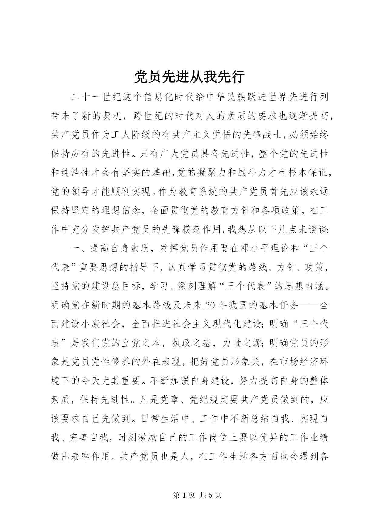 党员先进从我先行二十一世纪这个信息化时代给中华民族跃进世界先进行列带来了新的契机跨世纪的时代对人的素质的要求也逐渐提高共产党员作为工人阶级的有共产主义觉悟的先锋战士必须始终保持应有的先进性。只有广大党员具备先进性整个党的先进性和纯洁性才会有坚实的基础党的凝聚力和战斗力才有根本保证党的领导才能顺利实现。作为教育系统的共产党员首先应该永远保持坚定的理想信念全面贯彻党的教育方针和各项政策在工作中充分发挥共产党员的先锋模范作用。我想从以下几点来谈谈:一、提高自身素质发挥党员作用要在