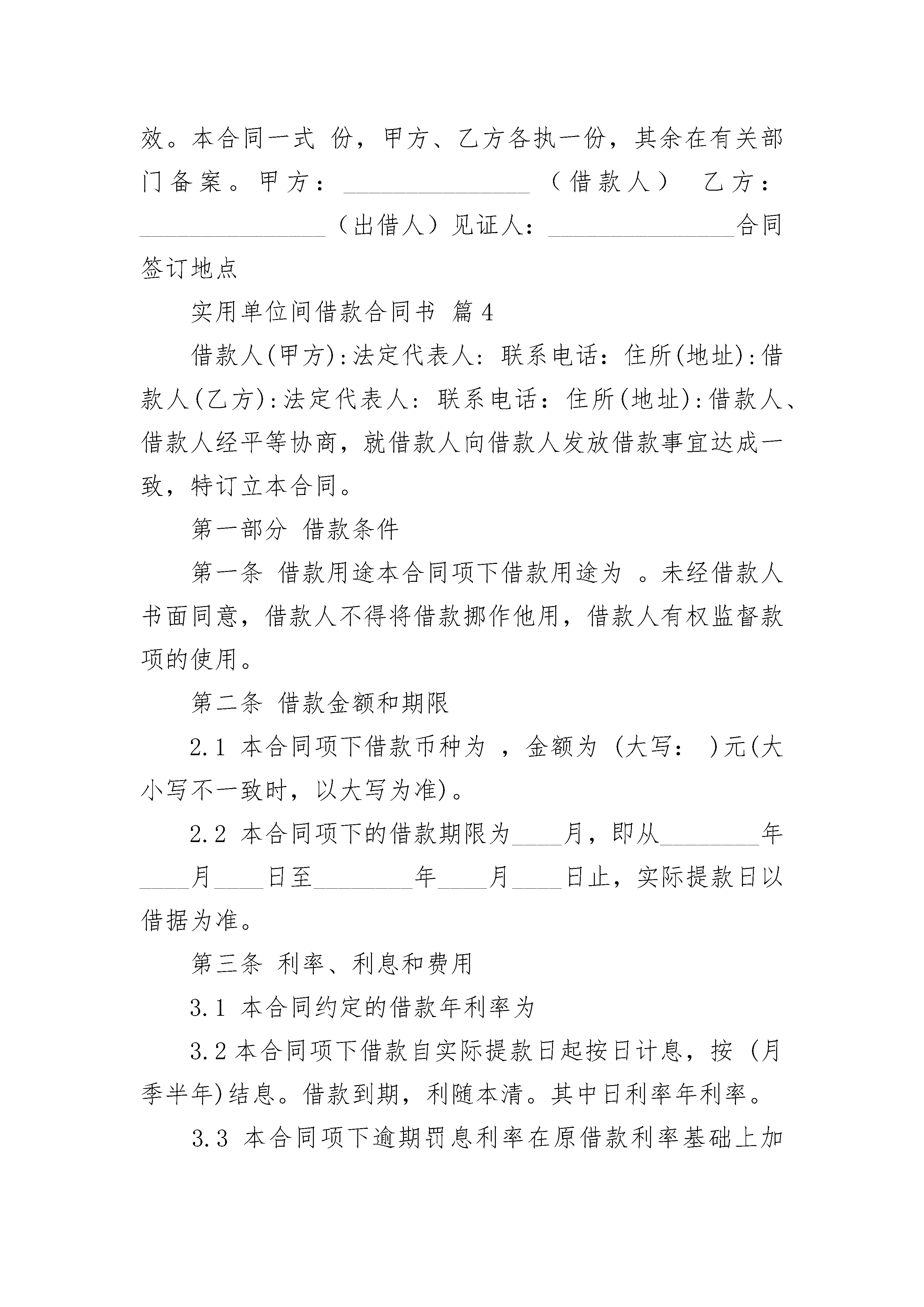 实用单位间借款合同书实用单位间借款合同书(精选19篇)实用单位间借款合同书篇1贷款方:借款方:连带保证人:一、借款用途借款方,(借款用途要合法)急需一笔资金。二、借款金额借款方向贷款方借款人民币______万元,付款方式选择。钱款交付方式:1、转账方式。贷款方通过转账方式将钱款汇入借款人的账户或借款人指定的账户。账户信息如下:账户名称:账号:开户行:2、现金交付方式。在签订本协议时,贷款方一次性以现金方式将钱款交付给借款人。三、借款利息自交付贷款之日起,按实际占用天数计算利息。在合同规定的借款期内,年