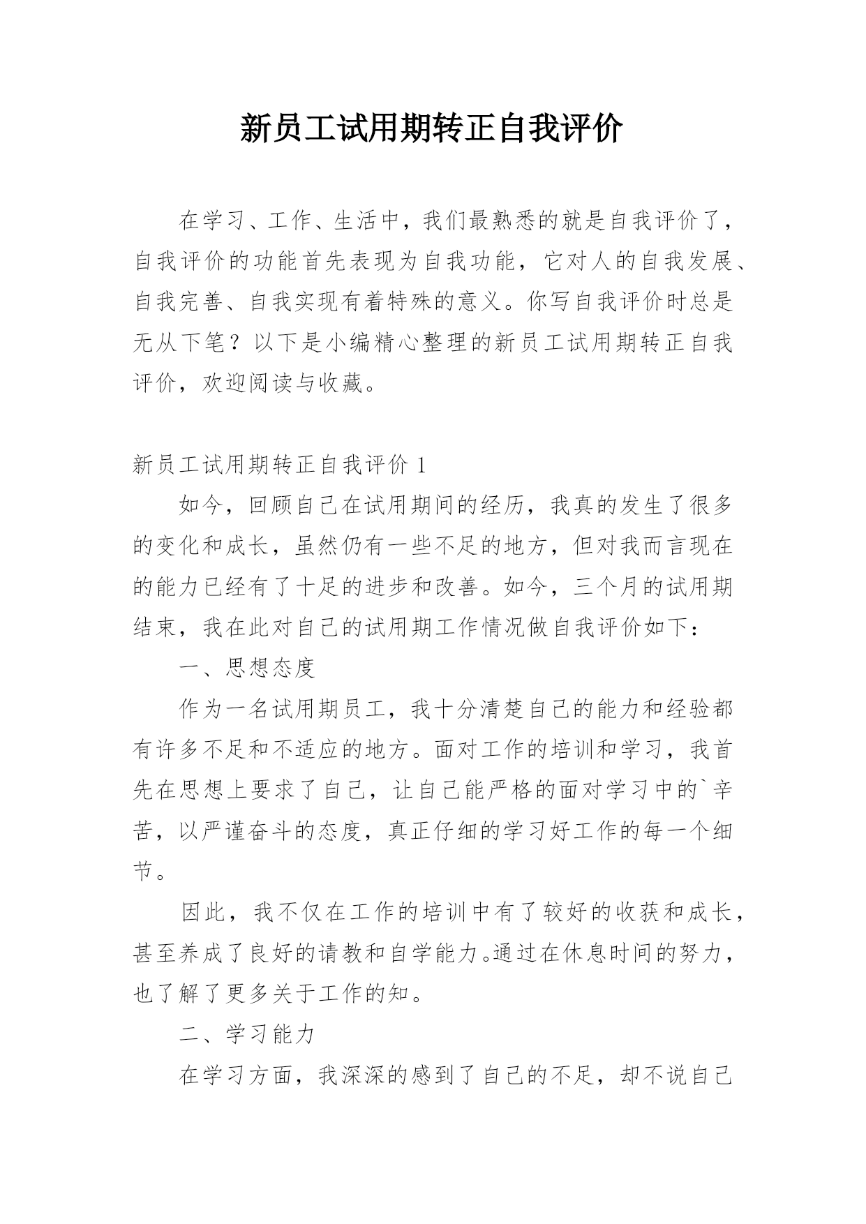 新员工试用期转正自我评价在学习、工作、生活中,我们最熟悉的就是自我评价了,自我评价的功能首先表现为自我功能,它对人的自我发展、自我完善、自我实现有着特殊的意义。你写自我评价时总是无从下笔?以下是小编精心整理的新员工试用期转正自我评价,欢迎阅读与收藏。新员工试用期转正自我评价1如今,回顾自己在试用期间的经历,我真的发生了很多的变化和成长,虽然仍有一些不足的地方,但对我而言现在的能力已经有了十足的进步和改善。如今,三个月的试用期结束,我在此对自己的试用期工作情况做自我评价如下:一、思想态度作为一名试用期员工,