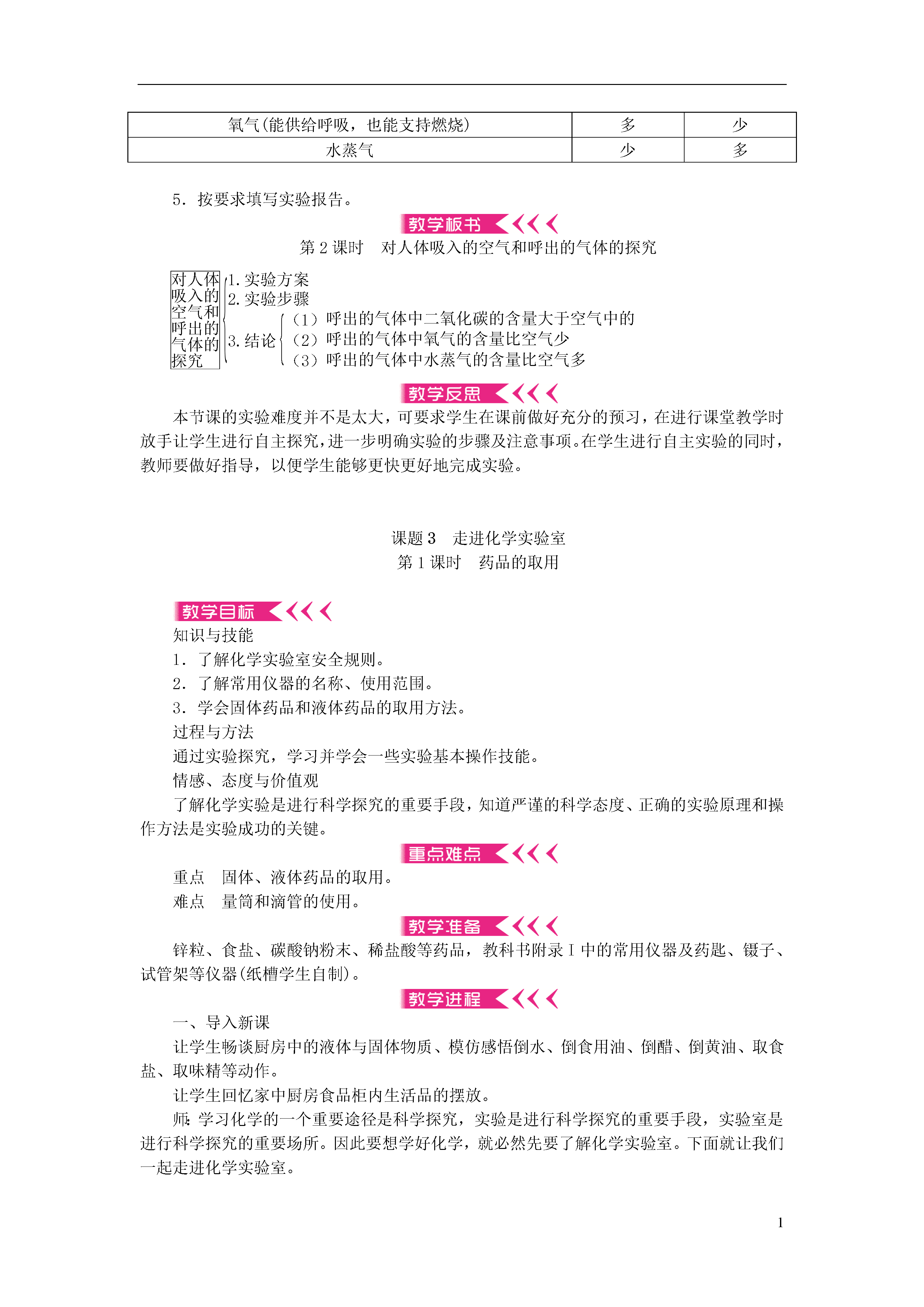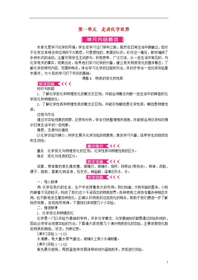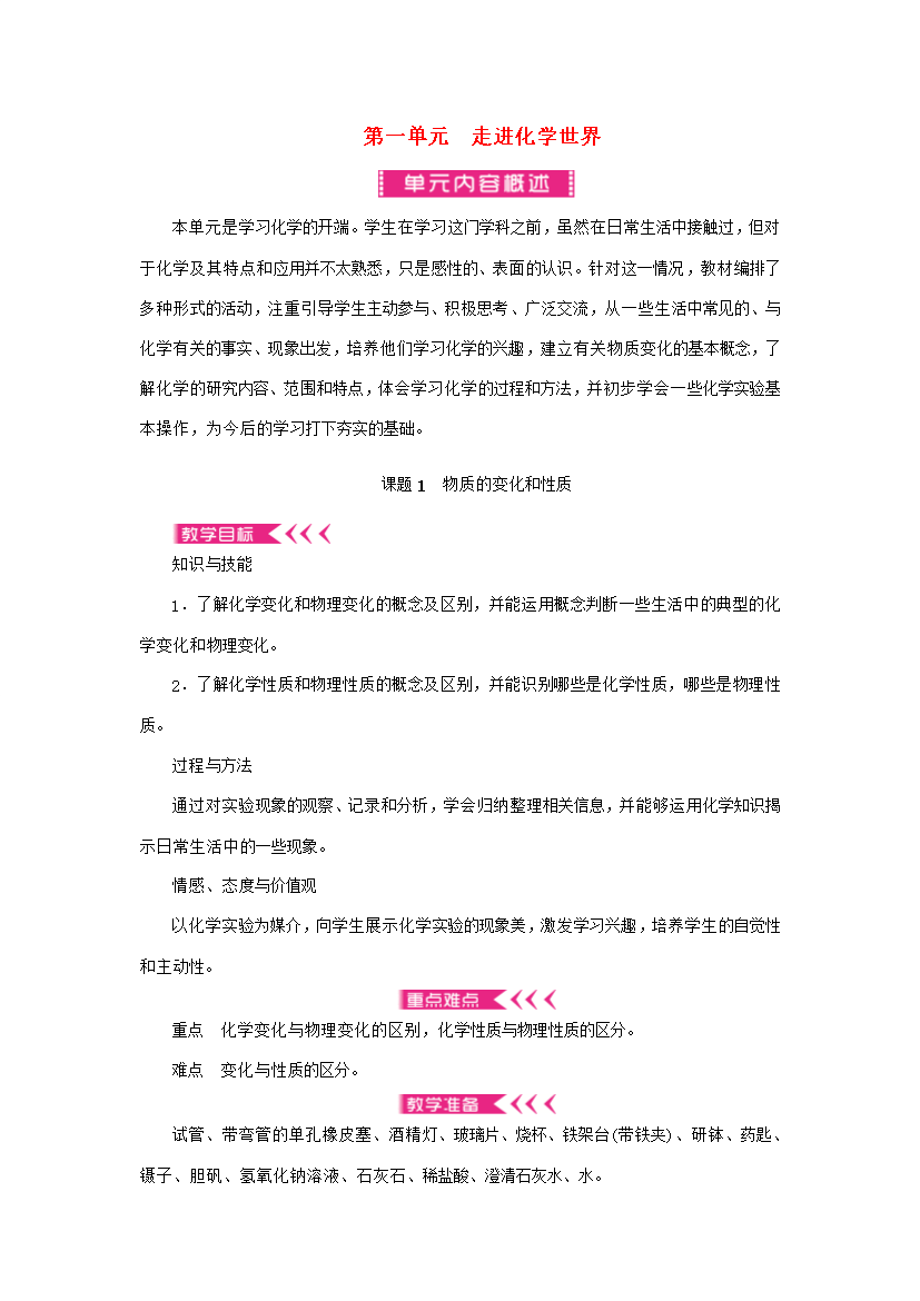 第一单元走进化学世界本单元是学习化学的开端。学生在学习这门学科之前虽然在日常生活中接触过但对于化学及其特点和应用并不太熟悉只是感性的、表面的认识。针对这一情况教材编排了多种形式的活动注重引导学生主动参与、积极思考、广泛交流从一些生活中常见的、与化学有关的事实、现象出发培养他们学习化学的兴趣建立有关物质变化的基本概念了解化学的研究内容、范围和特点体会学习化学的过程和方法并初步学会一些化学实验基本操作为今后的学习打下夯实的基础。课题1物质的变化和性质知识与技能1.了解化学变化和物理变化的概念及区别并能运用