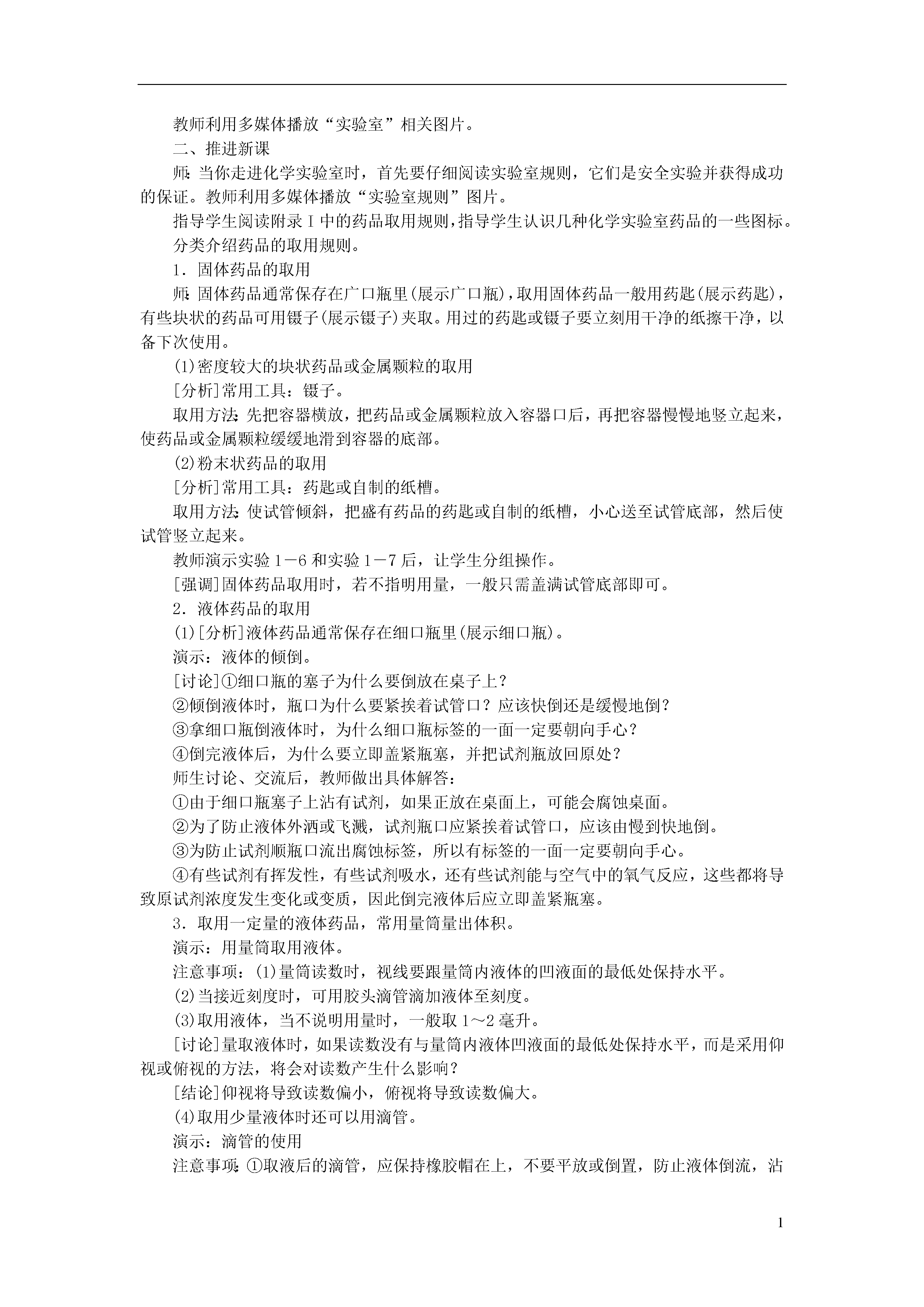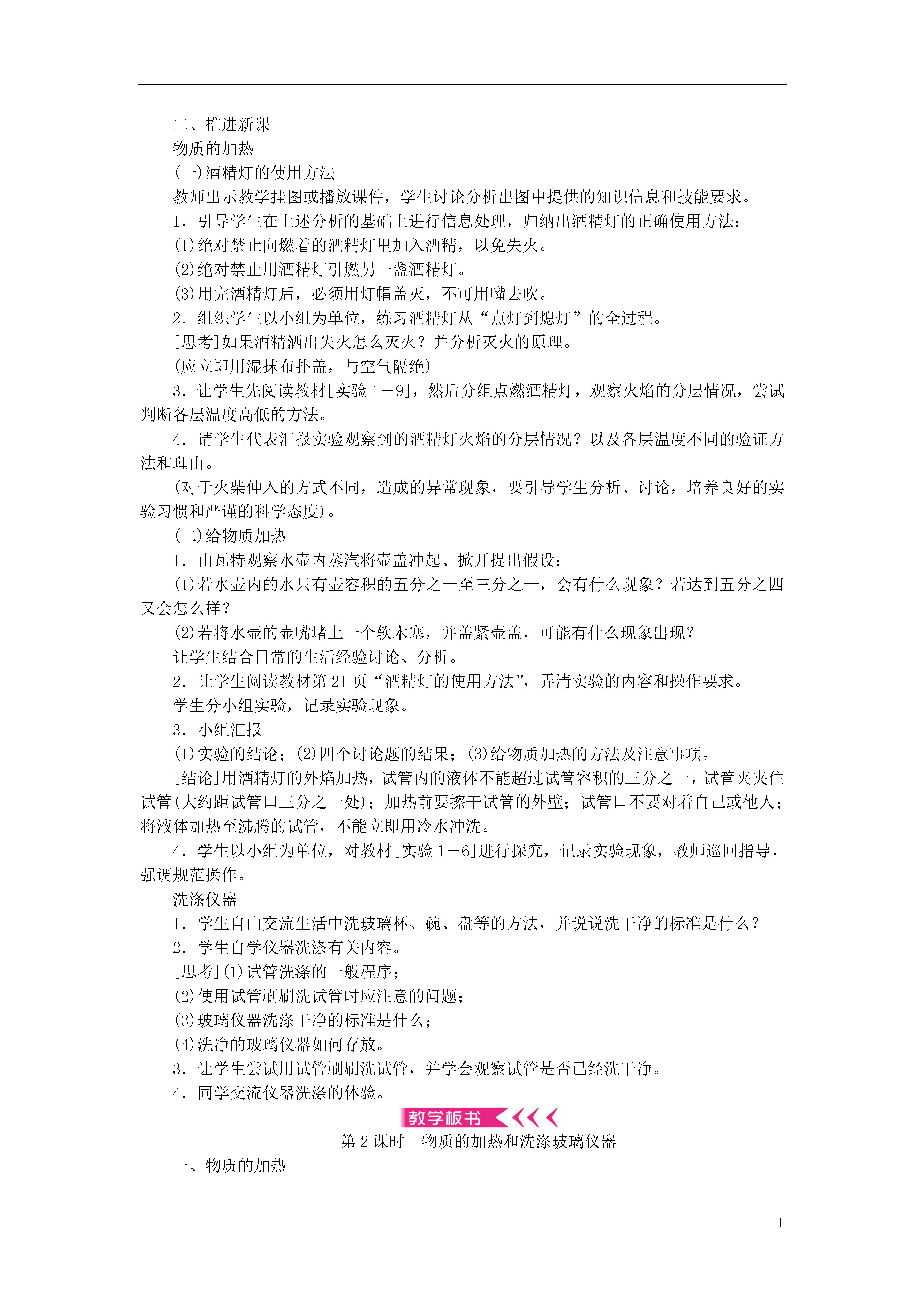 1第一单元走进化学世界本单元是学习化学的开端。学生在学习这门学科之前,虽然在日常生活中接触过,但对于化学及其特点和应用并不太熟悉,只是感性的、表面的认识。针对这一情况,教材编排了多种形式的活动,注重引导学生主动参与、积极思考、广泛交流,从一些生活中常见的、与化学有关的事实、现象出发,培养他们学习化学的兴趣,建立有关物质变化的基本概念,了解化学的研究内容、范围和特点,体会学习化学的过程和方法,并初步学会一些化学实验基本操作,为今后的学习打下夯实的基础。课题1物质的变化和性质知识