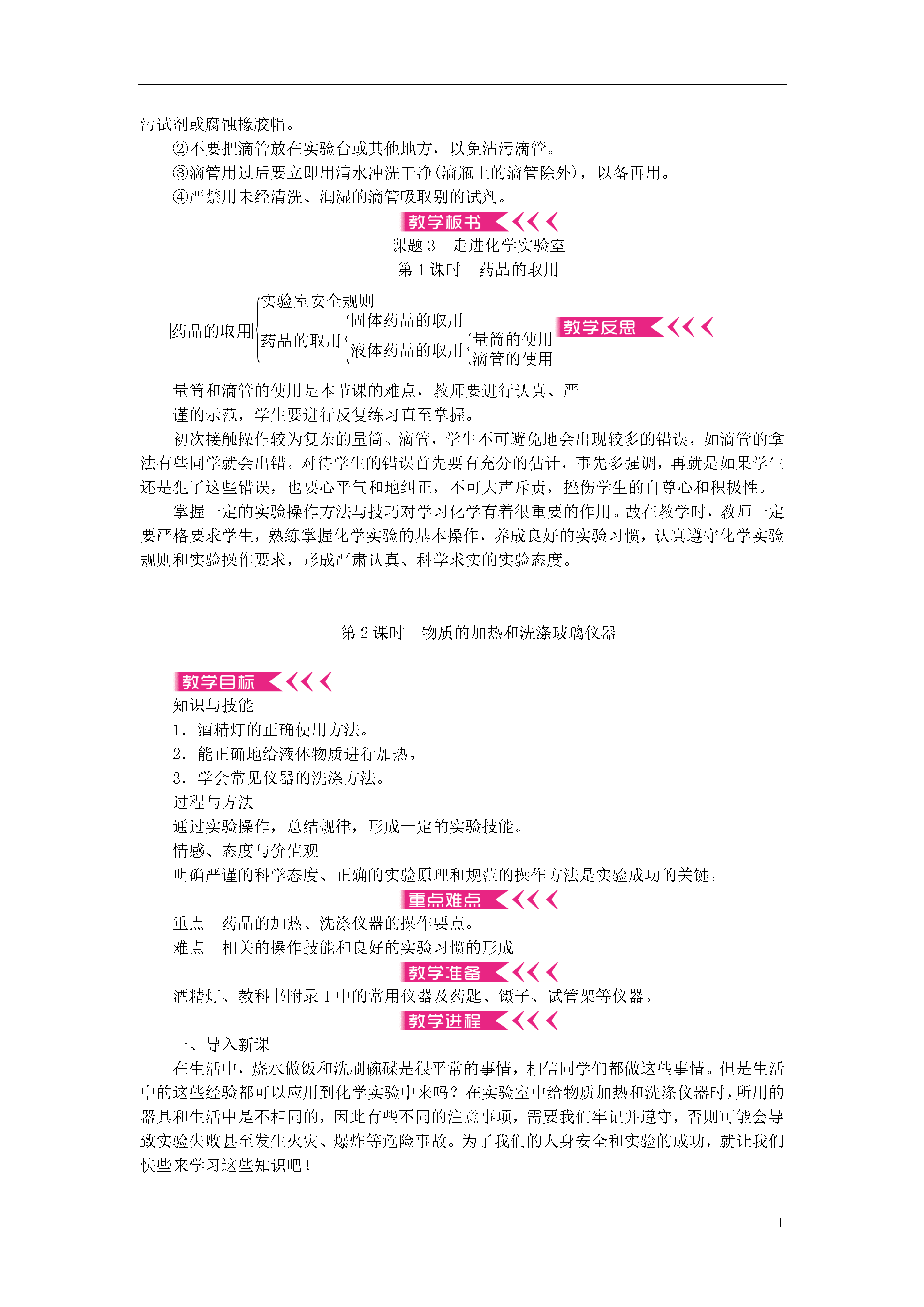 1第一单元走进化学世界本单元是学习化学的开端。学生在学习这门学科之前,虽然在日常生活中接触过,但对于化学及其特点和应用并不太熟悉,只是感性的、表面的认识。针对这一情况,教材编排了多种形式的活动,注重引导学生主动参与、积极思考、广泛交流,从一些生活中常见的、与化学有关的事实、现象出发,培养他们学习化学的兴趣,建立有关物质变化的基本概念,了解化学的研究内容、范围和特点,体会学习化学的过程和方法,并初步学会一些化学实验基本操作,为今后的学习打下夯实的基础。课题1物质的变化和性质知识与技