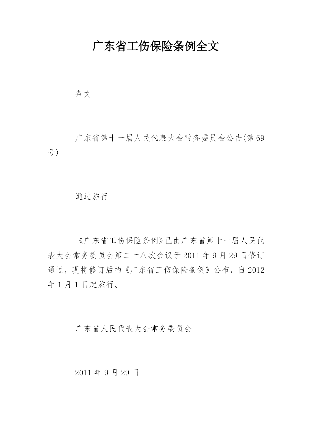 广东省工伤保险条例全文条文广东省第十一届人民代表大会常务委员会公告(第69号)通过施行《广东省工伤保险条例》已由广东省第十一届人民代表大会常务委员会第二十八次会议于2011年9月29日修订通过,现将修订后的《广东省工伤保险条例》公布,自2012年1月1日起施行。广东省人民代表大会常务委员会2011年9月29日广东省工伤保险条例第一章总则第1条为了保障因工作遭受事故伤害或者患职业病的职工获得医疗救治和经济补偿,促进工伤预防和职业康复,分散用人单位的工伤风险,根据《中华人民共和国社会保险法》、《工伤保险条例》