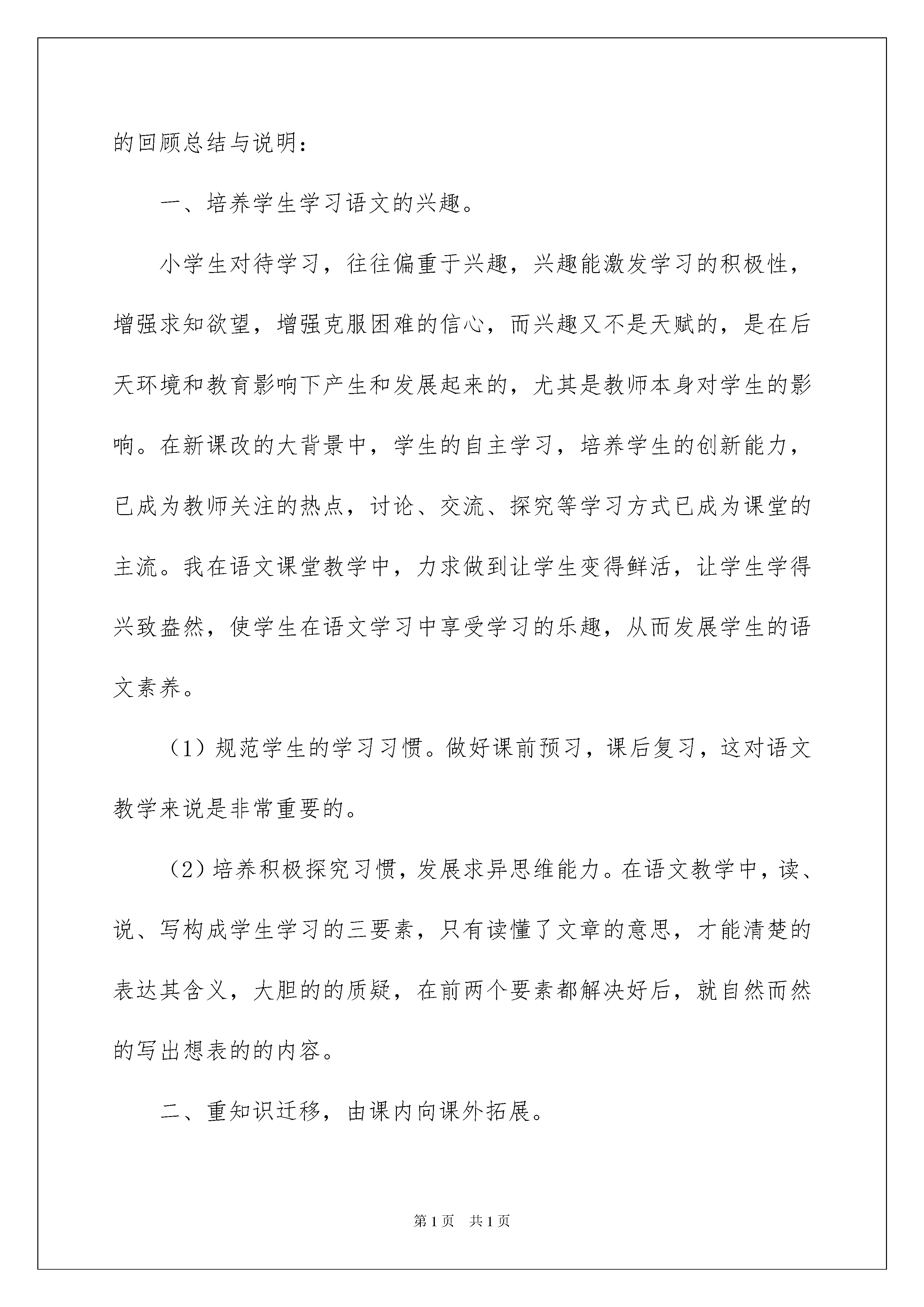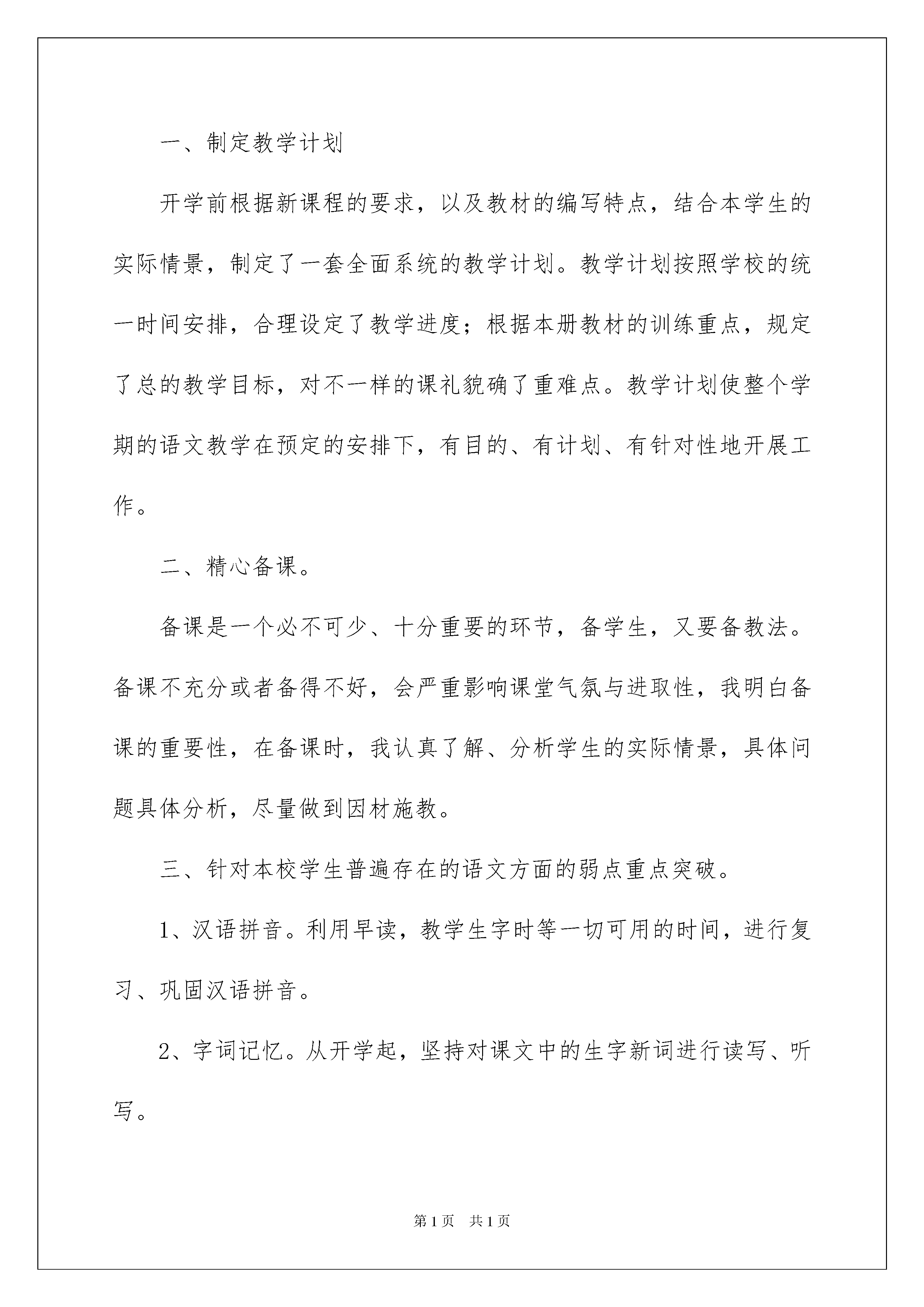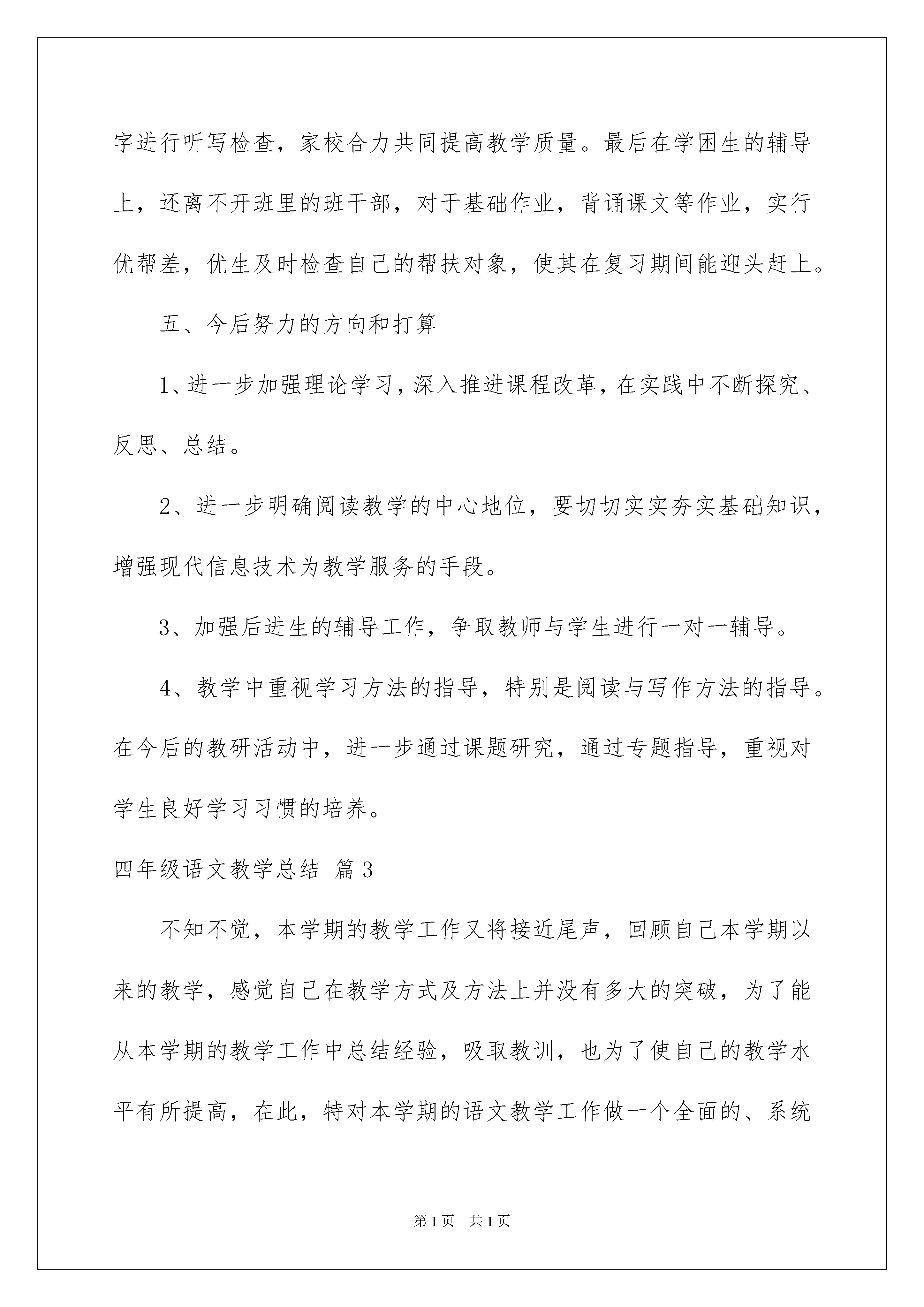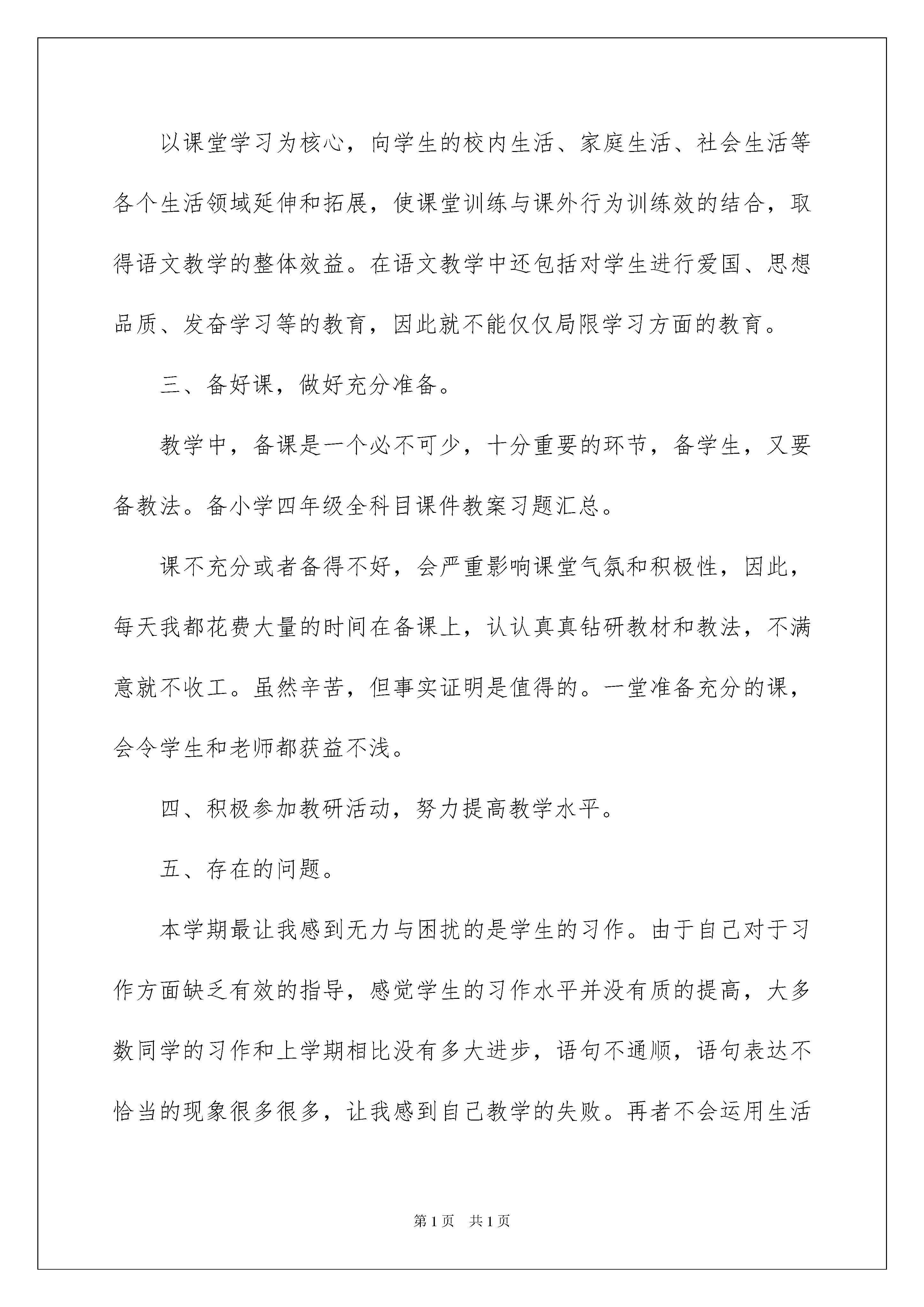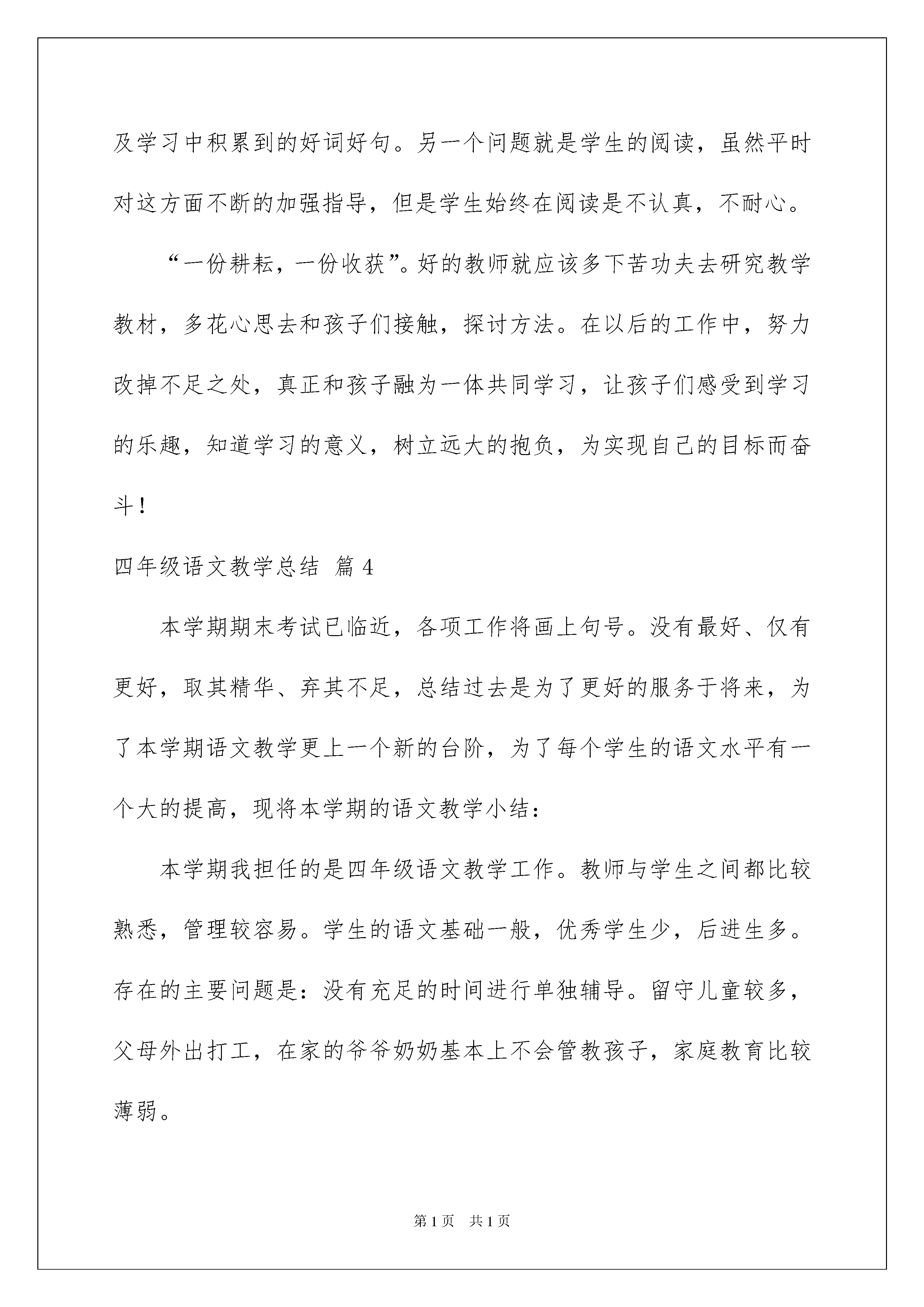 2022四年级语文教学总结模板汇总5篇四年级语文教学总结总结是对某一阶段的工作、学习或思想中的经验或情况进行分析研究的书面材料,它是增长才干的一种好办法,不如静下心来好好写写总结吧。总结怎么写才不会千篇一律呢?下面是我精心整理的四年级语文教学总结5篇,仅供参考,希望能够帮助到大家。四年级语文教学总结篇1对不同的课文明确了重难点。教学计划使整个学期的语文教学在预定的安排下,有目的、有计划、有针对性地开展工作。(二)、根据不同的课型,设计使用不同的教学方法。根据不同的课文类型,根据学生掌握知识的实际程度,安排了不同的教学方法。(三)、规范学生的学习习惯。正确的学习习惯的养成,有利于教学的实施,更有利于学生的学习。重点培养的学习习惯包括以下几方面:1、课前预习,课后复习。每天放学时都为学习布置具体预习任务,并适时教给学生预习的方法。新课授完,必要求复习。用小组长检查,教师抽捡的方法进行督促。通过一段时间,学生知道该如何预习了,也能自觉复习啦。2、正确的上课方法。“该说时就说,该听时就听,该写时就写”,认真听讲,积极思考。学会听课,学会做笔记。3、写工整字,做规范作业。强调文字书写的重要性,并适时进行写字训练与指导。统一规范作业格式。(四)、针对本校学生普遍存在的语文方面的弱点重点突破。1、汉语拼音。利用早读,教学生字时等一切可用的时间,进行复习、巩固汉语拼音。2、字词记忆。从开学起,坚持对课文中的生字新词进行读写、听写。3、课文朗读。课堂上用了大量的时间,对学生进行朗读训练与指导。4、阅读。从平时上课到考试,刻意让学生进行阅读的训练,多思考,多解决问题,提高阅读水平。5、积累引导孩子积累语言材料,开辟“日积月累”用来抄写成语,并进行听写巩固。利用书香园时间阅读课外书籍20xx年度四年级下册语文教学工作总结工作总结(五)、为了全面提高学生的语文综合素养,采用了一些个性化的方法。1、每位学生都有一本摘抄本,将所学课文,课外阅读中看到的优美词句,喜欢的古诗词,名言警句等进行摘抄记录。增加学生的语言积累。2、课前朗读古诗词积累成语。提高学生对古文化的感悟能力,并进行记忆积累。四年级语文教学总结篇2一个学期又过去了,时光太匆匆。在这个学期我担任四年级二班的语文教学工作,在教学中,我依据新课程标准的指导思想,认真落实课程标准,抓好教学常规工作,圆满完成了教学任务,为了能从本学期的教学工作中总结经验,吸取教训,也为了使自己的教学水平有所提高,在此,特对本学期的语文教学工作做一个全面的、系统的回顾总结:一、基本情况分析:经过三年半的学习强化与教育指导,四年级的绝大部分同学各项行为习惯已形成,大部分同学对语文学习有浓厚的兴趣,形成了学习语文的良好氛围。但仍有个别学生因基础差,与班级队伍有一定的差距,希望通过复习能尽量缩小差距,使班级总体成绩上一个新台阶。二、重视朗读品评感悟,让课堂教学“活”起来。小学语文课本中的每一篇课文都是文质兼美的佳作,其语境描述的美妙,语言运用的精妙,思想表达的深邃,见解阐述的独到,都是引导学生感悟的重要内容。而由于课堂教学时间的有限,课文中的精彩之处没有可能引导学生一一感悟。为了使这些精彩给学生留下整体印象,我们可以在阅读中抓重点,引导学生对语言文字反复诵读,以悟出语言丰富的形象内涵,意义内涵,情感内涵。同时,让学生在感悟的基础上,引导学生居高临下地对课文进行品评,在品评中深化理解,升华认识,填补空白。三、重知识迁移重课内外结合。以课堂学习为核心,能动地向学生的学校生活、家庭生活、社会生活等各个生活领域自然延伸和拓展,使课堂训练与课外行为训练形成有序、有趣、有力、有效的结合,取得语文教学的整体效益。有意让学生将课外学到的词语迁移到课堂学习中来,进行展示、交流,这是激发学生课外阅读兴趣的重要方法。也会大大激发学生在平时学习中养成随时积累的好习惯!让学生阅读大量的课外书;通过这些收集与阅读,为深入理解课文内容奠定了基础。为此我还特意和学生上了一堂语文综合实践活动课,让学生爱阅读、会阅读,在阅读中丰富知识。四、加强培优补差的工作,全面促进学生发展。为了促使每一位学生能在原有的基础上都有所发展,我着重“抓两头,带中间”。注重培养优生,同时,还在班级里开展“一帮一”的活动。激励学困生树立信心,做到课外辅导,课内多给他们创设机会,以此激起他们的学习兴趣。在班里掀起一股,先进帮后进,后进学先进,先进更先进的好的风气。这样,全班的.学习成绩都有所提高。同时做好家访工作,及时与家长联系,取得家长的支持,尤其是复习期间,能监督学生完成家庭作业,有能力的家长参与辅导,对学生的生字进行听写检查