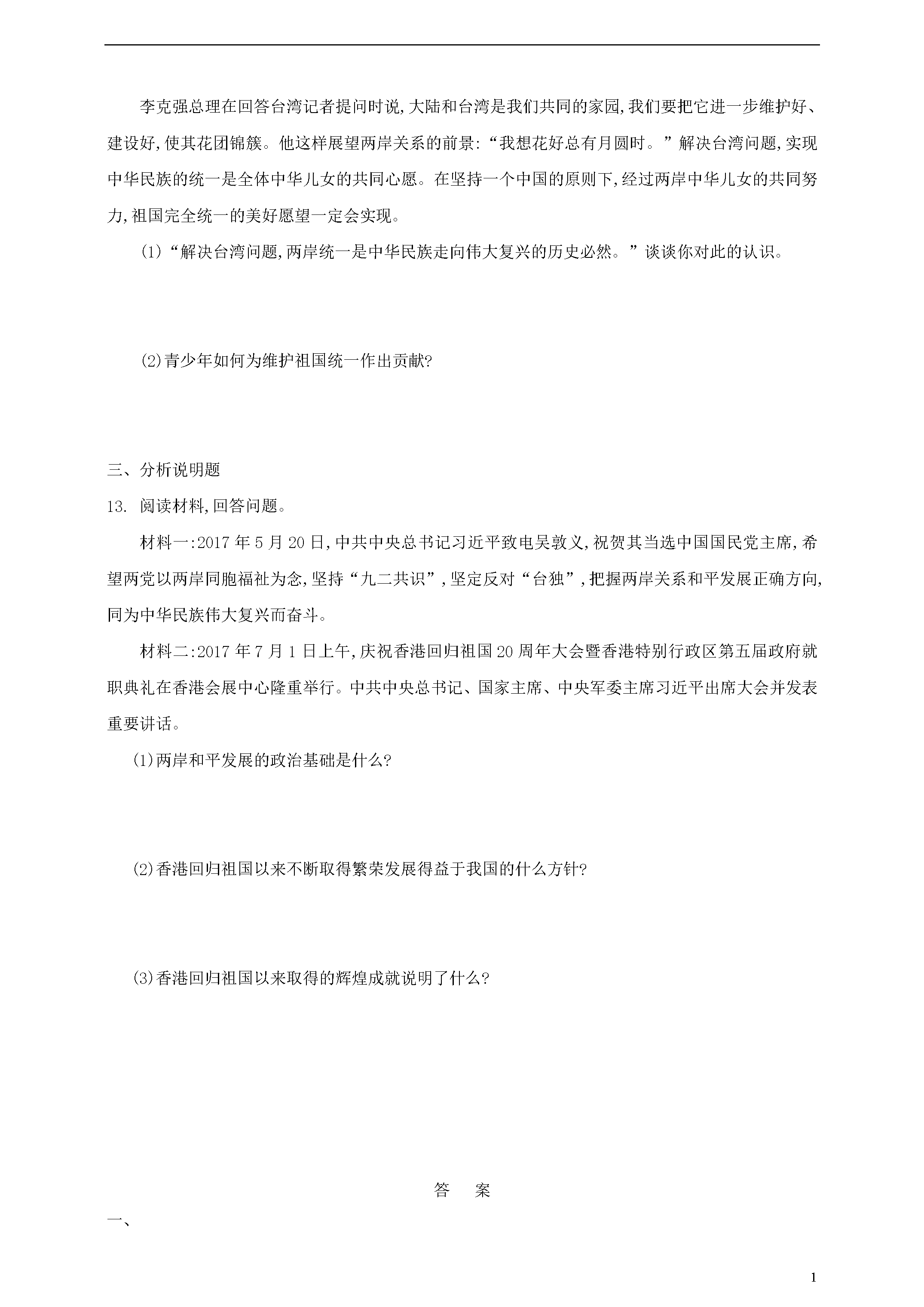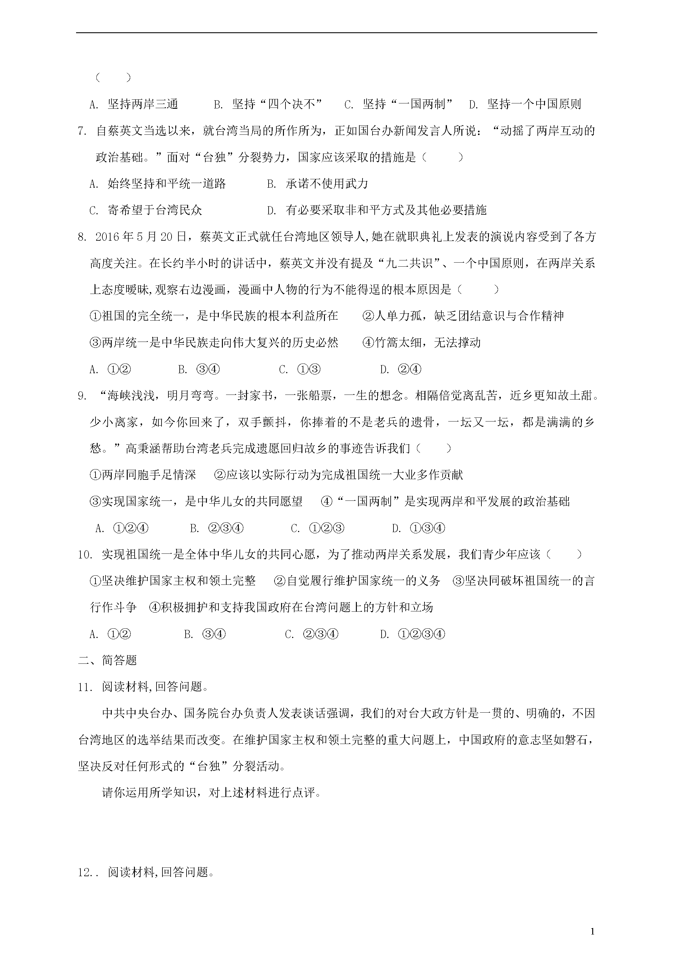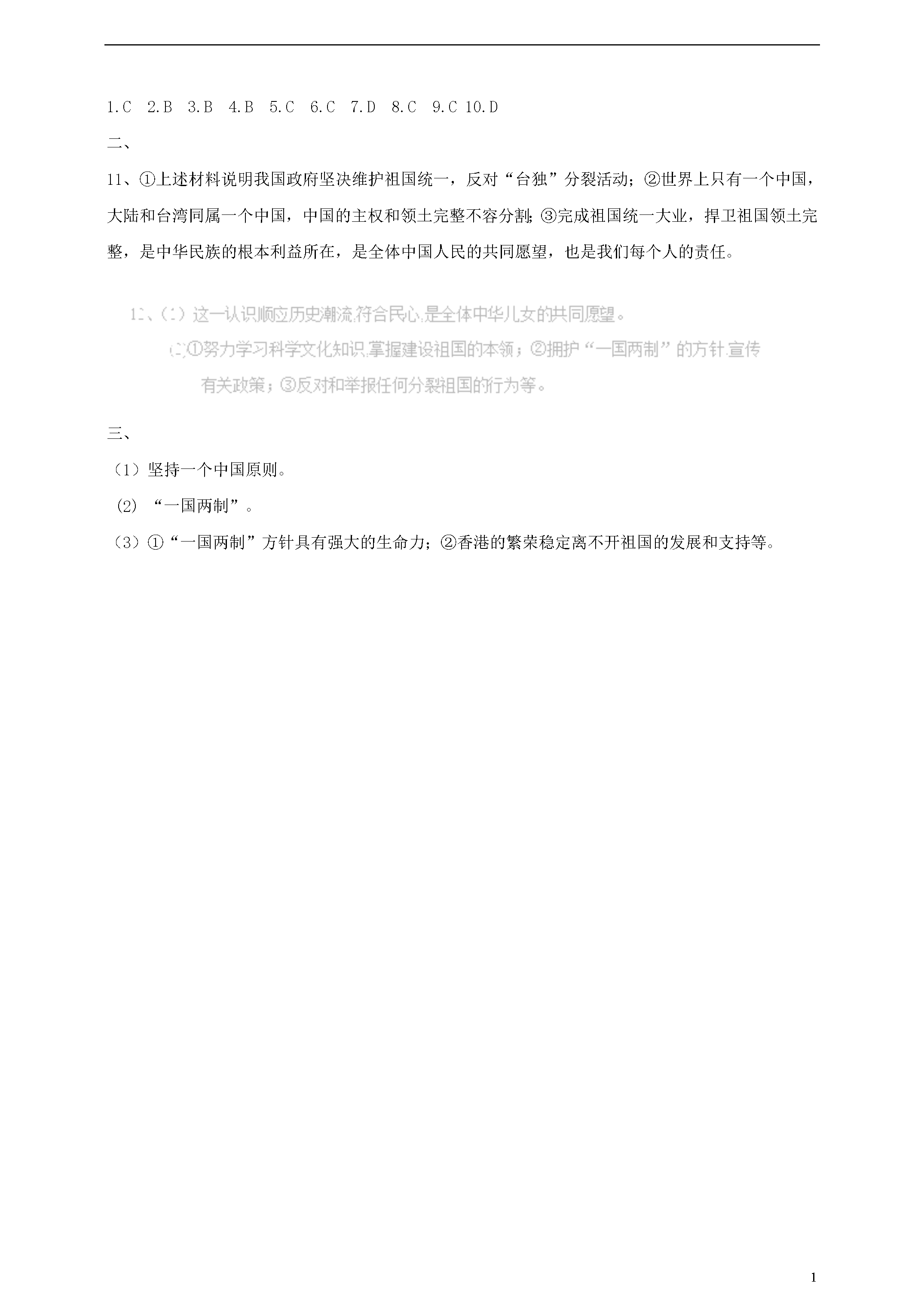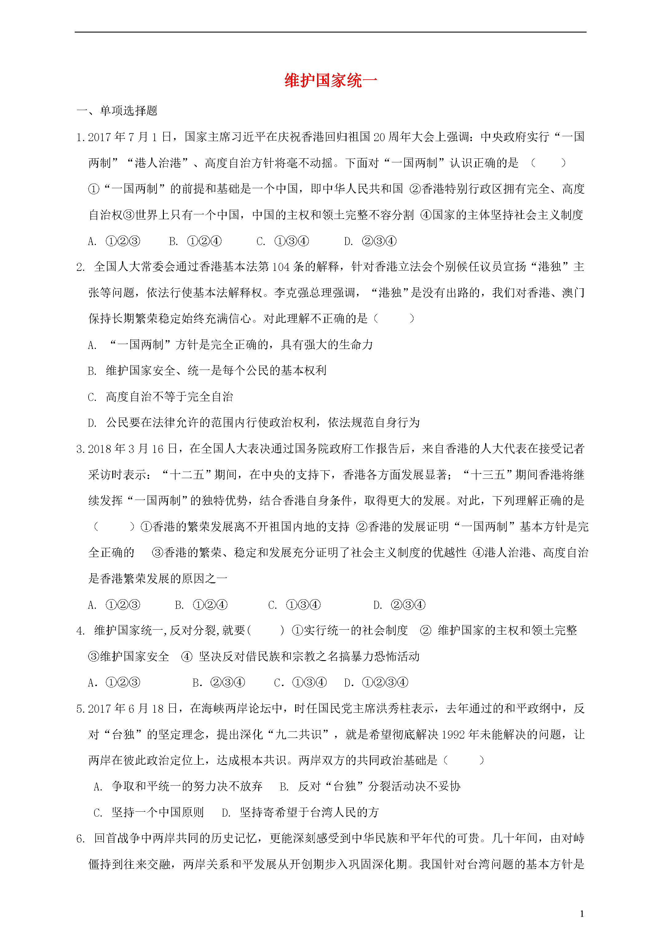 1维护国家统一一、单项选择题1.2017年7月1日,国家主席习近平在庆祝香港回归祖国20周年大会上强调:中央政府实行“一国两制”“港人治港”、高度自治方针将毫不动摇。下面对“一国两制”认识正确的是()①“一国两制”的前提和基础是一个中国,即中华人民共和国②香港特别行政区拥有完全、高度自治权③世界上只有一个中国,中国的主权和领土完整不容分割④国家的主体坚持社会主义制度A.①②③B.①②④C.①③④D.②③④2.全国人大常委会通过香港基本法第104条的解释,针对香港立法会个别候任议员宣扬“港独”主张等问题,依