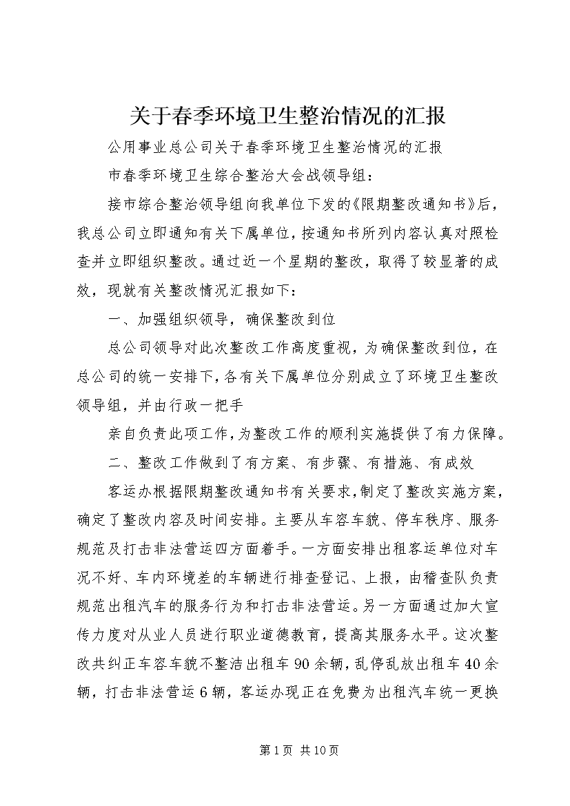 第PAGE\*Arabic\*MERGEFORMAT10页共NUMPAGES\*MERGEFORMAT10页关于春季环境卫生整治情况的汇报公用事业总公司关于春季环境卫生整治情况的汇报市春季环境卫生综合整治大会战领导组:接市综合整治领导组向我单位下发的《限期整改通知书》后,我总公司立即通知有关下属单位,按通知书所列内容认真对照检查并立即组织整改。通过近一个星期的整改,取得了较显著的成效,现就有关整改情况汇报如下:一、加强组织领导,确保整改到位总公司领导对此次整改工作高度重视,为确保整改到位,在总