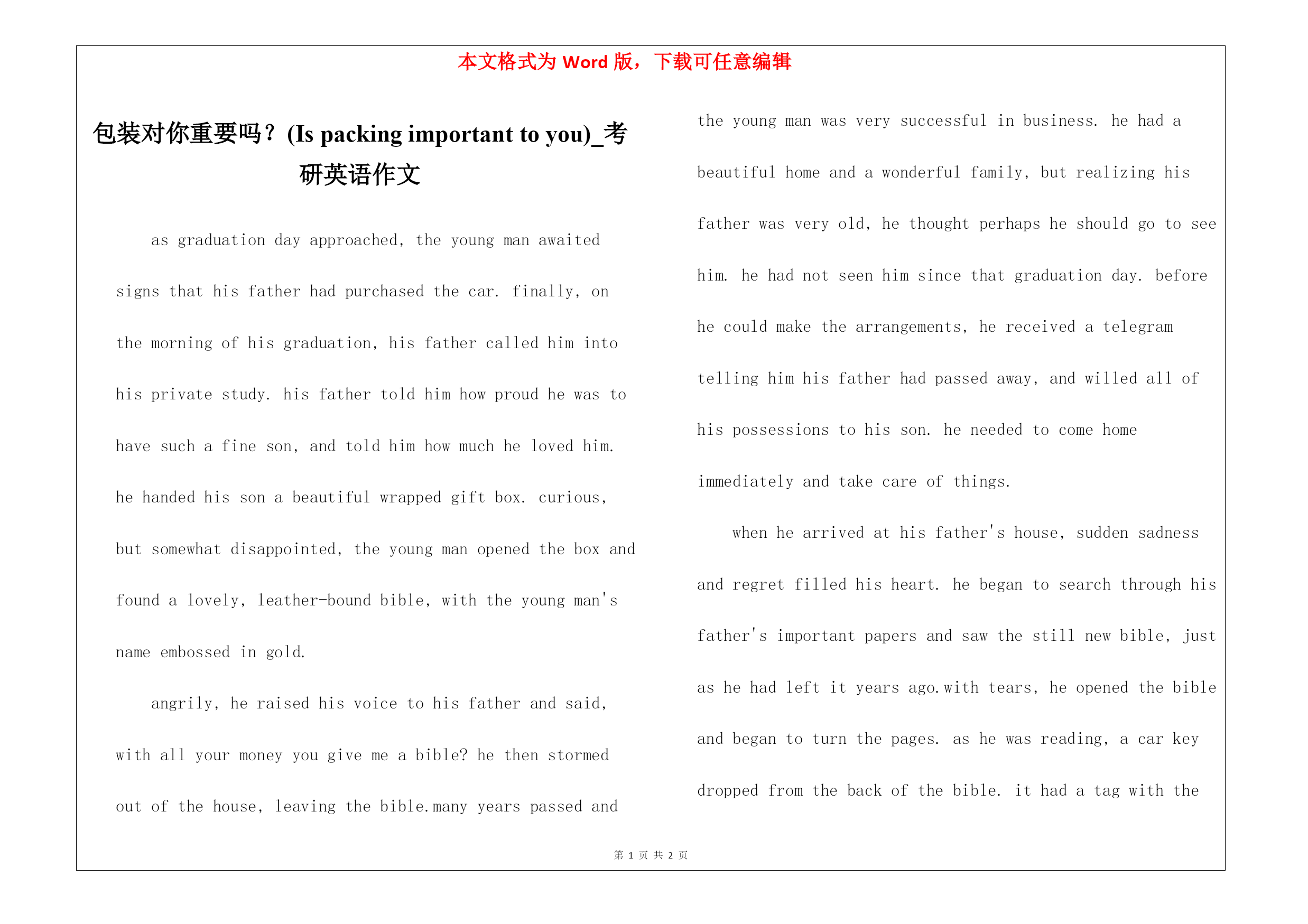 本文格式为Word版,下载可任意编辑第PAGE\*MERGEFORMAT2页共NUMPAGES\*MERGEFORMAT2页包装对你重要吗?(Ispackingimportanttoyou)_考研英语作文asgraduationdayapproached,theyoungmanawaitedsignsthathisfatherhadpurchasedthecar.finally,onthemorningofhisgraduation,hisfathercalledhimintohispriva