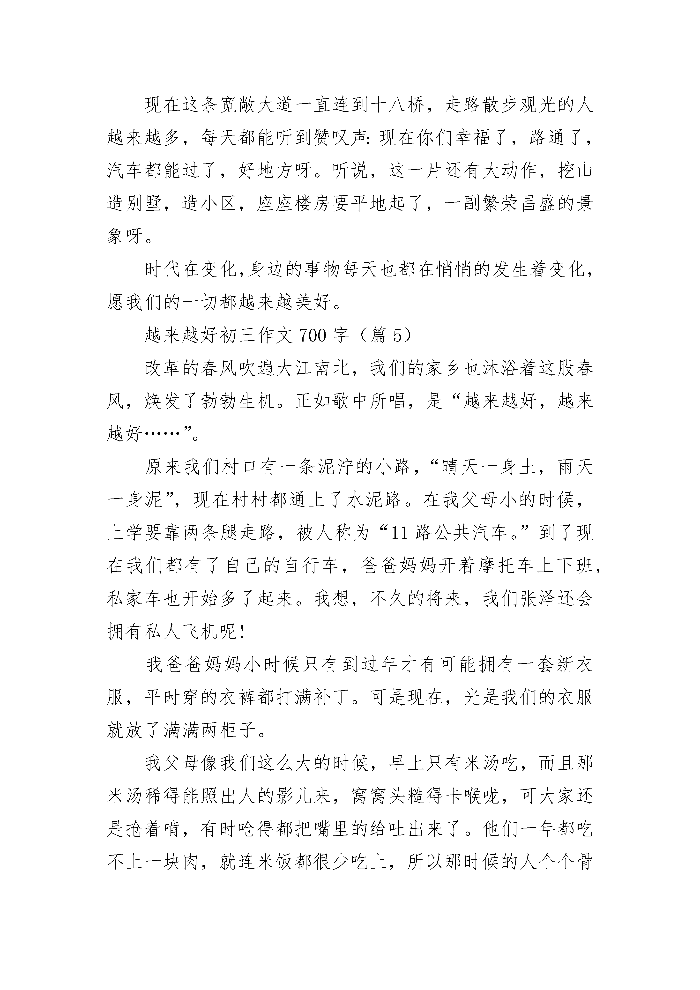 越来越好初三作文700字(精选5篇)越来越好初三作文700字(篇1)虽然就是大家都说着,过年是越来越没有年味儿了,甚至就连村里,都禁止放鞭炮,然后就是整个春节都过得比较安静吧!但是还想起整个,春节,以至于整个春节后的正月天,自己整个人心里还是挺开心的!而唯一开心的原因,就是自己今年实现了真正的正月里回娘家。想当初自己选择不顾一切,跟某人的时候,什么有想过自己的远嫁和别人有什么不一样?因为那个时候自己满脑子想的都是,现在交通都比较方便了,谁和谁想要见面也不过是一步之遥?可是等自己真正的结了婚之后才发现,