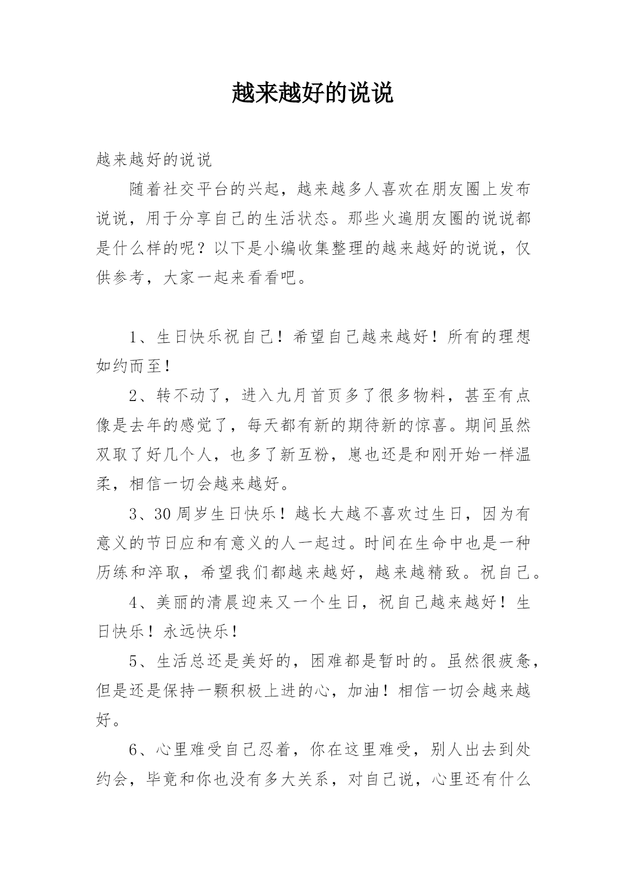 越来越好的说说越来越好的说说随着社交平台的兴起,越来越多人喜欢在朋友圈上发布说说,用于分享自己的生活状态。那些火遍朋友圈的说说都是什么样的呢?以下是小编收集整理的越来越好的说说,仅供参考,大家一起来看看吧。1、生日快乐祝自己!希望自己越来越好!所有的理想如约而至!2、转不动了,进入九月首页多了很多物料,甚至有点像是去年的感觉了,每天都有新的期待新的惊喜。期间虽然双取了好几个人,也多了新互粉,崽也还是和刚开始一样温柔,相信一切会越来越好。3、30周岁生日快乐!越长大越不喜欢过生日,因为有意义的节日应和有意义