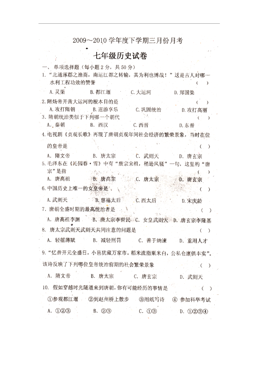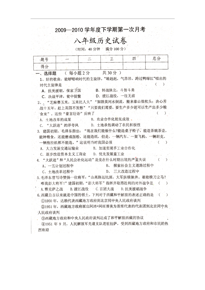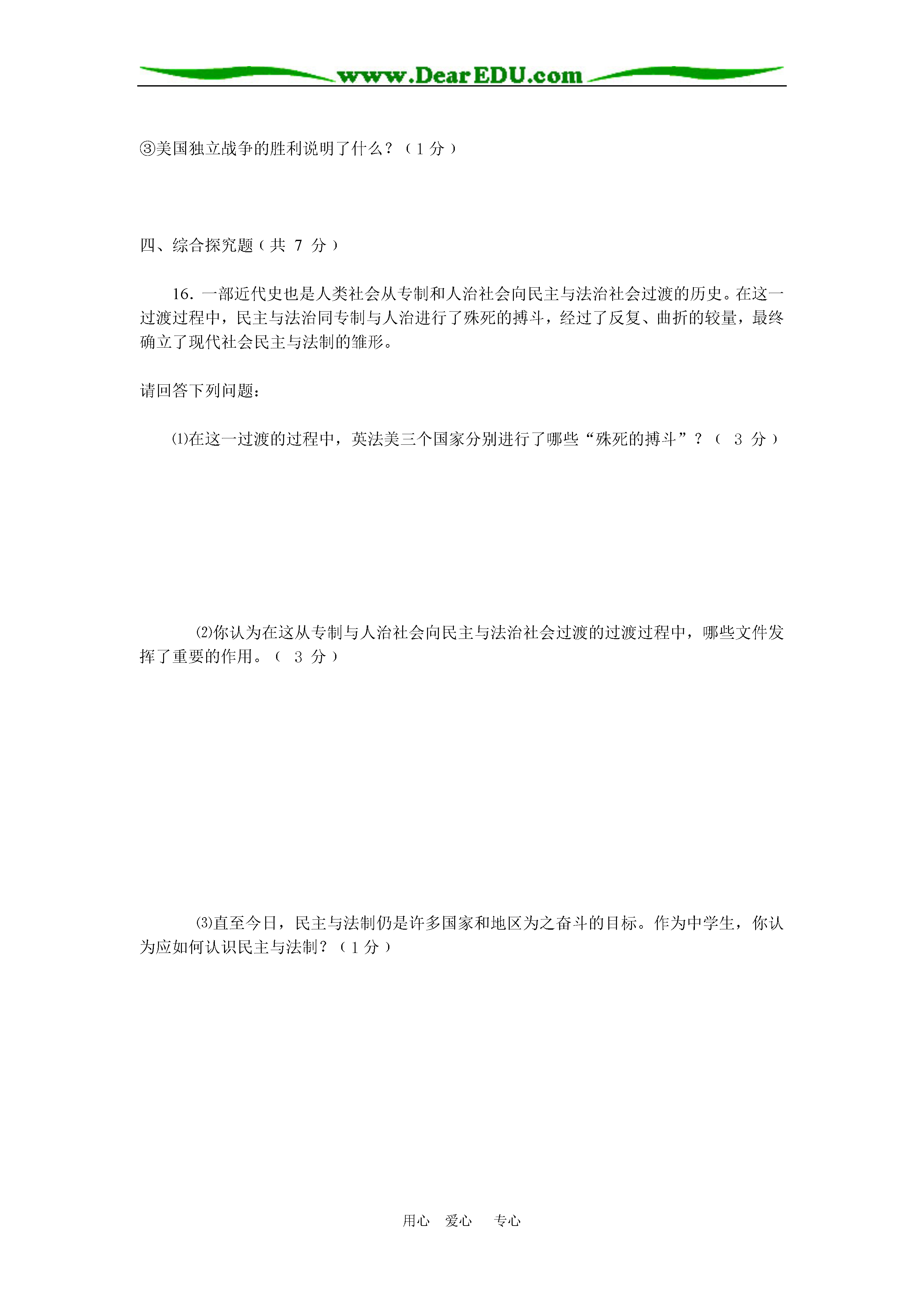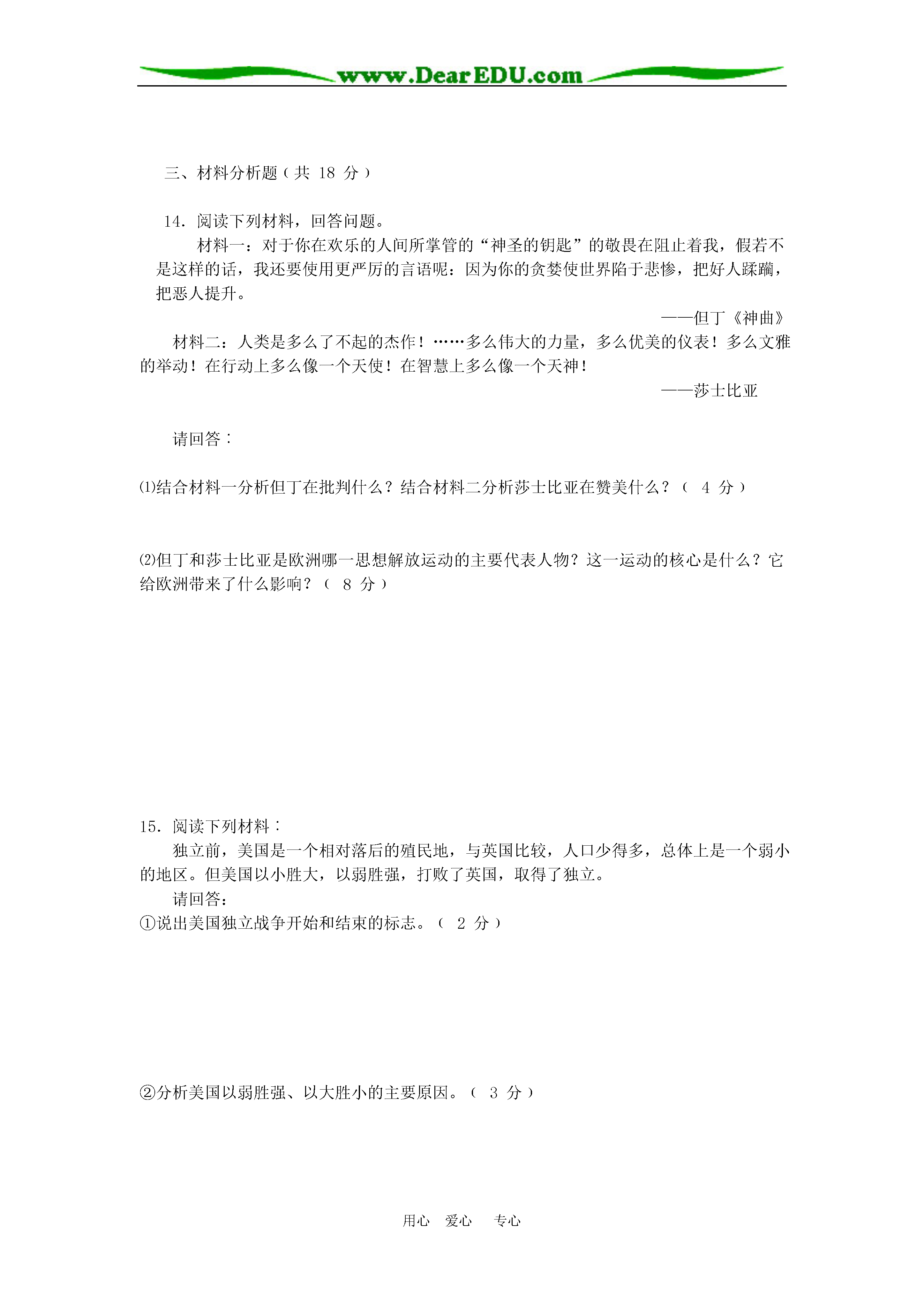 用心爱心专心初三年级上学期第一次月考历史试卷一、单项选择题﹙每小题1分,共15分﹚、1.文艺复兴的实质是﹙﹚A.人文主义的复兴B.古代希腊、罗马文化的复兴C.外来文化的影响D.资产阶级文化的兴起2.打破以往世界各地相互孤立和隔绝局面,世界开始连成一个整体的历史事件是﹙﹚A.文艺复兴B.新航路的开辟C.英国资产阶级革命D.经济全球化3.在今天的英国、荷兰、日本等资本主义国家仍保有国王或天皇的称号。这一现象与哪一部文献确立的政体有关﹙﹚A.《人权宣言》B.《独立宣言》C.《权利法案》D.《拿破仑法典》4.1689年英国议会通过《权利法案》,其重要意义在于﹙﹚A.使议会获得了自由选举国王的权利B.保障了资产阶级的权利C.废除了英国的君主制度D.为限制王权提供了宪法保障5.右图是美国的自由女神像。她右手高擎火炬,左手握着一块铭板,上面刻有日期:1776年7月4日。它所代表的是﹙﹚A.美国独立战争的开始时间B.《独立宣言》发表的时间C.萨拉托加战役的时间D.英国承认美国独立的时间6.7月14日被定为法国的国庆日,因为这一天是﹙﹚A.法国大革命的爆发B.《人权宣言》的发表C.法兰西第一共和国的建立D.资产阶级掌握了政权7.美国《独立宣言》与法国《人权宣言》思想主张的相同点是﹙﹚A.都主张君主立宪制政治体制B.都主张推翻殖民统治C.都主张推翻专制统治D.都主张自由平等8.拿破仑堪称一代枭雄,他对法国最大的贡献是﹙﹚A.率军打败了欧洲许多国家,扩张了法国领土B.处死了路易十六把法国大革命推向高潮C.确立了法国在欧洲大陆的霸主地位D.颁布《法典》,巩固了资产阶级统治秩序9.“当革命的风暴横扫整个法国的时候,英国正在进行着一场比较平静的但是威力并不因此减弱的变革。”恩格斯这段话肯定的是﹙﹚A.赞扬了法国大革命的作用B.肯定英国工业革命历史地位C.肯定英国资产阶级革命的作用D.谴责英国干涉法国革命10.“一百多年来,不同肤色的劳动者用不同的语言,用同样的旋律,唱着这同一首歌。”这首为了纪念巴黎公社,鼓舞无产阶级斗志所创作的歌曲是﹙﹚A.《英雄交响曲》B.《义勇军进行曲》C.《国际歌》D.《马塞曲》11.英国的《权利法案》、美国的《独立宣言》、法国的《人权宣言》相同点叙述,错误的是﹙﹚A.都建立了资产阶级领导的共和国B.都是早期资产阶级革命的成果C.都强调保护人的自由和民主权利,反对封建专制统治D.都对本国及西方世界民主政治的发展产生了重大而深远的影响12.人文主义思想,对社会进步起了巨大的推动作用,主要体现在﹙﹚A.把人性从宗教束缚中解放出来B.为欧美资产阶级革命做了思想准备C.为资本主义确立了一套政治构想D.为资产阶级掌握政权做了舆论准备13.与1787年美国宪法有关的内容是﹙﹚A.美国是一个联邦国家B.美国实行总统制C.总统既是国家元首,又是政府首脑D.华盛顿当选为第一任总统14.某校准备举办“第一次工业革命成果图片展”,下列可供选用的有﹙﹚①电子计算机②珍妮机③汽车④“旅行者号”火车机车A.①②B.①③C.③④D.②④15.无产阶级建立政权的第一次伟大尝试发生于﹙﹚A.法国B.中国C.俄国D.苏联二、归纳列举题﹙共20分﹚11.文化是人类文明的重要组成部分,优秀的文化产品,是全人类共同的财富。根据提示写出下列内容。﹙5分﹚⑴.古代苏美尔人使用的文字——⑵.伊斯兰教的创立人——⑶.杠杆定律和浮力定律的发现者——⑷.阿拉伯民间故事集——⑸.莎士比亚的代表作——12.根据下列提示写出对应的历史人物。﹙5分﹚⑴.发现“新大陆”的意大利航海家——⑵.英国共和国时期的“护国主”——⑶.法兰西第一帝国的皇帝——⑷.美国第一任总统——⑸.工业革命中取得划时代成就的发明家——13.根据下列提示写出相对应的标志性历史事件。﹙10分﹚⑴.英国资产阶级和新贵族的统治确立——⑵.美国独立战争的转折点——⑶.法国大革命的高潮——⑷.拿破仑帝国由盛转衰的转折点——⑸.工业革命的起点——三、材料分析题﹙共18分﹚14.阅读下列材料,回答问题。材料一:对于你在欢乐的人间所掌管的“神圣的钥匙”的敬畏在阻止着我,假若不是这样的话,我还要使用更严厉的言语呢:因为你的贪婪使世界陷于悲惨,把好人蹂躏,把恶人提升。——但丁《神曲》材料二:人类是多么了不起的杰作!……多么伟大的力量,多么优美的仪表!多么文雅的举动!在行动上多么像一个天使!在智慧上多么像一个天神!——莎士比亚请回答︰⑴结合材料一分析但丁在批判什么?结合材料二分析莎士比亚在赞美什么?﹙4分﹚⑵但丁和莎士比亚是欧洲哪一思想解放运动的主要代表人物?这一运动的核心是什么?它给欧洲带来了什么影响?﹙8分﹚15.阅读下列材料︰独立前,美国是一个相对落后的殖民地,与英国比较,人口少得多,总体上是一个弱小的地区。但美国以小胜大,以弱胜强,打