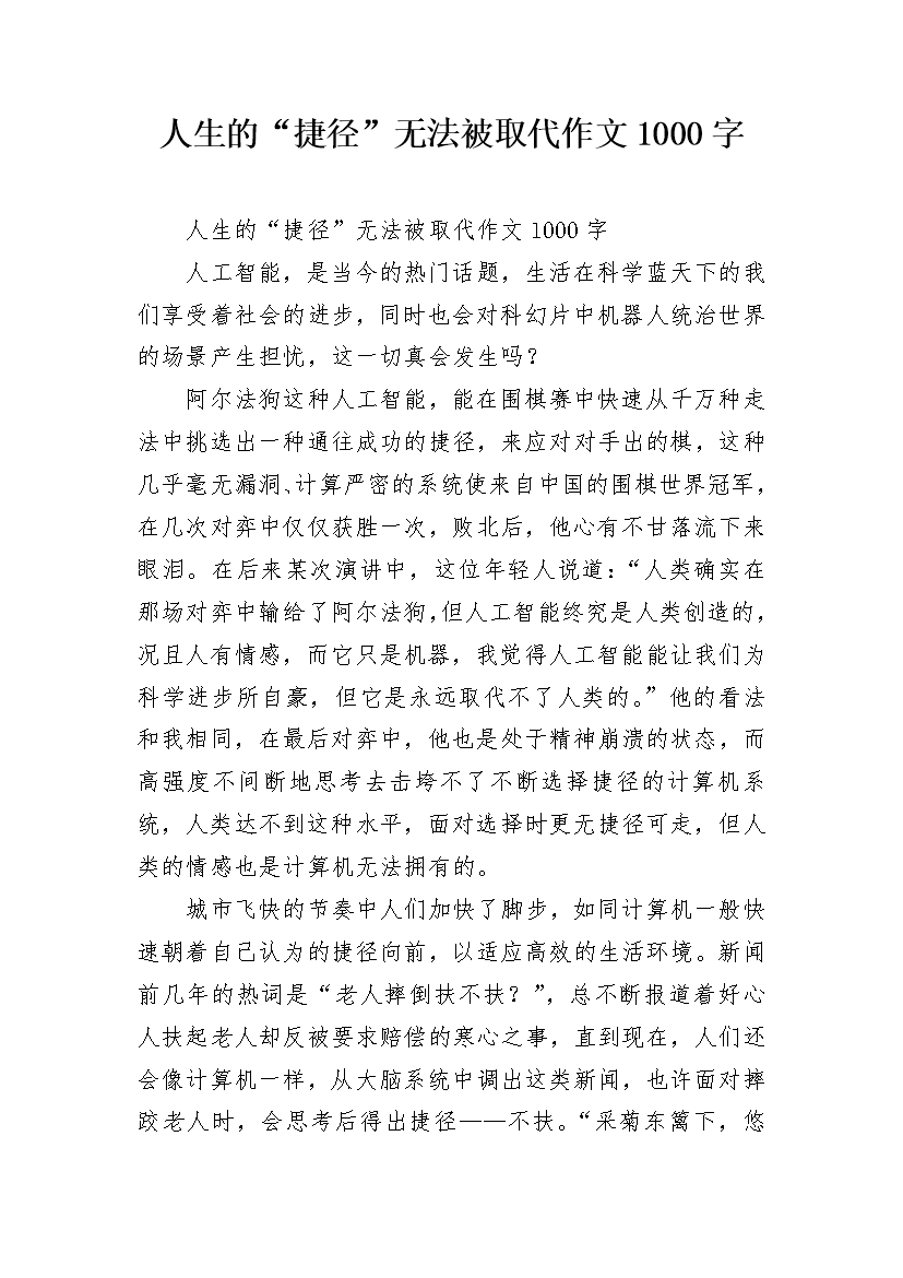 人生的“捷径”无法被取代作文无论在学习、工作或是生活中,大家都尝试过写作文吧,作文是从内部言语向外部言语的过渡,即从经过压缩的简要的、自己能明白的语言,向开展的、具有规范语法结构的、能为他人所理解的外部语言形式的转化。那么问题来了,到底应如何写一篇优秀的作文呢?下面是小编收集整理的人生的“捷径”无法被取代作文,仅供参考,欢迎大家阅读。人工智能,是当今的热门话题,生活在科学蓝天下的我们享受着社会的进步,同时也会对科幻片中机器人统治世界的场景产生担忧,这一切真会发生吗?阿尔法狗这种人工智能,能在围棋赛中快速从