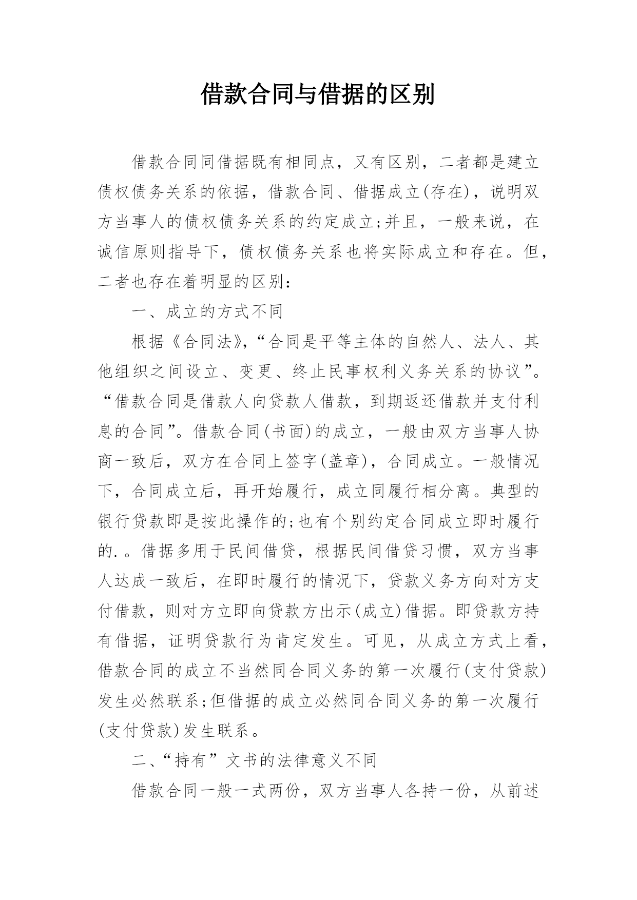借款合同与借据的区别一、成立的方式不同根据合同法,“合同是平等主体的自然人、法人、其他组织之间设立、变更、终止民事权利义务关系的协议”。“借款合同是借款人向贷款人借款,到期返还借款并支付利息的合同”。借款合同(书面)的成立,一般由双方当事人协商一致后,双方在合同上签字(盖章),合同成立。一般情况下,合同成立后,再开始履行,成立同履行相分离。典型的银行贷款即是按此操作的;也有个别约定合同成立即时履行的。借据多用于民间借贷,根据民间借贷习惯,双方当事人达成一致后,在即时履行的情况下,贷款义务方向对方支付借款,
